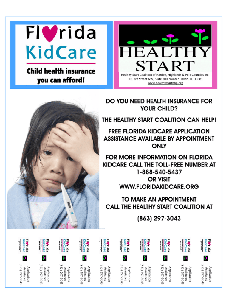 Healthy Start Coalition of Hardee, Highlands & Polk Counties Inc. 301 3rd Street NW, Suite 200, Winter Haven, FL 33881 www.healthystarthhp.org DO YOU NEED HEALTH INSURANCE FOR YOUR CHILD? THE HEALTHY START COALITION CAN HELP! FREE FLORIDA KIDCARE APPLICATION ASSISTANCE AVAILABLE BY APPOINTMENT ONLY FOR MORE INFORMATION ON FLORIDA KIDCARE CALL THE TOLL-FREE NUMBER AT 1-888-540-5437 OR VISIT WWW.FLORIDAKIDCARE.ORG TO MAKE AN APPOINTMENT CALL THE HEALTHY START COALITION AT (863) 297-3043 Application Assistance (863) 297-3043 Application Assistance (863) 297-3043 Application Assistance (863) 297-3043 Application Assistance (863) 297-3043 Application Assistance (863) 297-3043 Application Assistance (863) 297-3043 Application Assistance (863) 297-3043 Application Assistance (863) 297-3043 Application Assistance (863) 297-3043 Application Assistance (863) 297-3043