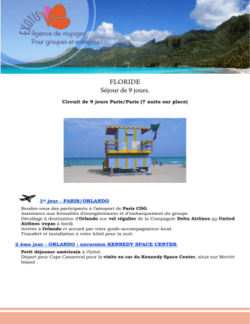 FLORIDE Séjour de 9 jours. Circuit de 9 jours Paris/Paris (7 nuits sur place) 1er jour - PARIS/ORLANDO Rendez-vous des participants à l’aéroport de Paris CDG. Assistance aux formalités d’enregistrement et d’embarquement du groupe Décollage à destination d’Orlando sur vol régulier de la Compagnie Delta Airlines ou United Airlines (repas à bord) Arrivée à Orlando et accueil par votre guide-accompagnateur local. Transfert et installation à votre hôtel pour la nuit. 2 ème jour - ORLANDO : excursion KENNEDY SPACE CENTER Petit déjeuner américain à l’hôtel. Départ pour Cape Canaveral pour la visite en car du Kennedy Space Center, situé sur Merritt Island : Découverte d’une salle de contrôle, du bâtiment d’assemblage de la navette, du véhicule à chenilles qui la transporte, des pas de tirs, de la fusée Saturn 5, des vaisseaux qui ont voyagé à travers l’espace et, plus particulièrement, les engins désormais légendaires qui ont parcouru la Lune, des salles de formation des équipages d’astronautes… Ce grand musée de l’espace à ciel ouvert vous mettra en contact direct avec les engins spatiaux qui ont fait la légende des astronautes. Vous assisterez ensuite à la projection du film de la conquête de l’espace sur un écran géant IMAX au Galaxy Center. Déjeuner libre. Retour à Orlando pour le dîner et la nuit. 3 ème jour - ORLANDO : excursion UNIVERSAL STUDIOS Petit déjeuner américain à l’hôtel. Journée consacrée à la visite des «Universal Studios», les plus grands studios cinématographiques du monde. Partez à la découverte des studios à bord d’un petit tram. Une visite absolument fascinante qui vous fera entrer dans l’action de vos films favoris tels que Twister, King Kong, Jurassic Park, E.T, Terminator , Les Dents de la Mer, Retour vers le Futur, Men in Black… et revivre leurs moments les plus spectaculaires. Les trucages, plateaux et effets spéciaux hollywoodiens n’auront plus aucun secret pour vous. Déjeuner sous forme de coupons dans le parc En milieu d’après-midi, transfert dans un centre commercial pour deux heures de shopping avant le retour à l’hôtel. Dîner libre Nuit à l’hôtel. 4 ème jour - ORLANDO/TAMPA / FORT MYERS Petit déjeuner américain à l’hôtel. Route vers le Golfe du Mexique pour Fort Myers en passant par Tampa, important port de pêche, de commerce et de plaisance au fond d’une vaste baie où se jette Hillsborough River. Déjeuner libre. Puis continuation vers Fort Myers, » la ville des palmiers », pour la visite des maisons Ford et Edison. Thomas Edison s’installa en Floride du sud pour des raisons de santé. Il y vécut jusqu’à l’âge de 84 ans. Au cours des 46 hivers qu’il passa à Fort Myers, il reçut des invités prestigieux tels que Harvey Firestone, le naturaliste John Burrough, le futur président des Etats-Unis Herbert Hoover, ainsi que son collègue et grand ami Henri Ford, qui possédait lui aussi un domaine à Fort Myers, «Mangoes». Ford acheta cette maison pittoresque en 1916 afin d’habiter près de son ami Edison durant les mois d’hiver. Les deux propriétés sont séparées par une barrière que les deux familles avaient surnommé le «mur de l’amitié». Installation à l’hôtel Dîner et nuit à l’hôtel à Fort Myers. 5 ème jour – FORT MYERS / EVERGLADES / KEY WEST Petit déjeuner continental à l’hôtel. Tôt le matin, départ via la traversée de Tamiami Trail pour la découverte de l’étonnant et mystérieux marais tropical des Everglades à la végétation luxuriante. Il protège un des écosystèmes les plus fragiles de la planète. Des espèces animales comme les alligators et de nombreuses espèces d’oiseaux, et d’insectes que l’on ne trouve nulle part ailleurs peuplent le parc. Tour en airboats, étonnants bateaux propulsés par une hélice d’avion permettant de sillonner les canaux, mais en dehors des frontières du parc national seulement: ils sont trop bruyants. Visite d’une ferme d’alligators. Déjeuner libre. Départ via l’impressionnant Overseas Highway pour une journée d’excursion sur les Florida Keys (de l’espagnol «cayo» : écueils), une chaine longue de 176 km d’iles de corails de différentes grandeurs, reliées par plus de 40 ponts (11 km pour le plus long) en pleine mer des Antilles, avec Cuba à un peu plus de 150 km. Jusqu’à l’ouragan destructeur de 1926, ces îles étaient reliées entre elles par une voie ferrée qui allait jusqu’à Key West qui est le point le plus méridional des Etats-Unis continentaux. Arrêt à Key Largo avant de continuer vers Key West, l’île la plus au sud qui fut jadis un nid de pirates mal famé et a su garder son aspect colonial avec ses maisons de bois. L’écrivain Hemingway y vécut pendant les années 1930-40 et sa maison a été transformée en musée. Le peintre naturaliste Audubon, qui y débarqua en 1832 à la recherche de ses modèles d’oiseaux, y vécut aussi. Installation à l’hôtel Diner et nuit à l’hôtel. 6 ème jour – KEY WEST / MIAMI Petit déjeuner continental à l’hôtel. Le matin, temps libre pour profiter de Key West. Déjeuner libre. Retour vers Miami. Installation à l’hôtel Temps libre pour découvrir Miami Beach. Profitez-en pour contempler le quartier Art Déco (Art Deco District), construit au cours du premier tiers du XXème siècle avec des bâtiments aux couleurs pastel, ou la plage, l’une des plus belles e des plus célèbres des Etats-Unis. Dîner et nuit à l’hôtel à Miami Beach. 7 ème jour - MIAMI Petit déjeuner continental à l’hôtel. Départ vers le centre de Miami pour une visite guidée panoramique de Miami avec entre autres son quartier le plus résidentiel de Coral Gables et Coconut Grove, un faubourg décontracté, rendez-vous de nombreux artistes. Cette métropole fascinante est aussi la ville la plus hispanique du pays, une des plus grandes par sa superficie, divisée en deu