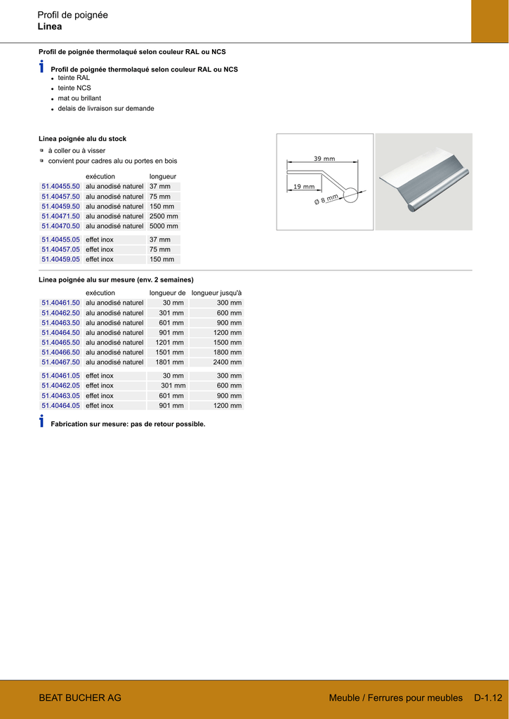 Profil de poignée Linea Profil de poignée thermolaqué selon couleur RAL ou NCS Profil de poignée thermolaqué selon couleur RAL ou NCS • teinte RAL • teinte NCS • mat ou brillant • delais de livraison sur demande Linea poignée alu du stock à coller ou à visser convient pour cadres alu ou portes en bois 51.40455.50 51.40457.50 51.40459.50 51.40471.50 51.40470.50 exécution alu anodisé naturel alu anodisé naturel alu anodisé naturel alu anodisé naturel alu anodisé naturel 51.40455.05 effet inox 51.40457.05 effet inox 51.40459.05 effet inox longueur 37 mm 75 mm 150 mm 2500 mm 5000 mm 37 mm 75 mm 150 mm Linea poignée alu sur mesure (env. 2 semaines) 51.40461.50 51.40462.50 51.40463.50 51.40464.50 51.40465.50 51.40466.50 51.40467.50 exécution longueur de longueur jusqu'à alu anodisé naturel 30 mm 300 mm alu anodisé naturel 301 mm 600 mm alu anodisé naturel 601 mm 900 mm alu anodisé naturel 901 mm 1200 mm alu anodisé naturel 1201 mm 1500 mm alu anodisé naturel 1501 mm 1800 mm alu anodisé naturel 1801 mm 2400 mm 51.40461.05 51.40462.05 51.40463.05 51.40464.05 effet inox effet inox effet inox effet inox 30 mm 301 mm 601 mm 901 mm 300 mm 600 mm 900 mm 1200 mm Fabrication sur mesure: pas de retour possible. BEAT BUCHER AG Meuble / Ferrures pour meubles D-1.12