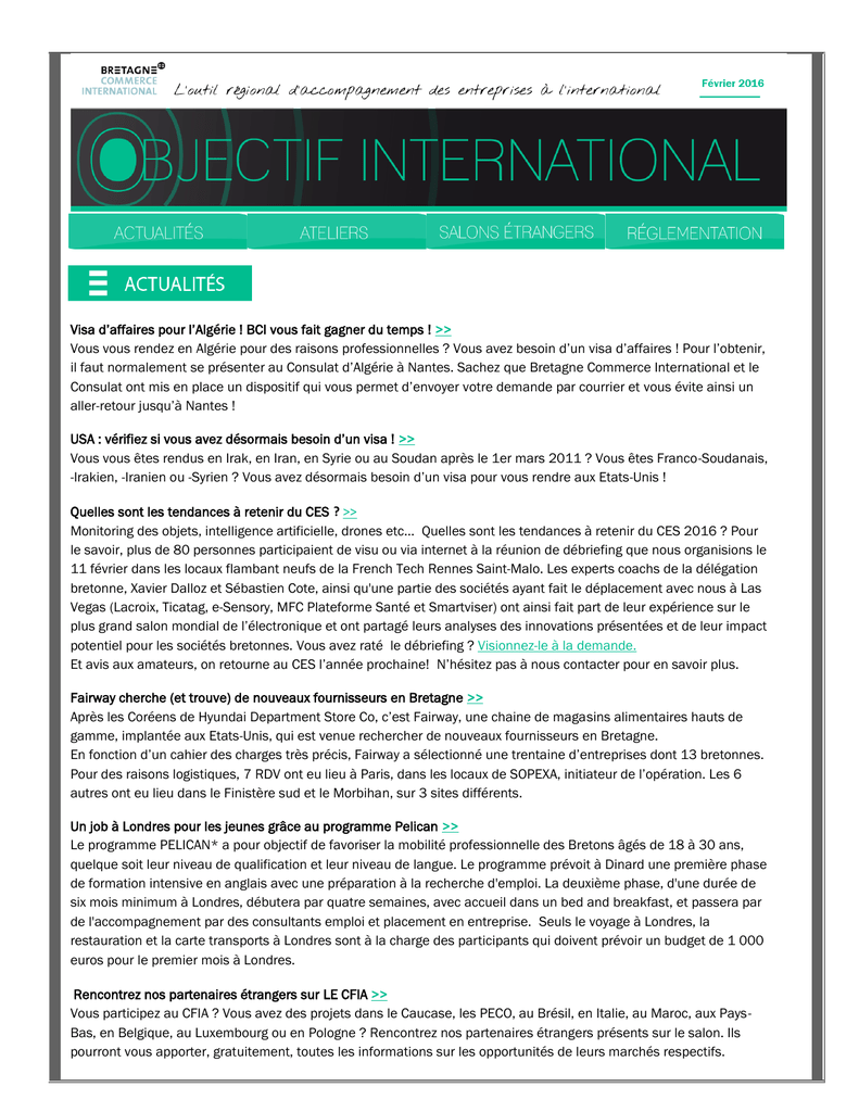 Visa d’affaires pour l’Algérie ! BCI vous fait gagner du temps ! >> Vous vous rendez en Algérie pour des raisons professionnelles ? Vous avez besoin d’un visa d’affaires ! Pour l’obtenir, il faut normalement se présenter au Consulat d’Algérie à Nantes. Sachez que Bretagne Commerce International et le Consulat ont mis en place un dispositif qui vous permet d’envoyer votre demande par courrier et vous évite ainsi un aller-retour jusqu’à Nantes ! USA : vérifiez si vous avez désormais besoin d’un visa ! >> Vous vous êtes rendus en Irak, en Iran, en Syrie ou au Soudan après le 1er mars 2011 ? Vous êtes Franco-Soudanais, -Irakien, -Iranien ou -Syrien ? Vous avez désormais besoin d’un visa pour vous rendre aux Etats-Unis ! Quelles sont les tendances à retenir du CES ? >> Monitoring des objets, intelligence artificielle, drones etc… Quelles sont les tendances à retenir du CES 2016 ? Pour le savoir, plus de 80 personnes participaient de visu ou via internet à la réunion de débriefing que nous organisions le 11 février dans les locaux flambant neufs de la French Tech Rennes Saint-Malo. Les experts coachs de la délégation bretonne, Xavier Dalloz et Sébastien Cote, ainsi qu'une partie des sociétés ayant fait le déplacement avec nous à Las Vegas (Lacroix, Ticatag, e-Sensory, MFC Plateforme Santé et Smartviser) ont ainsi fait part de leur expérience sur le plus grand salon mondial de l’électronique et ont partagé leurs analyses des innovations présentées et de leur impact potentiel pour les sociétés bretonnes. Vous avez raté le débriefing ? Visionnez-le à la demande. Et avis aux amateurs, on retourne au CES l’année prochaine! N’hésitez pas à nous contacter pour en savoir plus. Fairway cherche (et trouve) de nouveaux fournisseurs en Bretagne >> Après les Coréens de Hyundai Department Store Co, c’est Fairway, une chaine de magasins alimentaires hauts de gamme, implantée aux Etats-Unis, qui est venue rechercher de nouveaux fournisseurs en Bretagne. En fonction d’un cahier des charges très précis, Fairway a sélectionné une trentaine d’entreprises dont 13 bretonnes. Pour des raisons logistiques, 7 RDV ont eu lieu à Paris, dans les locaux de SOPEXA, initiateur de l’opération. Les 6 autres ont eu lieu dans le Finistère sud et le Morbihan, sur 3 sites différents. Un job à Londres pour les jeunes grâce au programme Pelican >> Le programme PELICAN* a pour objectif de favoriser la mobilité professionnelle des Bretons âgés de 18 à 30 ans, quelque soit leur niveau de qualification et leur niveau de langue. Le programme prévoit à Dinard une première phase de formation intensive en anglais avec une préparation à la recherche d'emploi. La deuxième phase, d'une durée de six mois minimum à Londres, débutera par quatre semaines, avec accueil dans un bed and breakfast, et passera par de l'accompagnement par des consultants emploi et placement en entreprise. Seuls le voyage à Londres, la restauration et la carte transports à Londres sont à la charge des participants qui doivent prévoir un budget de 1 000 euros pour le premier mois à Londres. Rencontrez nos partenaires étrangers sur LE CFIA >> Vous participez au CFIA ? Vous avez des projets dans le Caucase, les PECO, au Brésil, en Italie, au Maroc, aux PaysBas, en Belgique, au Luxembourg ou en Pologne ? Rencontrez nos partenaires étrangers présents sur le salon. Ils pourront vous apporter, gratuitement, toutes les informations sur les opportunités de leurs marchés respectifs. Nos partenaires étrangers viennent régulièrement en Bretagne. Profitez de leur venue pour les rencontrer et faire avancer vos projets ! Contact : Olga LOUET 02 99 25 04 05 23 – 24 février CHILI Bruno TESSIER 26 février SUISSE Thierry CASETOU 7 – 10 mars MAROC Nathaly LEBRETON Faïza HACHKAR 8 - 10 mars KAZAKHSTAN Stéphan MONTALBANO 8 – 9 mars PAYS-BAS, BELGIQUE, LUXEMBOURG Hendrik OVERZEE 8 - 10 mars POLOGNE Maryline BERTHEAU SOBCZYK 9 mars CROATIE Zeljko FARKAS 10 - 11 mars BRESIL Emilie DELY 10 mars ITALIE Giulio GIAI 23 - 24 mars ROYAUME-UNI Emmanuel BISI 24 mars LIBAN Henri CASTORES Les fondamentaux du commerce international Ploërmel / 25 février, 9h00 - 12h00 >> Lannion / 1er mars, 8h30 - 11h00 >> Pontivy / 31 mars, 9h00 - 12h00 >> Quimper /31 mars, 9h00 - 12h00 >> Que vous démarriez votre activité à l’export ou que vous souhaitiez la structurer, cet atelier vous donnera les clés d’un lancement réussi et les fondamentaux pour pérenniser votre développement à l’international. Le Chili : y avez-vous pensé ? >> Rennes / 24 février, 10h00 - 12h00 Atelier animé par notre partenaire au Chili. Possibilité de rendez-vous individuels après l'atelier. Comment démarrer ou renforcer vos exportations avec Internet ? Brest / 24 mars, 10h00 - 12h00 >> Lorient / 21 avril, 9h00 - 11h00 >> Découvrir les bonnes pratiques à mettre en place pour optimiser la qualité et la visibilité de votre site web (marchand ou vitrine) sur les marchés étrangers. Open Bretagne – Chine >> Rennes / 10 mars, 17h00 - 21h00 3ème édition organisée par les étudiants de Sciences PO Rennes. Comme chaque année des ateliers thématiques animés par des spécialistes : Innovation Energétique, technologie Verte, Numérique/e-commerce, juridique, pratique des affaires en Chine, Interculturalité. Pierre Dhomps, l’un des partenaires de BCI en Chine, interviendra sur le thème « Comment gagner des parts de marché en Chine ? » Exporter des végétaux et produits végétaux vers les pays tiers : êtes-vous prêt face aux exigences phytosanitaires ? >> Lannion / 10 mars, 14h00 - 17h00 Vous êtes une entreprise du secteur des produits végétaux et l’export vous intéresse, mais vous craigniez la complexité des démarches administratives liées aux opérations d’exportation. Pourtant, l’export représente un levier essentiel de compétitivité et de performance pour les industries 