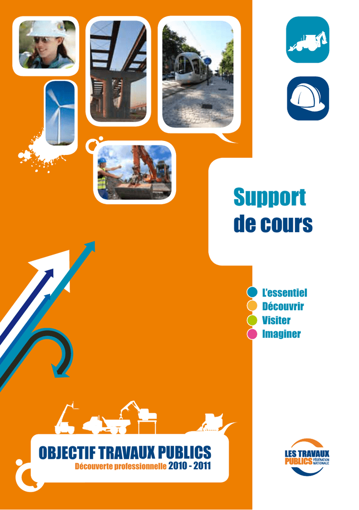 Support de cours L’essentiel Découvrir Visiter Imaginer PUBLICS TRAVAUX OBJECTIF PUBLICS TRAVAUX OBJECTIF 2011 - 2011 2010 -2010 professionnelle Découverte professionnelle Découverte CITONS NOTAMMENT / CREDITS IMAGE : Canalisateurs de France – USIRF – SERCE FRTP Bourgogne – FRTP Franche-Comté – FRTP Ile-de-France – FRTP Nord Pasde-Calais - FRTP Normandie – FRTP Provence-Alpes-Côte d’Azur - FRTP Bretagne Bouygues Construction - Cofiroute – Colas © Photothèque Colas – Dahmane - DTP Terrassement - Eiffage – Eiffage Travaux Publics - Eurovia – Fayat – GauthierLafarge - Pro-BTP – RFF - Sade – Siorat - Socore-Troletti - Soletanche-Bachy - Vinci Construction (Francis VIGOUROUX , Richard Nourry , Pascal LE DOARE, Balloïde Photos) - www.aquawal.be - Olivier Mégaton/Near Production/DDB – Christèle Oudin/ LGM – Onisep – Lauréats du concours Trophées de l’Image Travaux Publics conception réalisation : 2 www.team-media.fr Ce document a été imprimé sur du papier respectant les critères de gestion durable des forêts. REMERCIEMENTS Ce support de cours ainsi que la présentation interactive ont été conçus avec le concours de Fédérations Régionales des Travaux Publics, d’Entreprises de Travaux Publics, d’organisations liées aux Travaux Publics. SOMMAIRE Thème 1 : L’essentiel des Travaux Publics A. Les ouvrages de Travaux Publics B. L’utilité des ouvrages de Travaux Publics C. Les décisionnaires de la construction d’ouvrages Les spécialités des Travaux Publics Le chantier d’aujourd’hui D. E. • Exercice 1 : Quels ouvrages ? • Exercice 2 : Et si les TP n’existaient pas ? • Exercice 3 : Préparez la visite de chantier Thème 2 : Découvrir les Travaux Publics A. Les métiers des Travaux Publics B. Les parcours de formation C. Travailler dans les Travaux Publics • Exercice 4 : Complétez la fiche métier • Exercice 5 : Quelle formation ? • Exercice 6 : Jouez la sécurité Thème 3 : Visiter les Travaux Publics A. B. C. D. E. F. La route M6-M60 en Hongrie La ligne à grande vitesse Perpignan-Figueras Le pont de Beauvais L’approvisionnement en eau de Nouakchott Les différentes phases de travaux La route des Tamarins • Exercice 7 : Quels témoignages ? Thème 4 : Imaginer les Travaux Publics A. B. C. D. La ville de demain Les technologies durables Les matériaux et les matériels innovants Les réalisations respectueuses de l’environnement E. Les Travaux Publics et le cycle de l’eau • Exercice 8 : Le tribunal du tramway P.5 P.5 P.5 P.6 P.8 P.9 P.11 P.13 P.15 p.18 P.18 P.25 P.26 P.30 P.31 P. 34 p.36 P.36 P.36 P.37 P.37 P.38 P. 39 P.40 P. 42 P.42 P.44 P.46 P.47 P.48 P. 49 3 4 L’Essentiel DÉCOUVRIR VISITER IMAGINER L’Essentiel des travaux publics 1 A. Les ouvrages de Travaux Publics Les entreprises de Travaux Publics construisent et entretiennent des ouvrages de construction bénéficiant au plus grand nombre : • Pour permettre aux hommes de mieux communiquer : routes, voies ferrées et navigables, ports, aéroports, métros, tramways, ponts, tunnels, viaducs, réseaux de télécommunication en fibre optique, haut débit, wi-fi... • Pour aménager le cadre de vie : voirie, éclairage public, voies piétonnes, pistes cyclables, stades, équipements sportifs... • Pour améliorer l’environnement : collecte et traitement des eaux usées et des déchets, équipements antibruit et antipollution... • Pour la production de l’énergie : barrages, centrales hydrauliques, éoliennes, centrales photovoltaïques... • Pour l’acheminement de l’eau potable, de l’électricité et du gaz. Vidéo 3’00 Présentation des Travaux Publics EXERCICE 1 : QUELS OUVRAGES ? OBJECTIF Faire imaginer la liste des ouvrages de Travaux Publics DÉROULEMENT Le professeur présente la diapositive 3 sur laquelle sont inscrits les 5 pôles d’intervention. Les élèves visionnent ensuite la vidéo située en diapositive 4. Pendant ce temps, le professeur dessine 5 cases au tableau ou sur une feuille de paper board, et y inscrit les 5 grands pôles. En binômes, les élèves sont invités à inscrire sur les post-it quels sont, selon eux, les ouvrages qui relèvent des Travaux Publics dans chacun des pôles. Un post-it par pôle, précisant leurs prénoms. Ils vont ensuite positionner les post-it sur le tableau ou le paper board dans la case correspondante. CORRIGÉ Le professeur commente, corrige, complète avec la diapositive 5. 5 Si l’eau s’écoule lorsque vous ouvrez un robinet, si la lumière s’allume lorsque vous appuyez sur l’interrupteur, c’est parce que les entreprises de Travaux Publics sont intervenues. Elles ne fournissent ni l’eau, ni l’énergie, mais construisent les réseaux qui les acheminent. De la même manière, les entreprises de Travaux Publics ne fournissent ni automobiles, ni trains, ni autobus, ni vélos … mais elles ont réalisé les routes, les voies, les pistes qui leur permettent de circuler. L’activité des Travaux Publics se partage équitablement entre les travaux de construction et les travaux d’entretien et de réhabilitation, qui consistent à améliorer et à rénover les équipements existants. LES ENTREPRISES DE TRAVAUX PUBLICS Le secteur regroupe 8 300 entreprises qui emploient 260 000 salariés et réalisent un chiffre d’affaires de 62 milliards d’€ dont un tiers à l’international. Cela fait de la France le premier exportateur mondial de Travaux Publics. NE PAS CONFONDRE LES ENTREPRISES ET LEURS CLIENTS Il ne faut pas confondre les entreprises de Travaux Publics avec leurs clients, par exemple : • La SNCF et RFF, pour qui elles construisent et entretiennent les voies de chemin de fer • EDF, pour qui elles construisent et entretiennent barrages, centrales ou lignes électriques • Les syndicats de communes, pour qui elles construisent entre autres les réseaux d’eau • Les conseils généraux qui leur commandent notamment la construction et l’entr