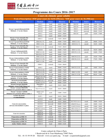 Programme des Cours 2016~2017 Cours de chinois pour adulte Frais d'inscription: 452€ pour cours de 1h30 (45h/an); 769€ pour cours de 3h (90h/an) Niveau Niveau 1 (grand débutant)(1h30) Méthode : C’est du Chinois Niveau 1 Cours intensifs (3h) Méthode : C'est du Chinois Niveau 2 (grand débutant)(1h30) Méthode : C’est du Chinois Module Jours Heures Module Jours Heures 1D1C1 lundi 18h30 - 20h00 3D1CJ3 mercredi 14h00 - 15h30 1D1C2 lundi 20h00 - 21h30 3D1CJ4 mercredi 15h30 - 17h00 2D1CJ3 mardi 14h00 - 15h30 3D1C1 mercredi 18h30 - 20h00 2D1CJ4 mardi 16h00 - 17h30 3D1C2 mercredi 20h00 - 21h30 2D1C1 mardi 18h30 - 20h00 4D1CJ4 jeudi 15h30 - 17h00 2D1C2 mardi 20h00 - 21h30 5DI1C1 vendredi 17h30 - 20h30 1D2CJ4 (1-7) lundi 16h00 - 17h30 4D2C2 (1-8) jeudi 20h00 - 21h30 6D2CJ4 (1-7) samedi 14h30 - 16h00 4D2C1 (1-8) jeudi 18h30 - 20h00 Niveau 2 Cours intensifs (3h) Méthode : C'est du Chinois 5DI2C1 (1-11) vendredi 17h30 - 20h30 1D3CJ4 lundi 16h00 - 17h30 3D3C1 (1-12) mercredi 18h30 - 20h00 Niveau 3 (débutant)(1h30) Méthode : C’est du Chinois 1D3C2 (1-13) lundi 20h00 - 21h30 6D3CJ5 (1-13) samedi 16h00 - 17h30 2D3CJ4 (1-15) mardi 16h00 - 17h30 1D4C2 (2-21) lundi 20h00 - 21h30 4D4CJ4 (2-21) jeudi 15h30 - 17h00 2D4CJ3 (1-20) mardi 14h00 - 15h30 6D4CJ6 (2-21) samedi 17h30 - 19h00 2D4C2 (1-20) mardi 20h00 - 21h30 5DI4C1 vendredi 17h30 - 20h30 2D5C2 mardi 20h00 - 21h30 4D5CJ3 (2-25) jeudi 14h00 - 15h30 2D5CJ4 (2-26) mardi 16h00 - 17h30 Niveau 4 (intermédiaire) (1h30) Méthode : C’est du Chinois Niveau 4 Cours intensifs (3h) Méthode : C'est du Chinois Niveau 5 (intermédiaire) (1h30) Méthode : C’est du Chinois Niveau 6 (intermédiaire) (1h30) Méthode : C’est du Chinois 1D6CJ4 (2-29) lundi 16h00 - 17h30 4D6C1 (2-29) jeudi 18h30 - 20h00 3D6C2 (2-29) mercredi 20h00 - 21h30 6D6CJ1 (2-28) samedi 09h30 - 11h00 Niveau 7 (avancé) (1h30) Méthode : C’est du Chinois 2Deng7C2(2-34) 4ZHOU7CJ3 3HOU8C1(新3-7) 4Lin8C2 (2-37) 2HOUP9C1 mardi jeudi mercredi jeudi 20h00 - 21h30 14h30 - 16h00 18h30 - 20h00 20h00 - 21h30 mardi 18h30 - 20h00 2Lin+C1(新4-40) mardi 18h30 - 20h00 4HOU+CJ3 jeudi 14h00 - 15h30 2LPC1 mardi 18h30 - 20h00 1CC3C3 lundi 12h00 - 13h30 3CC3C1 mercredi 18h30 - 20h00 2CC7CJ3 (长6-1) mardi 14h00 - 15h30 3CC3C2 mercredi 20h00 - 21h30 4ZhL9CCJ(cctv) jeudi 10h00 - 11h30 4CC3C2 jeudi 20h00 - 21h30 6Lin9CCJ3速提20 samedi 13h00 - 14h30 1CC5C1 (长4-1) lundi 18h30 - 20h00 4ZhL+CCJa( cctv) jeudi 11h30 - 13h00 4CC4C1 4HZ3CJ3 4HZ3CJ5 jeudi Jeudi Jeudi 18h30 - 20h00 12h00 - 13h30 17h00 - 18h30 4Lin+CCJb速中8 jeudi 11h30 - 13h00 Préparation au HSK N3 5HSK3C1 vendredi 19h00 -20h30 Préparation au HSK N4 5HSK4CJ vendredi 17h30 -19h00 Préparation au HSK N5 5HSK5CJ vendredi 16h00 -17h30 Atelier Théâtre chinois 4THCCJ Jeudi 10h00 -11h30 Niveau 8 (avancé)(1h30) Méthode : C’est du Chinois Niveau 9 (avancéII)(1h30) Méthode : Great Wall Chinese 6-2 Niveau + (avancéIII)(1h30) Méthode:New practical chinese reader 4 Niveau + (avancé+)(1h30) Méthode:New practical chinese reader 3 Lecture de presse et compréhension Cours de conversation (niveaux intermédiaire et plus) Cours de caractère (长城6-2) (新3-35) Centre culturel de Chine àParis 1 Boulevard de la Tour-Maubourg 75007 Paris Tél. : 01 53 59 59 20 Siteweb : www.ccc-paris.org E-mail : [email protected]