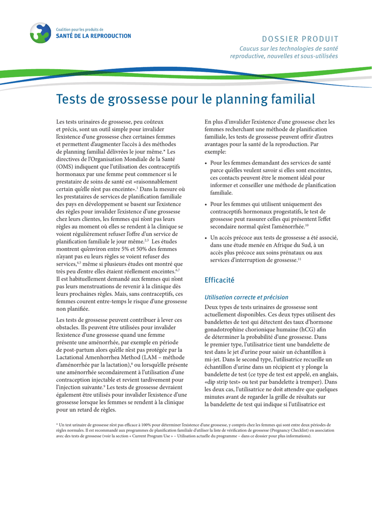 D OSS I E R P R O D U I T Caucus sur les technologies de santé reproductive, nouvelles et sous-utilisées Tests de grossesse pour le planning familial Les tests urinaires de grossesse, peu coûteux et précis, sont un outil simple pour invalider l’existence d’une grossesse chez certaines femmes et permettent d’augmenter l’accès à des méthodes de planning familial délivrées le jour même.* Les directives de l’Organisation Mondiale de la Santé (OMS) indiquent que l’utilisation des contraceptifs hormonaux par une femme peut commencer si le prestataire de soins de santé est «raisonnablement certain qu’elle n’est pas enceinte».1 Dans la mesure où les prestataires de services de planification familiale des pays en développement se basent sur l’existence des règles pour invalider l’existence d’une grossesse chez leurs clientes, les femmes qui n’ont pas leurs règles au moment où elles se rendent à la clinique se voient régulièrement refuser l’offre d’un service de planification familiale le jour même.2,3 Les études montrent qu’environ entre 5% et 50% des femmes n’ayant pas eu leurs règles se voient refuser des services,4,5 même si plusieurs études ont montré que très peu d’entre elles étaient réellement enceintes.6,7 Il est habituellement demandé aux femmes qui n’ont pas leurs menstruations de revenir à la clinique dès leurs prochaines règles. Mais, sans contraceptifs, ces femmes courent entre-temps le risque d’une grossesse non planifiée. Les tests de grossesse peuvent contribuer à lever ces obstacles. Ils peuvent être utilisées pour invalider l’existence d’une grossesse quand une femme présente une aménorrhée, par exemple en période de post-partum alors qu’elle n’est pas protégée par la Lactational Amenhorrhea Method (LAM – méthode d’aménorrhée par la lactation),8 ou lorsqu’elle présente une aménorrhée secondairement à l’utilisation d’une contraception injectable et revient tardivement pour l’injection suivante.9 Les tests de grossesse devraient également être utilisés pour invalider l’existence d’une grossesse lorsque les femmes se rendent à la clinique pour un retard de règles. En plus d’invalider l’existence d’une grossesse chez les femmes recherchant une méthode de planification familiale, les tests de grossesse peuvent offrir d’autres avantages pour la santé de la reproduction. Par exemple: • Pour les femmes demandant des services de santé parce qu’elles veulent savoir si elles sont enceintes, ces contacts peuvent être le moment idéal pour informer et conseiller une méthode de planification familiale. • Pour les femmes qui utilisent uniquement des contraceptifs hormonaux progestatifs, le test de grossesse peut rassurer celles qui présentent l’effet secondaire normal qu’est l’aménorrhée.10 • Un accès précoce aux tests de grossesse a été associé, dans une étude menée en Afrique du Sud, à un accès plus précoce aux soins prénataux ou aux services d’interruption de grossesse.11 Efficacité Utilisation correcte et précision Deux types de tests urinaires de grossesse sont actuellement disponibles. Ces deux types utilisent des bandelettes de test qui détectent des taux d’hormone gonadotrophine chorionique humaine (hCG) afin de déterminer la probabilité d’une grossesse. Dans le premier type, l’utilisatrice tient une bandelette de test dans le jet d’urine pour saisir un échantillon à mi-jet. Dans le second type, l’utilisatrice recueille un échantillon d’urine dans un récipient et y plonge la bandelette de test (ce type de test est appelé, en anglais, «dip strip test» ou test par bandelette à tremper). Dans les deux cas, l’utilisatrice ne doit attendre que quelques minutes avant de regarder la grille de résultats sur la bandelette de test qui indique si l’utilisatrice est * Un test urinaire de grossesse n’est pas efficace à 100% pour déterminer l’existence d’une grossesse, y compris chez les femmes qui sont entre deux périodes de règles normales. Il est recommandé aux programmes de planification familiale d’utiliser la liste de vérification de grossesse (Pregnancy Checklist) en association avec des tests de grossesse (voir la section « Current Program Use » – Utilisation actuelle du programme – dans ce dossier pour plus informations). C AU C U S S U R L E S T EC H N O LO G I E S D E SA N T É R E P R O D U C T I V E , N O U V E L L ES E T S O U S - U T I L I SÉ ES D OSSI E R P R O D U I T probablement enceinte. La majorité des tests comporte un indicateur témoin qui indique si le test fonctionne correctement. Les tests par bandelettes à tremper sont moins coûteux que les tests utilisés à mi-jet et sont habituellement utilisés dans des zones disposant de peu de facilités. Les tests sanguins de grossesse sont également disponibles et sont très efficaces, mais leur coût reste prohibitif pour la majorité des pays en développement. Les deux types de tests urinaires de grossesse ont des taux d’exactitude comparables et sont tous les deux très précis quand ils sont utilisés correctement et suffisamment longtemps après la fécondation. Les instructions accompagnant les tests disponibles dans le commerce indiquent qu’une cliente doit attendre jusqu’après la date prévue des règles suivantes avant de faire le test. Certains tests disponibles en vente libre font état d’un taux d’exactitude de 99% après un jour de retard des règles. Cependant, des études ont montré que cette assertion était exagérée12, 13, 14 et estiment que la précision est plus proche de 90% après le premier jour de retard des règles. L’exactitude augmente au fur et à mesure que le temps passe depuis l’absence de règles et les auteurs d’une étude l’estiment à 97% sept jours après l’absence de règles.12 Certains tests peuvent requérir une durée d’une semaine à compter de la date