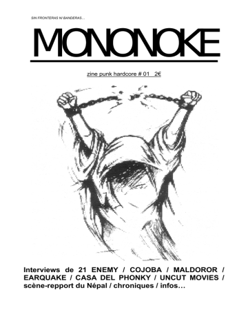 SIN FRONTERAS NI BANDERAS… MONONOKE zine punk hardcore # 01 2€ Interviews de 21 ENEMY / COJOBA / MALDOROR / EARQUAKE / CASA DEL PHONKY / UNCUT MOVIES / scène-repport du Népal / chroniques / infos… 2 Maiden ou Limp Bizbit! Certains considèrent le metal/HC comme une évolution logique du HC, et franchement, j'en doute et je m'en bat les couilles… Avec 21 ENEMY, on voulait jouer le HxC originel, celui qui arrache… pas de guitar-hero ou de headbanging…! Encore hier, j'écoutais les live de YOT et de Manlifting Banner, et là, c'est punk, c'est HxC! Le metal n'a rien à voir avec ça! 21 ENEMY Y'a pas tellement de groupes old school en France, alors quand on a l'opportunité d'en choppé un, faut pas hésiter à s'intéresser à lui, et à le soutenir.21 ENEMY débarque donc de Bordeaux, avec sous les bras une démo sur cdr,100% youth-crew. Le groupe pense évoluer vers un son plus européen, style Mainstrike, Eyeball… C'est Matt, le chanteur, qui répond à mes questions. 3. Le HC est une musique de plus en plus complexe, technique… Vous n'avez pas l'impression que cela devienne un style joué par des musiciens ? Que tout soit calculé, en perdant le coté spontané, amateur & accessible à tous ? Ouais, t'as parfaitement raison! Cette évolution vers le metal/HC, emo torturé… rend la musique complexe, technique et tout. Bon, il y a des bons groupes dans ce style là, et je crois que l'esprit compte avant tout. Il y a des groupes qui ne sont pas old school mais qui sont HxC parce que leur attitude est vrai, ils ont un message et savent quel est le son originel. Je pense à des groupes comme Catharsis ou Refused… ils sont HxC, mais tu perd le coté amateur que prônait le punk à ses débuts… De toute façon la vague bandana/trashcore remet ce style de HxC au goût du jour. L'emo-metal fait son chemin, le sXe 88' est un peu essoufflé… le HC marche comme tout, par vagues. De toute façon, il y en a pour tout le monde, et il y aura toujours des gens voulant écouter le son originel, que ce soit Discharge ou Minor Threat… 1. Bon commençons par la classique présentation du groupe, line-up, prod, nom du groupe… Notre petite biographie est un véritable foutoir tellement la formation à changée de fois! Aujourd'hui, je crois que c'est: xSEBx-batterie, xMATTx-chant, xRENOx-basse, BEN-guitare. On va peu-être avoir un deuxième guitariste venant de Paris, mais rien de bien sur. Sinon, Ben et moi sommes encore au lycée, donc j'espère que cette année sera la dernière au bahut. Reno est à la fac et Seb bosse à mi-temps. Je vais t'épargner tous les détails de notre vie personnelle car tout le monde s'en bat les couilles, mais on est tous investi dans ce groupe car c'est quelque chose de très important à nos yeux et on espère jouer le plus longtemps possible. Je m'abstiendrai de te donner la signification de 21 ENEMY car seul Reno en détient le véritable sens, et ce depuis la formation du groupe en 1999. Si on à sorti qu'une démo depuis ce temps, c'est parce qu'il est difficile de trouver des gens investis à 100% dans le vrai HC, et qui sont motivés pour tourner et jouer à fond. En jouant maintenant avec Seb, qui est un ex-Öpstand, on à trouvé une formation forte qui peut jouer et tourner, sortir des trucs… Sinon la démo nous a ouvert des portes (concerts, itws, fanzines…) et on espère remettre ça bientôt car les chansons datent un peu maintenant. Les nouvelles compos sont bien meilleures, toujours old-school , bien rapides & agressives, et on espère trouver un petit label DIY pour nous aider à sortir un 7". Ça le ferait grave, mais on va essayer de faire des concerts avant de sortir un truc. On a joué trop peu de concert, dont un avec Good Clean Fun, mais les autres n'étaient pas terribles. Maintenant, on a une énorme motivation, on est prêt à jouer partout, pour montrer que le vrai HxC est bien vivant et que le punk n'est pas "une mode passagère", mais un style de vie et de pensée dont les gens on besoin. Si vous voulez nous faire jouer pour l'anniversaire de votre grand-mère ou pour animer la kermesse annuelle du village, n'hésitez pas à nous contacter, bande de trou du cul… 4. Que représente le straight edge pour 21 ENEMY ? Mis à part dans le DIY, c'est un mouvement quasi inexistant en France, ou alors juste le temps d'une mode passagère! Tout d'abord, 21 ENEMY n'est pas un groupe 100% sXe puisque Ben l'a été quelque temps mais ne l'est plus. Tous les autres membres du groupe le sont mais ce n'est , pour ma part, pas le truc sur quoi le groupe est focalisé. Je ne suis pas intégriste, je traîne avec des gens qui boivent et qui fument, tout est une question de respect. Si les gens respectent mon truc, alors je respecte le leur et c'est cool. Quand à l'effet de mode, il n'y en a pas en France, c'est pas comme aux Usa, en Hollande ou Belgique. La plupart des sXe que je connais sont intègres et ouverts d'esprit, et ne prônent pas ou ne revendiquent pas incessamment leur "sXe way of life". Et il y a de moins en moins de sXe kids dans la scène, ça me fout un peu les boules, même si je sui pro-légalisation, que les autres jeunes ne se rendent pas compte que se détruire en prônant la révolution ne mène à rien. L'alcool et autres drogues sont juste un outil du gouvernement, pour contrôler les masses, remplir les caisses de l'Etat et imposer ça comme un outil d'intégration social. On accepte tout sans réfléchir. Je peux au moins dire que je me suis libéré de ça, c'est pas ère beaucoup mais c'est déjà pas mal. La 1 chanson de la démo "drink to me, drink to be" met suffisamment les choses au clair, sans être pour autant militante. Lisez les paroles! 2. Pourquoi avoir opté pour le old school ? Marre du metal ? Pourquoi le old school !? Je crois que c'est venu d'une évolution naturelle. Au début, t'écoutes toute la vague mélodique style NOFX et les groupes d'Epitaph, puis après t'en arrive à Sick O
