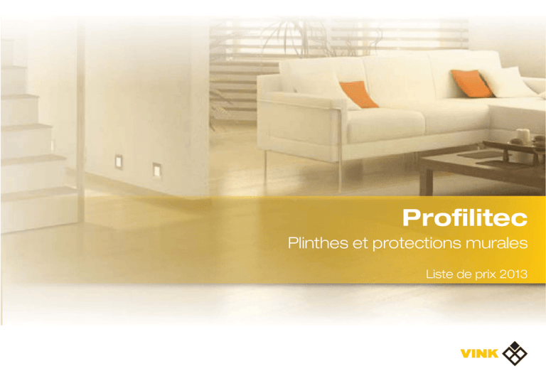 Profilitec Plinthes et protections murales Liste de prix 2013 Plinthes techniques JUIN 2013 84 Longueur: 2,00 / 4,00 mètres 60 Longueur: 2,00 / 4,00 mètres H 10 Longueur: 2,70 mètres MATLINE/BROSSÉ Code BA-IS + /m 2,53 H plinthe » BAR 600 AS Multiline en Aluminium Anodisé Argent Strié H= mm € € € € € € pcs pcs Art. Finition / m 60 € € € Argent € € € BAR600 ASN Aluminium 60 BAR600 ASA Adhesivé Aluminium Argent PVC /pc 2,92: / = Droit + Gauche. Raccords en rentrant BAI-PS sortant BAE-PS / capuchon BAT-PS. 1 set » BA-AS* Aluminium Anodisé Argent € € € € € € Finition /m pcs H = mm Art. pcs 45 BA 450ASN Aluminium Argent non Adhesivé Aluminium Argent plinthe 45 BA 450ASA Adhesivé € € € € € € BAR Aluminium Argent 60 BA 600ASN non Adhesivé € € € € € € Aluminium Argent 60 BA 600ASA Adhesivé € € € € € € Aluminium Argent 80 BA 800ASN Adhesivé € € € € non € € 80 BA 800ASA Aluminium Argent Adhesivé Aluminium Argent 100 BA1000 ASN non Adhesivé 100 BA1000 ASA Aluminium Argent Adhesivé Raccords 1 en rentrant H 60-80). PVC /pc 2,92: BAI-PS / sortant BAE-PS / capuchon BAT-PS. (seulement pour set = Droit + Gauche. Pour l’éventuelle Raccords non 200 m + /m 3,43. laquage RAL commandes de minimum disponibles pour H 100 et 45 mm. » 600 BA A* Aluminium Laqué pcs H = mm Art. m pcs Finition / Corten 60 BA 600A60 60 BA 600A50 Gris Micacé € € € € € € » BA600 Aluminium Texturé € € € € € € Art. pcs H = mm Finition / m pcs A 60 600 TRSN Texturé new BA Aluminium Rouvre Blanchi plinthe A Aluminium Wengé BA-ATRS 60 600 TWEN Texturé BA plinthe BA-IL A Aluminium Teak BA 60 600 TTKN Texturé BA A 60 600 TRON Texturé Aluminium Rouvre » BA-IL* Acier Inox Poli AISI 304 - DIN 1.4301 /m pcs H = mm Art. Finition pcs 60 BA 600ILN non Inox Poli Adhesivé Inox Poli 60 BA 600ILA Adhesivé Inox Poli Adhesivé 80 BA 800ILN non Inox Poli 80 BA 800ILA Adhesivé Raccords PVC couleur ‘Inox’ Épaisseur 10/10. en /pc 4,32. RentrantBAI-PI BAE-PI / Sortant / Capuchon BAT-PI + Gauche 1 set = Droit / CapuchonBAT-PI » 600-IX Acier BA Inox Sablé AISI 304 DIN 1.4301 / pcs H = mm Art. Finition m pcs new Acier Inox Sablé 60 BA 600 IX plinthe plinthe plinthe plinthe plinthe 10 Multiple de minimum 10 pièces par article et finition avec augmentation du 10% Conditionnement indivisible 20 pcs. Cintrables avec cintreuse à page 94 € € € € € € € € » BA400 AS* Aluminium Anodisé € € € € € € € € / 4,00 € € pcs H = mm Art. Finition / m pcs Longueur: 2,00 mètres € € € € 40 BA 400ASN Aluminium Argent 40 BA 400ASS Aluminium Anodisé Brossé 40 BA 400ASB Brillant Chrome Aluminium rentrant, sortant et capuchon BAC 400 A* /pc 7,81. Raccord 40 » BA A*Aluminium Laqué 400 H = mm Art. Finition / m pcs pcs Corten 40 BA 400A60 10 € € € € € € Gris Micacé 40 BA 400A50 € € € € raccords rentrants, sortants capuchons. et Disponibles € € € € » BI-ASN à emboîtement en Aluminium Anodisé Argent Longueur: / 4,00 mètres pcs H = mm Art. / m pcs 2,00 Finition € € € € € € Argent 70 BI 700ASN Aluminium € € € € € € € € 100 BI1000 ASN Aluminium Argent € € € € € € pcs Art. Description / pc € € € € € € € € Supports percés en Aluminium 20ANF BIS Raccord rentrant en PVC BII700PS H BIE700PS Raccord sortant en PVC BIT700PS Capuchon en PVC pour - on conseille de non compris à commander séparément 2 à 3 pcs/m. Capuchon disponible seulement Supports H 70 mm. l’éventuelle /m 1 set = Droit + Gauche. Pour laquage RAL commandes de minimum 200 m + 3,43. BA 700 P*PVC expansé mètres » Longueur: 2,00 pcs H = mm Art. / m Couleur pcs 70 BA 700 P 12 Blanc 70 BA 700 P 22 Gris 70 BA 700 P 51 Noir 70 BA 700 P 79 Noyer Plinthes techniques plinthe plinthe plinthe BA plinthe plinthe sani ec IC 60 Article non déconditionnable. 70 € € € € € € 10 » IC 60 P11Résine Synthétique Resinil Colorée dans la masse Longueur: mètres 2,70 pcs AxB Art. Couleur / m pcs 20 x 60 IC 60 11 Blanc pur P sani ec 60 JUIN 2013 plinthe BI 700 20 85 Plinthes techniques mètres Longueur: 2,00 / 4,00 TOP 80 Longueur: 2,00 / 4,00 mètres TOP 80 50 € € € € € € € € 800* € € € € » BIB/BI àemboîtement an Aluminium / Aluminium et Aluminium / Bois effet ‘Bicolore’ € € pcs H = mm Art. Finition / m pcs 50 BIB800 ASN Base Aluminium Argent Argent 30 BI 800ASN Top Aluminium Anthracite 30 BI 800 A 50 Top Aluminium Verni 30 BI 800RO Top Rouvre Naturel 30 BI 800RON Top Rouvre Raccords PVC /pc 2,92: rentrantBII 800 PS / sortant BIE 800 PS / capuchon BIT 800 PS. 1 set = Droit + Gauche. en plinthe Pour l’éventuelle laquage RAL commandes de minimum 200 m + /m 3,43. Plus Plinthe décorative avec la possibilité d’effet ‘bi-couleur’. La section du profil permet le passage de petits câbles de service. Ancrage mécanique avec supports. Focus Top disponible en métal et en bois, aussi en rouvre naturel, pour ambiances modernes et personnalisées. Avec une profondeur de la base en 18 mm, il est idéal comme couverture des joints de dilatation périmétrales des sols en bois. plinthe BI 800 € € € € € € 800 € € € € » BIM A* Plinthes à emboîtement pour raccorder l’étanchéité € € H = mm Art. Finition / m pcs pcs ASN 50 BIM 800 BASE Aluminium Argent 30 BI 800ASN TOP Aluminium Argent A 30 BI 800 50 TOP Alluminium Gris Micacé PVC /pc 2,92: rentrantBII 800 PS / sortant BIE 800 PS / capuchon BIT 800 PS. 1 set = Droit + Gauche. Raccordsen 3,43. laquage RAL commandes de minimum 200 m + /m Pour l’éventuelle plinthe Plus Profil en Aluminium Anodisé et laqué garanti aussi à l’extérieur. Finition de design en métal à la place des plinthes classiques en carrelages ou des profils des ferblantiers. Le profil s’intègre à la structure des terrasses comme couvre-natte. Focus Il couvre le r