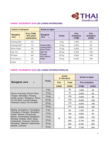 TARIFS* EXCÉDENTS SUR LES LIGNES INTÉRIEURES Achat à l’aéroport Bangkok vers ↓ Achat enligne Prix (THB) / KG selon destination Chiang Mai 60 Chiang Rai** 70 Khon Kaen 55 Hat Yai 80 Phuket NC Koh Samui 95 Krabi 70 Bangkok vers ↓ Chiang Mai, Chiang Mai**, Khon Kaen, Hat Yai, Phuket, Koh Samui, Krab i Prix forfaitaire (THB) Poids Prix forfaitaire (USD) 5 kg 1,000 32 10 kg 2,000 63 15 kg 3,000 95 20 kg 4,000 126 25 kg 5,000 158 30 kg 6,000 189 TARIFS* EXCÉDENTS SUR LES LIGNES INTERNATIONALES Bangkok vers ↓ Dacca, Kunming, Phnom Penh, Yangon, Mandalay, Penang, Kuala Lumpur, Singapour, Hanoi, Ho Chi Minh, Luang Prabang, Vientiane, Hanoi, Ho Chi Minh Beijing, Guangzhou, Chongqing, Changsha, Chengdu, Shanghaï, Taipei, Xiamen, Hong Kong, Macau, Ahmedabad, Bangalore, Mumbai, Kolkata, Delhi, Gaya, Hyderabad, Varanasi, Chennai, Denpasar, Djakarta, Kathmandu, Manille, Colombo Achat à l’aéroport Poids Achat enligne Prix Total (USD) (USD) (THB) (USD) 5 kg 35 1,000 32 10 kg 70 2,000 63 105 3,000 95 140 4,000 126 25 kg 175 5,000 158 30 kg 210 6,000 189 5 kg 50 1,300 40 10 kg 100 2,600 80 150 3,800 120 200 5,100 160 25 kg 250 6,400 200 30 kg 300 7,700 240 15 kg 20 kg 15 kg 20 kg 7 10 Prix forfaitaire 1 Bangkok vers ↓ Tokyo Narita, Tokyo Haneda, Osaka, Sapporo, Fukuoka, Nagoya, Séoul, Busan, Karachi, Mascat, Islamabad, Lahore, Dubaï, Perth Sydney, Brisbane, Melbourne, Achat à l’aéroport Poids Prix Total (USD) (USD) (THB) (USD) 5 kg 125 3,200 100 10 kg 250 6,400 200 375 9,600 300 500 12,800 400 25 kg 625 16,000 500 30 kg 750 19,200 600 5 kg 150 3,400 105 10 kg 300 6,800 210 450 10,100 315 600 13,500 420 25 kg 750 16,800 525 30 kg 900 20,200 630 5 kg 275 6,200 193 10 kg 550 12,400 385 825 18,500 578 1,100 24,700 770 25 kg 1,375 30,800 963 30 kg 1,650 37,000 1,155 15 kg 20 kg 15 kg 20 kg Paris, Bruxelles, Londres, Francfort, Munich, Rome, Milan, Zurich, Copenhague, Stockholm, Oslo, Auckland Achat enligne 15 kg 20 kg 25 30 55 Prix forfaitaire * Tarifs communiqués à titre indicatif, liés à la variation des taux de change THB/dollar/euro. Garantis le jours de l'achat Si une destination ne se trouve pas dans cette liste, merci de contacter nos services PARSL2MAR16 > source S9 Sep14 GD_XCESS_BAG_WEB_PRO 2