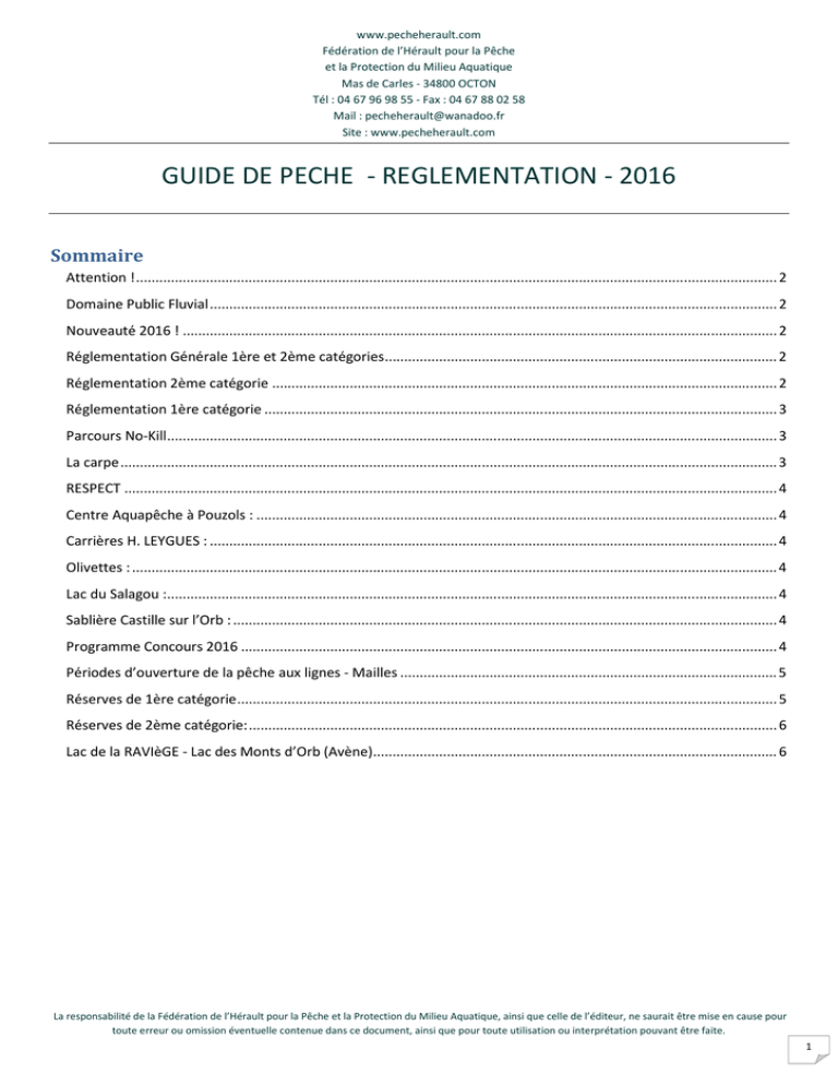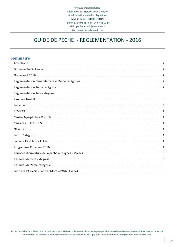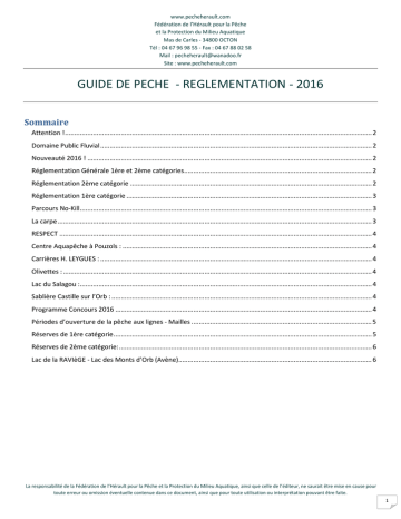 www.pecheherault.com Fédération de l’Hérault pour la Pêche et la Protection du Milieu Aquatique Mas de Carles - 34800 OCTON Tél : 04 67 96 98 55 - Fax : 04 67 88 02 58 Mail : [email protected] Site : www.pecheherault.com GUIDE DE PECHE - REGLEMENTATION - 2016 Sommaire Attention ! ..................................................................................................................................................................... 2 Domaine Public Fluvial .................................................................................................................................................. 2 Nouveauté 2016 ! ......................................................................................................................................................... 2 Réglementation Générale 1ère et 2ème catégories ..................................................................................................... 2 Réglementation 2ème catégorie .................................................................................................................................. 2 Réglementation 1ère catégorie .................................................................................................................................... 3 Parcours No-Kill ............................................................................................................................................................. 3 La carpe ......................................................................................................................................................................... 3 RESPECT ........................................................................................................................................................................ 4 Centre Aquapêche à Pouzols : ...................................................................................................................................... 4 Carrières H. LEYGUES : .................................................................................................................................................. 4 Olivettes : ...................................................................................................................................................................... 4 Lac du Salagou :............................................................................................................................................................. 4 Sablière Castille sur l’Orb : ............................................................................................................................................ 4 Programme Concours 2016 .......................................................................................................................................... 4 Périodes d’ouverture de la pêche aux lignes - Mailles ................................................................................................. 5 Réserves de 1ère catégorie ........................................................................................................................................... 5 Réserves de 2ème catégorie: ........................................................................................................................................ 6 Lac de la RAVIèGE - Lac des Monts d’Orb (Avène)........................................................................................................ 6 La responsabilité de la Fédération de l’Hérault pour la Pêche et la Protection du Milieu Aquatique, ainsi que celle de l’éditeur, ne saurait être mise en cause pour toute erreur ou omission éventuelle contenue dans ce document, ainsi que pour toute utilisation ou interprétation pouvant être faite. 1 Attention ! Domaine Public Fluvial Nouveauté 2016 ! La réglementation peut être différente d’un département à l’autre (nombre de lignes, ouvertures spécifiques, appâts, etc.). Renseignez-vous et consultez les arrêtés préfectoraux en mairie ou gendarmerie. Pêcheurs, respectez les règlements en vigueur dans notre département. La réciprocité à une canne est accordée à tout pêcheur à jour de ses cotisations (quel que soit son département) sur le Domaine Public fluvial. Sur le Canal du Midi, à proximité des écluses (100 m), la priorité doit être laissée aux manoeuvres des bateaux • La Pêche est interdite sur : la Brèze et ses affluents la Lergue entre le chaussée de la Solitude et la confluence de la Brèze la Canalette • La Pêche de l’ombre est interdite • No Kill au bousquet d’orb • Réserves au salagou • Quotas carnassiers : Quotas de sandre, brochet et black-bass : 3 poissons par jour dont 2 brochets maximum en 2ème catégorie. Réglementation Générale 1ère et 2ème catégories Nul ne peut pratiquer la pêche s’il n’a pas adhéré à une Association Agréée pour la Pêche et la Protection du Milieu Aquatique et s’il n’a pas acquitté la CPMA de l’année en cours. Désormais, le défaut de la carte de pêche, par un pêcheur en action de pêche, constitue une infraction, à l’instar du défaut de port du permis de chasser (Art. R.*236-3 du code de l’environnement). • La pêche sous la glace est interdite. • La pêche à la traîne est interdite dans les cours d’eau et plans d’eau du département, de même que l’utilisation d’un moteur thermique pour circuler en bateau sur les plans d’eau. • La pêche à partir d’un barrage est réglementée de la façon suivante (sauf interdiction particulière - réserve de pêche ) : Une seule canne est autorisée par pêcheur sur le barrage et sur une distance de 50m en aval de celui-ci. • Pêche aux engins (carrelet, balance...) interdite sur le barrage et sur une distance de 200 m en aval de celui-ci. ( Est considéré comme barrage tout ouvrage construit en travers d’un cours d’eau et qui cr