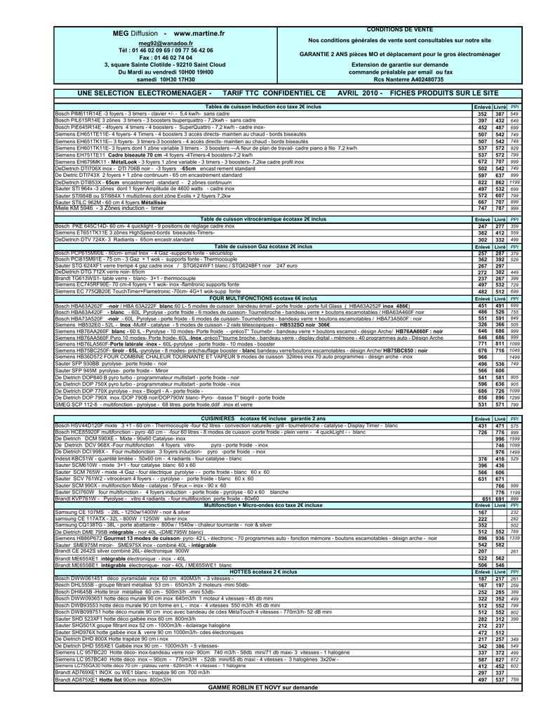 MEG Diffusion - CONDITIONS DE VENTE www.martine.fr [email protected] Tél : 01 46 02 09 69 / 09 77 56 42 06 Fax : 01 46 02 74 04 3, square Sainte Clotilde - 92210 Saint Cloud Du Mardi au vendredi 10H00 19H00 samedi 10H30 17H30 UNE SELECTION ELECTROMENAGER - Nos conditions générales de vente sont consultables sur notre site GARANTIE 2 ANS pièces MO et déplacement pour le gros électroménager TARIF TTC CONFIDENTIEL CE Extension de garantie sur demande commande préalable par email ou fax Rcs Nanterre A402480735 AVRIL 2010 - FICHES PRODUITS SUR LE SITE Tables de cuisson Induction éco taxe 2€ inclus Bosch PIM611R14E -3 foyers - 3 timers - clavier +/- - 5,4 kw/h- sans cadre Bosch PIL615R14E 3 zônes 3 timers - 3 boosters tsuperquattro - 7,2kwh - sans cadre Bosch PIE645R14E - 4foyers 4 timers - 4 boosters - SuperQuattro - 7,2 kw/h - cadre inoxSiemens EH651TE11E- 4 foyers- 4 Timers - 4 boosters 3 accès directs- maintien au chaud - bords biseautés Siemens EH651TK11E-- 3 foyers- 3 timers-3 boosters - 4 accès directs- maintien au chaud - bords biseautés Siemens EH601TK11E- 3 foyers dont 1 zône variable 3 timers - 3 boosters ---A fleur de plan de travail- cadre piano à filo 7,2 kw/h Siemens EH751TE11 Cadre biseauté 70 cm -4 foyers -4Timers-4 boosters-7,2 kw/h Siemens EH679MK11 - MétalLook - 3 foyers 1 zône variable - 3 timers - 3 boosters- 7,2kw cadre profil inox DeDietrich DTI706X inox - DTI 706B noir - -3 foyers -65cm encast rement standard De Dietric DTI743X 2 foyers + 1 zône continuum - 65 cm encastrement standard DeDietrich DTI853X - 65cm encastrement -standard - 2 zônes continuum Sauter STI 964x -3 zônes dont 1 foyer Amplitude de 4600 watts - cadre inox Sauter STI984B ou STI984X 1 multizônes dont zône Evolis + 2 foyers 7,2kw Sauter STILC 962M - 60 cm 4 foyers Métallisée Miele KM 5946 - 3 Zônes induction - timer Enlevé 352 397 452 507 507 537 537 672 502 597 822 497 572 667 747 Livré 387 432 487 542 542 572 572 707 542 637 862 532 607 707 787 Table de cuisson vitrocéramique écotaxe 2€ inclus Bosch PKE 645C14D- 60 cm- 4 quicklight - 9 positions de réglage cadre inox Siemens ET651TK11E 3 zônes HighSpeed-bords biseautés-TimersDeDietrich DTV 724X- 3 Radiants - 65cm encastr.standard Table de cuisson Gaz écotaxe 2€ inclus Bosch PCP615M90E - 60cm- email Inox - 4 Gaz -supports fonte - sécuristop Bosch PCI815M91E - 75 cm - 3 Gaz + 1 wok - supports fonte - Thermocouple Sauter STG 624XF1 verre trempé 4 gaz cadre inox / STG624WF1 blanc / STG624BF1 noir 247 euro DeDietrich DTG 712X verre noir- 65cm Brandt TG613WS1- table verre - blanc- 3+1 - thermocouple Siemens EC745RF90E- 70 cm-4 foyers + 1 wok- inox -flamtronic supports fonte Siemens EC 775QB20E TouchTimer+Flametronic -70cm- 4G+1 wok-supp fonte FOUR MULTIFONCTIONS écotaxe 6€ inclus Bosch HBA63A262F -noir / HBA 63A222F blanc 60 L- 5 modes de cuisson bandeau émail - porte froide - porte full Glass ( HBA63A252F inox 486€) Bosch HBA63A420F - blanc - 60L Pyrolyse - porte froide - 6 modes de cuisson- Tournebroche - bandeau verre + boutons escamotables / HBA63A460F noir Bosch HBA73A520F -noir - 60L Pyrolyse - porte froide - 6 modes de cuisson- Tournebroche - bandeau verre + boutons escamotables / HBA73A560F : noir Siemens HB532E0 - 52L - Inox -Multif - catalyse - 5 modes de cuisson - 2 rails télescopiques - HB532SO noir 306€ Siemens HB76AA260F blanc - 60 lL - Pyrolyse - 10 modes- Porte froide - -précoT° Tournebr - bandeau verre + boutons escamot - désign Arche/ HB76AA660F : noir Siemens HB76AA560F Pyro 10 modes- Porte froide- 60L -Inox -précoT°tourne broche - bandeau verre - display digital - mémoire - 40 programmes auto - Désign Arche Siemens HB76LA560F-Porte latérale -inox - 60L-pyrolyse - porte froide - 10 modes - booster Siemens HB75BC250F- tiroir - 65L -pyrolyse - 8 modes- préchauffage booster - blanc bandeau verre/boutons escamotables - désign Arche/ HB75BC650 : noir Siemens HB36D572 FOUR COMBINE CHALEUR TOURNANTE ET VAPEUR 9 modes de cuisson 32litres inox 70 auto programmes - désign arche - inox Sauter SFP 930BB pyrolyse- porte froide - noir Sauter SFP 945M pyrolyse- porte froide - Miroir De Dietrich DOP840 B pyro turbo - programmateur multistart - porte froide - noir De Dietrich DOP 750X pyro turbo - programmateur multistart - porte froide - inox De Dietrich DOP 770X pyrolyse - inox - Biogril - A - porte froide De Dietrich DOP 790X inox /DOP 790B noir/DOP790W blanc- Pyro- -basse T° biogril - porte froide SMEG SCP 112-8 - multifonction - pyrolyse - 68 litres .porte froide.ddif .inox et verre Enlevé Livré CUISINIERES écotaxe 6€ incluse garantie 2 ans Bosch HSV44D120F mixte 3 +1 - 60 cm - Thermocouple -four 62 litres - convection naturelle - grill - tournebroche - catalyse - Display Timer - blanc Bosch HCE85920F multifonction - pyro -60 cm - -four 60 litres - 8 modes de cuisson -porte froide - plein verre - 4 quickLight - - blanc De Dietrich DCM 590XE - Mixte - 90x60 Catalyse- inox De Dietrich DCV 968X -Four multifonction 4 foyers vitropyro - porte froide - inox De Dietrich DCI 998X - Four multidonction 3 foyers induction- pyro -porte froide - inox Indesit KBC51W - quantité limitée - 50x60 cm - 4 radiants - four catalyse - blanc Sauter SCM610W - mixte 3+1 - four catalyse blanc 60 x 60 Sauter SCM 765W - mixte -4 Gaz - four électrique pyrolyse - - porte froide - blanc 60 x 60 Sauter SCV 761W2 - vitrocéram 4 foyers - - pyrolyse - porte froide - blanc 60 x 60 Sauter SCM 990X - multifonction Mixte - catalyse - 5Feux -- inox - 90 x 60 Sauter SCI760W four multifonction - 4 foyers induction - porte froide - pyrolyse - 60 x 60 blanche Brandt KVP761W - Pyrolyse - vitro 4 radiants - four multifocntion porte froide - 60x60 Multifonction + Micro-ondes éco taxe 2€ incluse Samsung CE 107MS - 28L - 1250w/1400W - noir & silver samsung CE 117ATX - 32L - 800W / 1250W silver inox Samsung CQ138TG - 38L - porte abattante - 800w / 1540w - chaleur tournante - noir & silver De Dietrich DME 795B intégrable - 