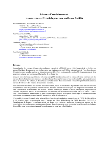 Réseaux d’assainissement : les nouveaux référentiels pour une meilleure fiabilité Michel MONTAUT, Nathalie LE NOUVEAU CETE de l’Est – LRPC de Nancy 71 rue de la Grande Haie, 54 510 TOMBLAINE [email protected] [email protected] Jean-Claude GUIGNARD, Saint-Gobain PAM / ASTEE Les Longues Raies - BP 109 – Maidières, 54704 Pont-à-Mousson Cedex [email protected] Dominique ORDITZ Centre Scientifique et Technique du Bâtiment Département CAPE 11 rue H.Picherit, BP 82341 NANTES CEDEX 03 [email protected] Jean-Michel BERGUE, ASTEE/FSTT 47, Boulevard Saint Marcel 75013 PARIS [email protected] Résumé Le patrimoine des réseaux d’eaux usées en France est estimé à 250 000 km en 1998, la moitié de ce linéaire est aujourd’hui âgée de cinquante ans et plus, selon une étude menée par l’Office International de l’eau. Les réseaux d’assainissement les plus anciens se situent en centre ville. Ceux posés dans les années 50-60, en période de forte extension urbaine, arrivent aujourd’hui en fin de cycle de vie. Une part importante de ce patrimoine est donc susceptible de nécessiter, soit un renouvellement complet, soit des travaux de réhabilitation sans tranchée afin de restaurer leurs performances tout en limitant les gênes générées en phase de chantier. Par ailleurs, la desserte de nouvelles zones d’assainissement collectif requiert la réalisation de travaux d’extension des réseaux d’eaux usées existants. Pour améliorer la fiabilité des réseaux d’assainissement, neufs ou réhabilités, et permettre ainsi aux collectivités de répondre à leurs obligations d’assainissement, plusieurs référentiels techniques ont été publiés récemment. Ils sont à destination de l’ensemble des acteurs : maîtres d’ouvrages, maîtres d’œuvre, entreprises, organismes de contrôle. La pose de réseaux d’assainissement est encadrée par la nouvelle version du fascicule 70 du CCTG – titre I. Les travaux de réhabilitation et leurs contrôles préalables à la réception font l’objet de recommandations techniques, complétées par un dispositif normatif en plein développement. L’ensemble de ces référentiels a été présenté lors d’une journée technique organisée par le CETE de l’Est à Metz le 19 octobre 2006, en partenariat avec l’Agence de l’Eau Rhin-Meuse, la FRTP Lorraine, l’ASTEE et Canalisateurs de France. Le présent article en dresse une synthèse : après une introduction portant sur les prescriptions de performances exigées des réseaux d’assainissement, sont présentés les référentiels techniques disponibles pour la pose des réseaux d’assainissement et pour leur réhabilitation. Introduction : Réseaux d’assainissement, les prescriptions de performances La conception de l’assainissement vise différents objectifs : préserver la santé des citoyens, protéger la ressource en eau, ses usages et les milieux aquatiques associés, prévenir le risque d’inondation en ville. Dans ce sens, des niveaux de services du système d’assainissement ont été définis, modulant les exigences de performances selon les conditions météorologiques et les enjeux locaux : temps sec, pluies faibles, moyennes, fortes ou exceptionnelles [CERTU, 2003]. Des performances hydrauliques, environnementales et structurelles sont ainsi exigées des réseaux d’assainissement, auxquelles s’ajoutent des exigences spécifiques liées aux conditions d’entretien [NF EN 752-2]. Figure 1 : La protection des milieux récepteurs, un des objectifs de l’assainissement Le patrimoine des réseaux d’eaux usées en France est estimé à 250 000 km en 1998, la moitié de ce linéaire est aujourd’hui âgée de cinquante ans et plus selon une étude de l’Office International de l’eau. Les réseaux les plus anciens se situent en centre-ville. Ceux posés dans les années 50-60, en période de forte extension urbaine, arrivent aujourd’hui en fin de cycle de vie. L’auscultation des réseaux d’assainissement, menée dans le cadre de la gestion patrimoniale ou dans le cadre d’une étude diagnostic, met ainsi bien souvent en évidence différents types de défauts, susceptibles de générer des dysfonctionnements et de grever la pérennité des ouvrages. Ces défaillances peuvent trouver plusieurs origines : le vieillissement des ouvrages, l’évolution de l’environnement géotechnique et hydrogéologique, hydrauliques, mécaniques, etc. A cela, peut s’ajouter l’accroissement des performances hydrauliques et environnementales susceptibles d’être exigées des réseaux d’assainissement selon le contexte local. Sur la base de l’étude diagnostique du système d’assainissement et des milieux récepteurs et de l’analyse des besoins futurs, le programme d’assainissement, élaboré par le maître d’ouvrage, définit les moyens à mettre en œuvre pour respecter les objectifs de protection du milieu naturel et de protection hydraulique, adaptés au contexte local. Les solutions techniques recouvrent notamment la réhabilitation de l’existant et l’extension de collecte des nouvelles zones d’assainissement collectif. Pour améliorer la fiabilité des réseaux d’assainissement, neufs ou réhabilités, et permettre ainsi aux collectivités de répondre à leurs obligations d’assainissement, plusieurs référentiels techniques ont été publiés récemment. Ces référentiels sont à destination de l’ensemble des acteurs : maîtres d’ouvrages, maîtres d’œuvre, entreprises, organismes de contrôle. Si la pose de réseaux d’assainissement est encadrée par la nouvelle version du fascicule 70 du CCTG – titre I, le dispositif normatif relatif aux travaux de réhabilitation est en plein développement, complété par des recommandations techniques pour les marchés de travaux et pour les contrôles de réception. EN 13508-2 : une norme pour le codage de l’inspection visuelle des réseaux d’assainissement La 