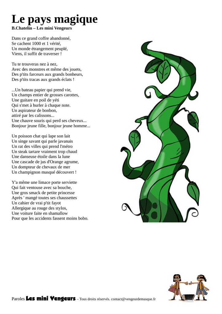 Le pays magique B.Chatelin – Les mini Vengeurs Dans ce grand coffre abandonné, Se cachent 1000 et 1 vérité, Un monde étrangement peuplé, Viens, il suffit de traverser ! Tu te trouveras nez à nez, Avec des monstres et même des jouets, Des p'tits farceurs aux grands bonheurs, Des p'tits tracas aux grands éclats ! ...Un bateau papier qui prend vie, Un champs entier de grosses carottes, Une guitare en poil de yéti Qui s'met à hurler à chaque note. Un aspirateur de bonbon, attiré par les calissons... Une chauve souris qui perd ses cheveux... Bonjour jeune fille, bonjour jeune homme... Un poisson chat qui lape son lait Un singe savant qui parle javanais Un rat des villes qui prend l'métro Un steak tartare vraiment trop chaud Une danseuse étoile dans la lune Une cascade de jus d'Orange agrume, Un dompteur de chevaux de mer Un champignon masqué découvert ! Y'a même une limace porte serviette Qui fait ventouse avec sa bouche, Une gros smack de petite princesse Après ' mangé toutes ses chaussettes Un cahier de vrai p'tit fayot Allergique au rouge des stylos, Une voiture faite en shamallow Pour que les accidents fassent moins bobo. Paroles Les mini Vengeurs – Tous droits réservés. [email protected] Le monstre du placard B.Chatelin – Les mini Vengeurs A chaque fois que la lumière s’éteint A chaque fois c'est le même refrain A chaque fois qu'on fait croire à tout le monde Oui que se cachent des enfants immondes... Quand il fait tout noir, Que la lune se ballade Quand il entend des bruits, au loin dans son placard Trouillomètre à zéro, lui il prend son doudou Il a peur d'aller voir ce qui fait son cauchemar. C'est un p'tit monstre un peu sensible Qui pleurniche à chaque fois que Un navet passe à la télé ou qu'on lui marche sur les pieds. C'est un grand fou sentimental A la tête pas vraiment banale Alors rien d'tel pour se cacher derrière l'placard pour s'lamenter. Le monstre du placard aurait-il peur du noir ? ...Le monstre du tiroir aurait-il peur du soir ? Tout seul dans son coin Il n'a pas l'air si bien, Il surveille à tout va Si un gamin passerait par là. Oh mon dieu...un enfant ! Avec des bras, des dents Un truc qui crie et qui rigole Quand il n'y a pas d'école. Il en a entendu parler, Dans l'histoire avant d'se coucher Ca l'étonnait vraiment pourtant Qu'il puisse exister des enfants Enfin il se décide, à ouvrir une paupière... A affronter ses peurs, pour dernière prière.... Il l'aperçoit enfin... Ce tout petit bambin... Finalement pas si terrifique, Il dort dans son lit le loustic ! Même qu'il pourrait être son copain En lui tendant doucement la main Pour faire les 400 coups à deux Comme des amis bien monstrueux ! Le monstre du placard, n'a plus très peur du noir ! … Le monstre du tiroir s'endort paisible le soir ! Paroles Les mini Vengeurs – Tous droits réservés. [email protected] Illegal B.Chatelin – Les mini Vengeurs Au 34 rue du grand mystère, Se trame une drôle d'affaire... Il était là près de mon lit Très rassurant comme toutes les nuits Mais au réveil plus de trace du tout Stop ! Qui a volé mon doudou ? Serait-ce un coup d'Bambin des bois Ou pire encore d'Arsène Lapin Une enquête pour le colonel Moutard Strop ! Que personne ne bouge ! Illégal, illégal, Qui a volé mon doudou ? Illégal, illégal, moi je le cherche partout ! Je le suis à l'odeur... Impossible qu'il m'échappe ! Le voleur qui kidnappe... N'a-t-il donc pas de cœur ? Ca y'est au loin je vois qui brille Son bouton qui lui sert de pupille Près de la machine à laver, Bon sang bien sur j'aurai du m'en douter ! Horreur, on l'a pendu inerte ! Sûrement bouleversé de m'avoir perdu sur la corde à linge tendue, Il sent étrangement si bon ! Illégal, illégal, Qui a volé mon doudou ? Illégal, illégal, moi je le cherche partout ! Paroles Les mini Vengeurs – Tous droits réservés. [email protected] Mamy B.Chatelin – Les mini Vengeurs Quand j'ai le blues comme un cafard, mamy Quand mon doudou trouve pas les mots Quand mon chagrin se perd sans fin, Moi je m'empresse de m'consoler Dans les bras chauds de ma mémé... Elle a toujours le mot pour rire, mamy Elle a toujours le mot pour dire, mamy Que je suis son p'tit roudoudou Son sucre d'orge, un point c'est tout... Elle dit qu'c'est la maman d'papa, mamy... Pourtant il est bien plus grand qu'elle, dady... Y'a tout l'monde qui dit q'j'lui ressemble, Mais j'suis un garçon, pas une fille ! Elle a des ch'veux trop rigolos, ma mamy... Gris comme le chat du vieux Raoul, mamy... Elle a toujours peur que j'm'écroule, Quand pépé me porte sur son dos. Elle me tricote même des chaussettes, mamy... Bien trop longues qui montent jusqu'aux fesses, mamy... Des pulls bizarres, elle me fait même Avec 3 manches, mais moi j'les aime ! Elle voit plus toujours très très bien, ma mamy... Moi j'crois plutôt qu'elle voit c'qu'elle veut, mamy. Quand elle gronde papy qui s'ressert 2 ou 3 lichées de dessert ! Elle oublie parfois même pour se promener, mamy... De quitter ses chaussons troués, mamy... Elle me fait même de bons petits plats Qu'l'on peut manger avec ses doigts ! Elle s'trompe souvent dans les portions ma mamy... Pour nourrir son petit poisson, mamy ! A ses 1 ans faire 10 kilos, C'est pas fréquent pour un macro. Elle rest'ra toujours dans mon cœur ma mamy... Qu'elle soit ici ou au paradis mamy......... Je n'oublierai jamais que j'voudrais, Un jour prochain lui ressembler... Un jour être comme ma mémé... Paroles Les mini Vengeurs – Tous droits réservés. [email protected] Pleureur 1er B.Chatelin – Les mini Vengeurs Sa seigneurie est avancée ! Laissez moi vous la présenter.... Cœur d'artichaut ou vrai madeleine Un rien le rend une âme en peine Le roi d'la chouine, du larmoiement, Il pleure tout l'temps c'est énervant ! Bob l'éponge a trouvé son maître c'est une terreur des bacs à sables Faut au moins 4 imperméables pour rester à moins de deux mètres Si tu veux d'venir son ami Pas d'a