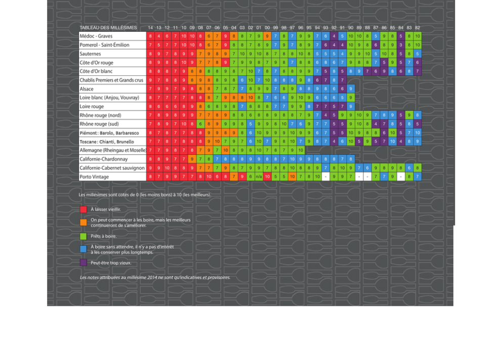 TABLEAU DES MILLÉSIMES 14 13 12 11 10 09 08 07 06 05 04 03 02 01 00 99 98 97 96 95 94 93 92 91 90 89 88 87 86 85 84 83 82 Médoc - Graves 8 4 6 7 10 10 8 6 7 9 8 8 7 9 9 7 8 7 9 9 7 6 4 5 10 10 8 5 9 8 5 8 10 Pomerol - Saint-Émilion 7 5 7 7 10 10 8 6 7 9 8 8 7 8 9 7 9 7 8 9 7 6 4 4 10 9 8 6 8 9 3 8 10 Sauternes 8 9 7 8 9 9 7 9 8 9 7 10 9 10 8 7 8 8 10 8 5 5 5 4 9 9 10 5 10 8 5 8 5 Côte d’Or rouge 8 9 8 8 10 9 7 7 8 9 7 9 9 8 7 9 8 7 8 8 6 8 6 7 9 8 8 7 5 9 5 7 6 Côte d’Or blanc 8 8 8 7 9 8 8 8 8 9 8 7 10 7 8 7 8 8 9 9 7 5 8 5 8 9 7 6 9 8 6 8 7 Chablis Premiers et Grands crus 9 7 8 8 9 8 9 8 8 9 8 6 10 7 10 8 8 8 9 8 6 7 8 7 Alsace 7 9 9 7 9 8 8 8 7 8 7 7 8 9 9 7 8 9 8 8 9 8 6 6 9 Loire blanc (Anjou, Vouvray) 8 7 7 7 7 8 8 8 7 9 8 8 10 8 7 6 6 9 10 9 6 6 6 5 9 Loire rouge 8 6 6 6 8 9 8 6 8 9 8 7 8 8 8 7 7 9 9 8 7 7 5 7 9 Rhône rouge (nord) 7 8 9 8 9 9 7 7 8 9 8 8 6 8 8 9 8 8 7 9 7 4 5 9 9 10 9 7 8 9 5 9 8 Rhône rouge (sud) 7 8 9 7 10 8 6 8 9 9 9 8 5 9 9 8 10 7 6 9 7 7 5 5 9 10 8 4 7 8 5 8 5 8 7 8 7 7 8 8 9 9 8 9 8 6 10 9 9 9 10 9 9 6 7 5 5 10 9 8 8 6 10 5 7 10 7 7 8 7 8 8 8 9 10 7 9 7 6 10 7 9 8 10 7 9 8 7 4 6 10 5 9 5 7 10 4 8 9 Allemagne (Rheingau et Moselle) 7 7 9 8 7 8 7 9 7 10 8 9 8 10 7 8 7 9 10 Californie-Chardonnay 8 8 9 7 7 9 7 8 7 8 8 8 9 9 8 8 7 10 9 9 8 8 8 7 8 Californie-Cabernet sauvignon 9 9 10 8 8 9 7 7 7 9 8 7 9 9 7 8 8 10 8 8 9 7 8 10 9 7 6 9 8 9 8 6 8 Porto Vintage 8 7 9 9 7 7 8 10 6 8 7 9 6 n/a 10 5 5 10 7 8 10 - 9 9 7 - - 7 7 9 - 8 7 Les millésimes sont cotés de 0 (les moins bons) à 10 (les meilleurs). À laisser vieillir. On peut commencer à les boire, mais les meilleurs continueront de s’améliorer. Prêts à boire. À boire sans attendre, il n’y a pas d’intérêt à les conserver plus longtemps. Peut-être trop vieux. Les notes attribuées au millésime 2014 ne sont qu’indicatives et provisoires.