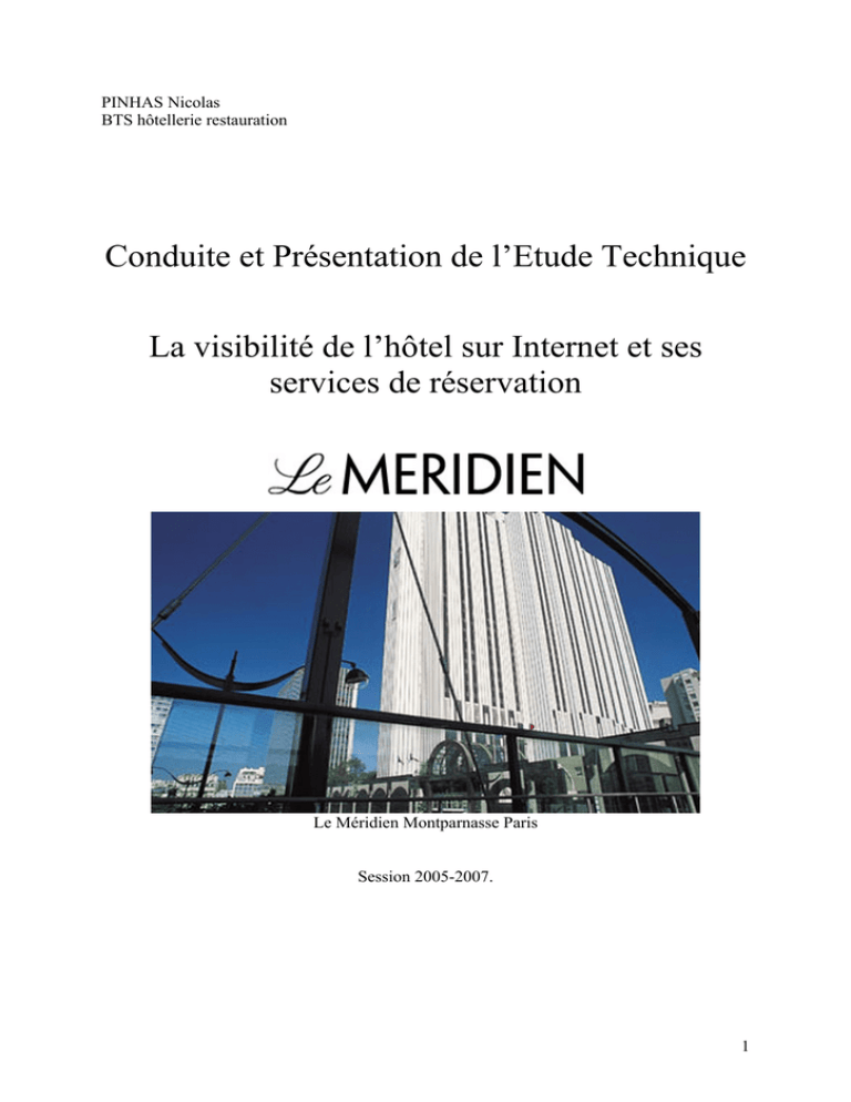PINHAS Nicolas BTS hôtellerie restauration Conduite et Présentation de l’Etude Technique La visibilité de l’hôtel sur Internet et ses services de réservation Le Méridien Montparnasse Paris Session 2005-2007. 1 2 SOMMAIRE : 1 : Remerciements p4 2 : Introduction générale p5 3 : Documents officiels p6 4 : Compte-rendu de stage 4.1 : Sommaire du compte-rendu de stage p8 p9 5 : Etude technique 5.1 : Sommaire de l’étude technique p 21 p 22 6 : Conclusion générale p 41 7 : Annexes p 42 8 : Index p 45 3 1 : REMERCIEMENTS Je tiens remercier l’équipe hébergement du Méridien Montparnasse, grâce à qui j’ai pu bénéficier d’une réelle immersion dans le monde professionnel hôtelier. Je remercie plus particulièrement mon chef de service Mr Lebeau ainsi que ses assistants Messieurs Julien Bernabé, Thomas Séchet et Anthony Lutran qui m’ont apporté toutes les connaissances, le savoir et l’attitude professionnelle nécessaire pour arriver au terme de mon stage. De plus, je remercie aussi mes professeurs Mme Aufray (gestion) et Mme Kisselef (français) qui m’ont guidées dans l’élaboration de mon dossier professionnel. 4 2 : INTRODUCTION GENERALE Après avoir passé un an en tant qu’apprenti serveur en restauration pour mon BEP, j’avais pour souhait en 2005 de faire ma formation dans l’hébergement afin d’étendre et diversifier mes connaissances pour le BTS. Appréciant la pratique des langues étrangères, plus particulièrement de l’anglais, et dans l’optique de le parfaire, mon choix s’est orienté vers les hôtels parisiens de catégorie internationale. De plus, j’ai préféré en premier lieu les gros porteurs pour leur bonne réputation quant à leur organisation interne qui illustre parfaitement les exemples que nous avons en cours. J’ai donc postulé en tant que réceptionniste pour plusieurs hôtels comme le Sofitel porte de Sèvres, le Sofitel Bercy, le Concorde Lafayette, … et le Méridien Montparnasse s’est montré particulièrement intéressé par ma candidature. Le Méridien Montparnasse correspondant tout à fait à mes attentes, j’ai été ravi d’apprendre que je pourrai faire ma formation par alternance avec cet hôtel. C’est un hôtel quatre étoile situé à la limite des 6è, 14è et 15è arrondissements de Paris dans le quartier de la gare Montparnasse. Cet hôtel est classé dans la catégorie des gros porteurs parisiens avec ses 953 chambres aménagées dans un immeuble de grande hauteur (116 mètres). Faisant parti du grand groupe hôtelier américain Starwood, le Méridien Montparnasse à une réputation internationale. Il est indispensable pour un hôtel de cette envergure d’être rapidement reconnu, identifié par la clientèle. C’est pourquoi nous devons mettre en avant une image attirante de l’hôtel sur Internet. Et ce, parce que grâce aux dernières innovations technologiques, les habitudes des consommateurs ont évoluées. En effet, il est maintenant fréquent de préparer son séjour à l’étranger via Internet depuis son bureau ou son salon. L’étude technique de ce dossier portera donc sur la visibilité de l’hôtel sur Internet et les démarches de réservation. 5 3 : DOCUMENTS OFFICIELS 6 7 Compte-rendu de stage 8 4.1 : SOMMAIRE DU COMPTE RENDU DE STAGE 4.2 : Introduction du compte-rendu p 10 4.3 : Présentation du Méridien Montparnasse 4.3.1 : L’histoire de la chaîne 4.3.2 : Valeurs de la chaîne 4.3.3 : L’histoire du Méridien Montparnasse 4.3.4 : L’immeuble 4.3.5 : La clientèle 4.3.6 : Les produits 4.3.7 : Les concurrents de l’hôtel 4.3.8 : L’organigramme p 10 p 10 p 11 p 11 p 12 p 13 p 14 p 17 p 18 4.4 : Déroulement du stage 4.4.1 : Poste de réceptionniste caissier, son rôle, ses enjeux 4.4.2 : Poste de réceptionniste de nuit, night audit p 19 p 19 p 20 4.5 : Conclusion du compte-rendu p 20 9 4.2 : INTRODUCTION DU COMPTE-RENDU Après avoir envoyé plusieurs candidatures aux différents hôtels gros porteurs parisiens, j’ai obtenu quatre entretiens d’embauche courant Août 2005. Ces entretiens d’embauche concernaient les hôtels St-Jacques (faisant partie du groupe Accor à cette période), Sofitel Bercy, Méridien Etoile et Méridien Montparnasse. Après mes différents entretiens j’ai eu une réponse positive de la part du Sofitel Bercy et du Méridien Montparnasse. J’ai choisi le Méridien Montparnasse en raison de sa proximité géographique vis-à-vis de mon adresse. Durant ma première journée le 1er Septembre 2005, j’ai participé avec les autres apprentis commençant en même temps que moi à la journée d’accueil. Durant cette journée nous avons eu une présentation de l’hôtel et de ses différents services suivis d’une visite de chaque service puis la formation incendie avec les pompiers. Comme pendant la journée d’accueil, je vais vous présenter dans ce compte rendu le Méridien Montparnasse, puis le déroulement de mon stage. 4.3 : PRESENTATION DU MERIDIEN MONTPARNASSE 4.3.1 : L’histoire de la chaîne A la veille de la mise en service des boeings 747 les moyens hôteliers de Paris étant insuffisants pour accueillir une clientèle internationale, la Compagnie Nationale Air France créa en 1970 un département hôtelier en vue de l’implantation d’un hôtel de 1000 chambres dans Paris. 1970 : Le département fut transformé en société filiale, sous le nom de Hôtel France International. Celle-ci fusionna en 1972 avec Relais Aériens Français créés en 1948 par Air France pour remédier à l’insuffisance de l’équipement hôtelier en Afrique, et devint la société des Hôtels Méridiens. 1972 : Le premier hôtel ouvre ses portes : le Méridien Etoile à Paris. En 1974 ouvrent les hôtels de Nice, Guadeloupe, et Martinique suivi en 1975 par ceux de Rio, le Caire et Montréal. 1976 : La compagnie double sa capacité avec 16 ouvertures d’hôtels et 8 projets au MoyenOrient, 4 en Afrique et 3 en Europe. En 1980, le Mér