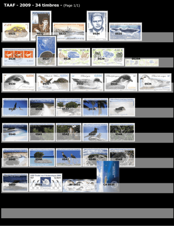 TAAF - 2009 - 34 timbres - (Page 1/1) 0521 0522 0526 0527 0530 0531 0523 0524 0528 0525 0529 0532 0529A 0533 0535 0536 0537 0538 0539 0540 0541 0542 0543 0544 0545 0546 0547 0548 0549 0550 0551 BF 0022 CA 0535 0534