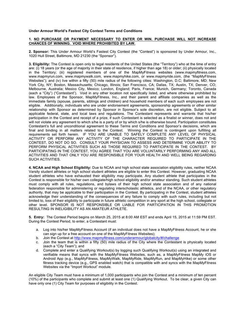 2. Sponsor: This Under Armour World’s Fastest City Contest (the “Contest”) is sponsored by Under Armour, Inc.,