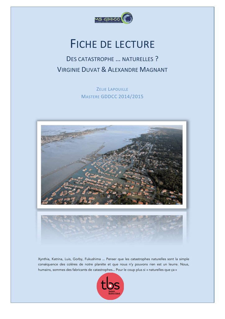 FICHE DE LECTURE DES CATASTROPHE … NATURELLES ? VIRGINIE DUVAT & ALEXANDRE MAGNANT Z ELIE L APOUILLE M ASTERE GDDCC 2014/2015 Xynthia, Katrina, Luis, Gorby, Fukushima … Penser que les catastrophes naturelles sont la simple conséquence des colères de notre planète et que nous n’y pouvons rien est un leurre. Nous, humains, sommes des fabricants de catastrophes… Pour le coup plus si « naturelles que ça » TABLE DES MATIERES CONTEXTE .................................................................................................................................................................. 3 POURQUOI AVOIR CHOISI CE LIVRE ? ................................................................................................................ 3 LES AUTEURS ............................................................................................................................................................. 3 VIRGINIE DUVAT : ............................................................................................................................................................................ 3 ALEXANDRE MAGNAN : ................................................................................................................................................................... 3 RESUME DU LIVRE .................................................................................................................................................... 4 CHAPITRE 1 : DEFINIR LES ORIGINES DU DANGER ..................................................................................................................... 4 CHAPITRE 2: EXTREME PAUVRETE ET ALEAS NATURELS AU BANGLADESH ........................................................................ 5 CHAPITRE 3 : LA FRANCE DANS LA TEMPETE « XYNTHIA » ................................................................................................... 6 CHAPITRE 4 : KATRINA OU LE CAUCHEMAR AMERICAIN .......................................................................................................... 7 CHAPITRE 5 : LE CYCLONE LUIS A SAINT-‐MARTIN ................................................................................................................... 8 CHAPITRE 6 : DEROUTE AU « PAYS DES TSUNAMIS » : LE JAPON FACE A LA CATASTROPHE DE 2011 ............................ 9 CHAPITRE 7 : APRES LE TSUNAMI DE 2004, QUELLE RESILIENCE POUR LES MALDIVES ? ............................................. 11 CHAPITRE 8 : LES ETATS CORALLIENS DU PACIFIQUE ENTRE RISQUES PASSES, ACTUELS ET FUTURS ......................... 12 CHAPITRE 9 : CONCLUSION ......................................................................................................................................................... 14 DANS L’ACTUALITE… .................................................................................................................................................................... 14 Fiche de lecture – Mastère GDDCC 2014/2015 – Zélie Lapouille 2 CONTEXTE Le XXIème siècle a été bouleversé par de nombreuses catastrophes naturelles qui ont engendrés des conséquences sur la vie humaine importantes. Est-ce uniquement la colère de la nature ou bien l’homme a-t-il une part de responsabilité ? Comment peut-on comprendre les évènements récents et éviter les conséquences de ceux à venir ? POURQUOI AVOIR CHOISI CE LIVRE ? Face au choix d’un livre, plusieurs œuvres m’ont séduites et j’ai choisi ce livre pour deux raisons : • Premièrement, je suis issue d’une formation scientifique et technique durant laquelle je n’ai jamais eu d’enseignements sur le changement climatique, les catastrophes naturelles, ou les sciences de la Terre. Ce livre m’a permis d’enrichir mes connaissances sur le domaine. • De plus, je suis personnellement intéressée par les causes et les effets des catastrophes, notamment celle de Fukushima. En effet, Fukushima a été pour moi un évènement déclencheur dans ma réflexion sur les nouveaux enjeux environnementaux. Ainsi, ce livre est alors l’occasion pour moi de me forger une idée sur une question que je me pose depuis la catastrophe de Fukushima : quel rôle l’homme a-t-il joué dans ces catastrophes LES AUTEURS VIRGINIE DUVAT : Elle est chercheuse en géographie des littoraux tropicaux mais elle est aussi professeur de géographie à l’université de La Rochelle (Laboratoire LIENS-CNRS). Spécialiste des milieux tropicaux, ses thèmes de recherche principaux sont : • • • la géomorphologie, risques liés à la mer et aménagement les impacts du changement climatique sur les littoraux tropicaux la gestion de l’environnement littoral Par ailleurs, Virginie est membre du GIEC, du comité scientifique du programme Littoral de la Fondation de France ainsi que du comité scientifique de la Stratégie nationale de gestion intégrée du trait de côte. ALEXANDRE MAGNAN : Il est docteur en géographie et chercheur à l’IDDRI de Sciences Po au sein duquel il travaille sur les littoraux. Alexandre Magnan est spécialiste des questions de vulnérabilité et d’adaptation au changement climatique, notamment dans le contexte du changement climatique. Ensemble, ils ont aussi écrit Ces îles qui pourraient disparaître, aux éditions Essais le pommier, qui a reçu le prix Jean Rostand en 2014. Fiche de lecture – Mastère GDDCC 2014/2015 – Zélie Lapouille 3 RESUME DU LIVRE Ce livre défend l’idée que « les catastrophes naturelles sont produites pas la société », ou du moins, le fait qu’elles passent d’un évènement à une catastrophe est une conséquence des activités de l’homme et des choix faits par les sociétés. Certains scientifiques refusent le terme de catastrophe « naturelle » : en effet, la catastrophe « naturelle » ne l’est que pour les êtres humains qui subissent les conséquences de l’évènement. Dans la catastrophe, plusieurs paramètr