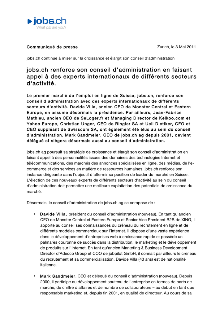 Communiqué de presse Zurich, le 3 Mai 2011 jobs.ch continue à miser sur la croissance et élargit son conseil d'administration jobs.ch renforce son conseil d'administration en faisant appel à des experts internationaux de différents secteurs d'activité. Le prem ier m arché de l'em ploi en ligne de Suisse, jobs.ch, renforce son conseil d'adm inistration avec des experts internationaux de différents secteurs d'activité. Davide Villa, ancien CEO de M onster Central et Eastern Europe, en assum e désorm ais la présidence. Par ailleurs, Jean-Fabrice M athieu, ancien CEO de SeLoger.fr et M anaging Director de Kelkoo.com et Yahoo Europe, Christian Unger, CEO de Ringier SA et Ueli Dietiker, CFO et CEO suppléant de Swisscom SA, ont égalem ent été élus au sein du conseil d'adm inistration. M ark Sandm eier, CEO de jobs.ch ag depuis 2001, devient délégué et siègera désorm ais aussi au conseil d'adm inistration. jobs.ch ag poursuit sa stratégie de croissance et élargit son conseil d'administration en faisant appel à des personnalités issues des domaines des technologies Internet et télécommunications, des marchés des annonces spécialisées en ligne, des médias, de l'ecommerce et des services en matière de ressources humaines. jobs.ch renforce son instance dirigeante dans l’objectif d'affermir sa position de leader du marché en Suisse. L'élection de ces nouveaux experts de différents secteurs d'activité au sein du conseil d'administration doit permettre une meilleure exploitation des potentiels de croissance du marché. Désormais, le conseil d'administration de jobs.ch ag se compose de : • Davide Villa, président du conseil d'administration (nouveau). En tant qu'ancien CEO de Monster Central et Eastern Europe et Senior Vice President B2B de XING, il apporte au conseil ses connaissances du créneau du recrutement en ligne et de différents modèles commerciaux sur l’Internet. Il dispose d'une vaste expérience dans le développement d'entreprises web à croissance rapide et possède un palmarès couronné de succès dans la distribution, le marketing et le développement de produits sur l'Internet. En tant qu'ancien Marketing & Business Development Director d’Adecco Group et COO de jobpilot GmbH, il connait par ailleurs le créneau du recrutement et sa commercialisation. Davide Villa (43 ans) est de nationalité italienne. • M ark Sandm eier, CEO et délégué du conseil d'administration (nouveau). Depuis 2000, il participe au développement soutenu de l'entreprise en termes de parts de marché, de chiffre d'affaires et de nombre de collaborateurs – au début en tant que responsable marketing et, depuis fin 2001, en qualité de directeur. Au cours de sa longue carrière dirigeante chez jobs.ch, il a contribué de façon déterminante à l'ancrage d'une culture d'entreprise ouverte et entrepreneuriale parmi les collaborateurs. Mark Sandmeier (38 ans) est de nationalité suisse. • Jean-Fabrice M athieu (nouveau). Au cours de sa longue activité de CEO, il a fait de la plateforme SeLoger.fr le leader du marché parmi les places de marché immobilières en ligne de France. Il possède des connaissances éprouvées dans le développement d'entreprise d’organisations à forte croissance. Au travers du rôle de Managing Director de Kelkoo.com et Yahoo Europe qu'il a assumé autrefois, il apporte au conseil d'administration de jobs.ch de riches connaissances sur les différents modèles commerciaux en ligne. Jean-Fabrice Mathieu (49 ans) est de nationalité française. • Christian Unger (depuis début février 2011), CEO de Ringier SA. Expert de la branche médiatique et grand connaisseur du commerce des annonces, il apporte, en tant qu'ancien CEO de MIH Internet Europa B.V. et responsable de l'ensemble des activités Internet d'Europe, une grande expérience dans l’e-commerce et de précieuses connaissances de nombreux modèles de commerce en ligne. Christian Unger (44 ans) est de nationalité allemande. • Ueli Dietiker (nouveau) est CFO et CEO suppléant de Swisscom SA et il était auparavant CEO de Cablecom. Il apporte des connaissances supplémentaires en termes de finances et de solides relations dans le monde des finances. Ueli Dietiker (58 ans) est de nationalité suisse. • Lee Fixel (actuel), Managing Director de l'actionnaire principal Tiger Global Investment Partners. Lee Fixel siège au conseil d'administration de jobs.ch ag depuis le milieu de l'année 2007. Il apporte à l'entreprise une grande expérience dans le domaine des firmes web et bénéficie de nombreux contacts importants avec les connaisseurs de la branche. Lee Fixel (31 ans) est de nationalité américaine. Mark Sandmeier, CEO et délégué du conseil d'administration de jobs.ch ag: «Nous sommes fiers d'avoir gagné pour notre conseil d'administration ces éminents experts de différents secteurs d'activité. Nous travaillons continuellement à des produits innovants, basés sur les dernières technologies, afin d'offrir le plus d'efficience possible aux recruteurs et aux demandeurs d'emploi. Après avoir conclu différents partenariats stratégiques – notamment avec XING et Scout24 – il est logiquement temps de continuer à professionnaliser notre organisation et notre conseil d'administration.» Davide Villa, président du conseil d'administration de jobs.ch ag: «jobs.ch possède une équipe de management expérimentée et bien rôdée, qui peut se vanter d’un bilan couronné de succès. Le nouveau conseil d'administration, doté de vastes relations, donnera à l'organisation un élan supplémentaire. Sur le marché suisse, en comparaison d'autres pays européens, il existe un besoin de rattrapage en termes de recrutement en ligne. Les -2- possibilités de croissance sont donc très grandes. Je suis persuadé que nous avons les têtes, les idées, la faculté de réalisation et aussi, en tant que leader du marché, le potentiel de faire bouger les choses sur le marc