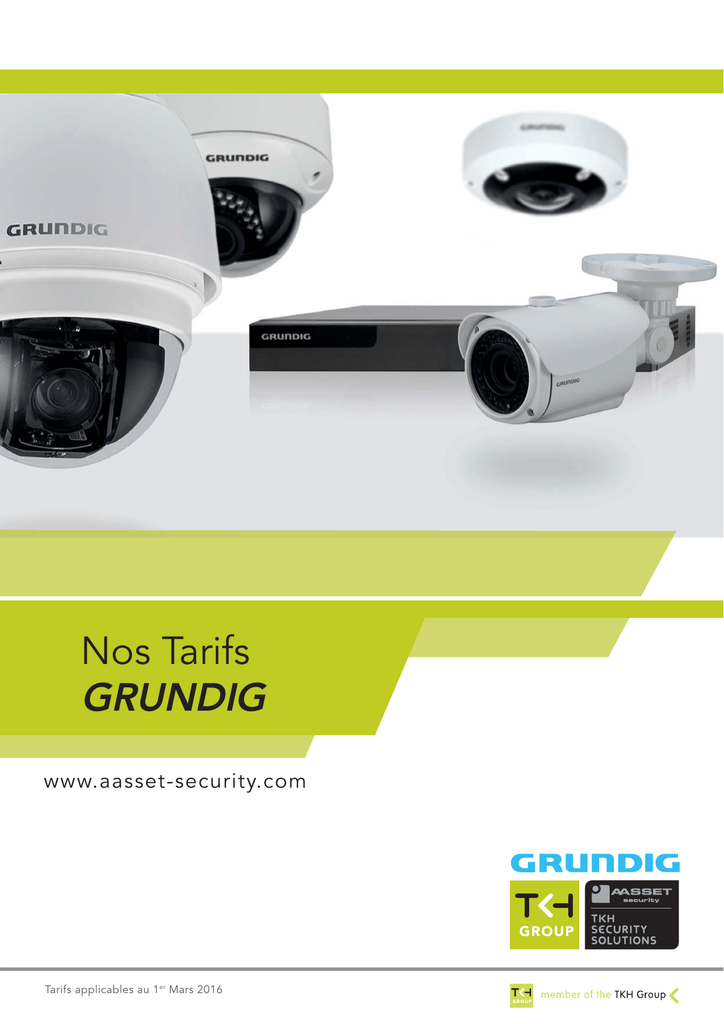 Nos Tarifs GRUNDIG www.aasset-security.com Tarifs applicables au 1er Mars 2016 VOS INTERLOCUTEURS NOS ÉQUIPES DE PROFESSIONNELS SONT LÀ POUR VOUS Être disponibles et vous accompagner au quotidien dans vos projets, notre priorité Département Commercial La valeur ajoutée de ce service est la compréhension globale de vos besoins et enjeux, en vous apportant les réponses adéquates. Un réseau de 7 agences régionales, sur l’hexagone, en synergie avec les autres départements (projet, technique, marketing, financier…) pour accompagner plus de 10 000 clients et partenaires, au quotidien. 95 78 92 75 93 94 62 77 59 91 80 76 02 08 60 50 14 27 51 57 55 22 29 28 35 53 56 10 72 45 49 21 39 71 86 90 03 17 01 23 87 16 33 07 46 47 12 26 30 84 04 34 31 13 83 64 65 09 Caroline LEDOUX : 06 08 22 97 69 [email protected] Raphael BRIAND : 06 74 08 70 95 [email protected] 06 81 32 Jean-Philippe TANT : 06 08 18 00 37 [email protected] 05 48 82 40 38 43 15 Rémi PIQUARD : 06 70 94 13 18 [email protected] Benoit GARAT : 06 79 97 46 68 [email protected] 73 19 24 74 42 69 63 Guillaume BARIN : 06 89 95 48 91 [email protected] 25 58 36 79 68 70 37 18 85 88 52 89 41 44 67 54 61 Pierrick URREA : 06 71 58 30 33 [email protected] 11 66 DÉVELOPPEMENT NORD, IDF, EST Raphaël VIRGOLINO : 06 45 58 11 96 [email protected] DÉVELOPPEMENT GRAND SUD Laurent SCETBON : 06 74 88 58 40 [email protected] Administration des ventes Au service de nos clients, nous veillons au bon traitement de vos commandes, tarifications, et délais au quotidien. Gestion des Commandes : +33 (0)1 30 76 30 30 [email protected] Département Systèmes L’équipe systèmes travaille de concert avec l’équipe commerciale, dans l’objectif d’accompagner nos partenaires installateurs et intégrateurs, depuis l’avant-projet, jusqu’à la mise en œuvre du déploiement. Département Technique Département Production Département Administratif et financier Des ingénieurs et techniciens vous assistent au quotidien, dans l’accompagnement technique, l’assistance lors de l’installation, et la maintenance des systèmes. Via ce service, nous vous proposons une offre de prestations de services adaptée à vos besoins (hotline / assistance technique / gestion des projets). Notre priorité est de vous proposer des produits innovants, de grande qualité, à des prix compétitifs. La disponibilité des produits est également un réel enjeu, au quotidien, pour vous satisfaire, en fonction de vos demandes. Le service administratif et financier s’attache à comprendre vos besoins et spécificités. En relation étroite avec tous les autres départements, dont les services commercial et projets, notre engagement et notre expertise vous apporteront un service de qualité et de solutions adaptées. SAV +33 (0)1 30 76 39 82 [email protected] Hotline Technique +33 (0)1 30 76 62 27 [email protected] Logistique +33 (0)1 30 76 30 30 [email protected] SOMMAIRE TARIF GRUNDIG GAMME VIDEO ANALOGIQUE & HD-TVI CAMERAS Caméras box Caméras bullet Dômes fixes Dômes PTZ Caméra portable ENREGISTREURS Analogiques hybrides IP Disques durs & accessoires enregistreurs ENCODEURS & DECODEURS Encodeurs P.4 ACCESSOIRES DE FIXATION CAMERAS FIXES & PTZ Supports de montage Bulles Alimentations & Divers Moniteurs Supports moniteurs P.5 SERVICES Assistance technique Formations Maintenance Frais & Divers P.7 P.8 P.9 GAMME VIDEO IP CAMERAS Caméras box Caméras bullet Dômes fixes Dômes PTZ Caméras fisheye ENREGISTREURS NVR Disques durs & accessoires enregistreurs P.6 P.7 3 GAMME VIDEO ANALOGIQUE & HD-TVI Catégories Référence CAMERAS Désignation Prix Utilisateur (€ H.T.) Code R (Accessoires p.8) Caméras box ANALOGIQUE GCAB0305B Caméra box 650/700LTV C/NB CCD 1/3" ICR C/CS 0,001lx - 12/24V 159,00 A ANALOGIQUE GCAB0005B Caméra box 650/700LTV C/NB CCD 1/3" ICR C/CS 0,001lx - 230Vca 159,00 A ANALOGIQUE GCAB1302B Caméra box 650LTV SDN 1/3" C/CS 0,01lx - 12/24V 178,00 A ANALOGIQUE GCAB1002B Caméra box 650LTV SDN 1/3" C/CS 0,01lx - 230Vca 187,00 A ANALOGIQUE GCAB1305B Caméra box 650/700LTV WDR ICR 1/3" C/CS 0,001lx - 12/24V 241,00 A ANALOGIQUE GCAB1005B Caméra box 650/700LTV WDR ICR 1/3" C/CS 0,001lx - 230Vca 256,00 A 94,00 A 397,00 A Caméras bullet Objectif fixe HD-TVI GCTK0123T Bullet HD-TVI 2MP Full HD ICR obj 3.6mm LedIR 25m IP66 12Vcc Objectif varifocale HD-TVI GCTK2326T Bullet HD-TVI 2MP WDR ICR VF 2.8-12mm LedIR 40m IP66 12/24V HD-TVI GCTK1326T Bullet HD-TVI 2MP WDR ICR VF 2.8-12mm LedIR 20m IP66 12/24v 241,00 A ANALOGIQUE GCAB2326T Bullet 650/700LTV ICR VF 2.8-12mm LedIR 30/45m IP66 - 12/24V 377,00 A ANALOGIQUE GCAB2357T Bullet 650/700LTV WDR ICR Zoom 10x 3,8-38mm LedIR 30/45m IP66 12/24V 446,00 A ANALOGIQUE GCAB3326T Bullet 650/700LTV ICR VF 5-50mm LedIR 45/70m IP66 - 12/24V 460,00 A Dômes fixes Intérieur Extérieur Mini-dômes eyeball 4 HD-TVI GCTK2326D Dôme HD-TVI 2MP WDR ICR VF 2.8-12mm LedIR 15/30m - 12/24V 296,00 A ANALOGIQUE GCAB4322D Dôme 650LTV SDN VF 2,8-12mm 0,8lx - 12/24V 187,00 A ANALOGIQUE GCAB4325D Dôme 650/700LTV WDR ICR VF 2,8-10,5mm 0,5lx - 12/24V 253,00 A ANALOGIQUE GCAB4326D Dôme 650/700LTV ICR VF 2,8-12mm LedIR 15/30m - 12/24V 224,00 A ANALOGIQUE GCAB4327D Dôme 650/700LTV WDR ICR VF 2,8-10,5mm LedIR 20/40m - 12/24V 273,00 A ANALOGIQUE GCAH0325D Dôme 1000LTV WDR ICR VF 2,8-12mm LedIR 15/30m - 12/24V 257,00 A HD-TVI GCTK2326V Dôme HD-TVI 2MP WDR ICR VF 2.8-12 LedIR15m IP66/IK10 12/24V 365,00 A HD-TVI GCTK1326V Dôme HD-TVI 2MP WDR ICR VF 2.8-12 LedIR25m IP66/IK10 12/24V 241,00 A ANALOGIQUE GCAB4323V Dôme 650/700LTV ICR VF 2,8-12mm 0,8lx IP67/IK10 - 12/24V 261,00 A ANALOGIQUE GCAB4325V Dôme 650/700LTV WDR ICR VF 2,8-10,5mm 0,5lx IP67/IK10 - 12/24V 302,00 A ANALOGIQUE GCAB4326V Dôme 650/700LTV ICR VF 2.8-12mm LedIR 15/30m IP67/IK10 - 12/24V 285,00 A ANALOGIQUE GCAB4327V Dôme 650/700LTV WDR ICR VF 2,8-10,5mm LedIR 15/30m IP67/IK10 - 12/24V 336,00 A ANALOGIQUE GCAB5325V Dôme 650/700LTV WDR ICR VF 9-22mm 0,6lx IP67/IK10 - 12/2