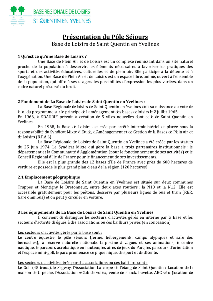 Présentation du Pôle Séjours Base de Loisirs de Saint Quentin en Yvelines 1 Qu’est ce qu’une Base de Loisirs ? Une Base de Plein Air et de Loisirs est un complexe réunissant dans un site naturel proche de la population à desservir, les éléments nécessaires à favoriser les pratiques des sports et des activités éducatives, culturelles et de plein air. Elle participe à la détente et à l’oxygénation. Une Base de Plein Air et de Loisirs est un espace libre, animé, ouvert à l’ensemble de la population, qui offre à ses usagers les possibilités d’expression les plus variées, dans un cadre naturel préservé du bruit. 2 Fondement de La Base de Loisirs de Saint Quentin en Yvelines : La Base Régionale de loisirs de Saint Quentin en Yvelines doit sa naissance au vote de la loi du programme sur le principe de l'aménagement des bases de loisirs le 2 juillet 1965. En 1966, la SDAURIF prévoit la création de 5 villes nouvelles dont celle de Saint Quentin en Yvelines. En 1968, la Base de Loisirs est crée par arrêté interministériel et placée sous la responsabilité du Syndicat Mixte d'Etude, d'Aménagement et de Gestion de la Bases de Plein air et de Loisirs (B.P.A.L) La Base Régionale de Loisirs de Saint Quentin en Yvelines a été créée par les statuts du 25 juin 1974. Le Syndicat Mixte qui gère la base a trois partenaires institutionnels : le département et la Communauté d’Agglomération (pour le fonctionnement de ses activités) et le Conseil Régional d’Ile de France pour le financement de ses investissements. Elle est la plus grande des 12 bases d’Ile de France avec près de 600 hectares de verdure et possède le plus grand plan d’eau de la région (120 hectares). 2.1 Emplacement géographique La Base de Loisirs de Saint Quentin en Yvelines est située sur deux communes Trappes et Montigny le Bretonneux, entre deux axes routiers : la N10 et la N12. Elle est accessible gratuitement pour les piétons, desservi par plusieurs lignes de bus et train (RER, Gare omnibus) et on peut y circuler en voiture. 3 Les équipements de La Base de Loisirs de Saint Quentin en Yvelines Il convient de distinguer les secteurs d’activités gérés en interne par la Base et les secteurs d’activité délégués à des associations ou des bailleurs privés (en concession). Les secteurs d’activités gérés par la base sont : Le centre équestre, le pôle séjours (ferme, hébergements, camps atypiques et salle des bernaches), la réserve naturelle nationale, la piscine à vagues et ses animations, le centre nautique, le parcours acrobatique en hauteur, les aires de jeux du Parc, les parcours d’orientation et l’espace mini-golf, le parc promenade de pique nique, de sport et de détente. Les secteurs d’activités gérés par des associations ou des bailleurs sont : Le Golf (45 trous), le Segway, l’Association La carpe de l’étang de Saint Quentin : Location de la maison de la pêche, l’Association «Club de voile», vente de snack, buvette, ABC vélo (location de vélos), de rosalies et de quads, le manège, le restaurant les Alizés, le karting, les champs agricoles. 4 Schéma Directeur de la Base de Loisirs: - Promouvoir des actions au service du plus grand nombre, basées sur des principes de responsabilité, de mixité sociale, de respect. - Permettre l’investigation de chaque partenaire institutionnel et associatif et groupement d’usagers, dans chaque projet, dans chaque action de loisirs et d’éducation 4.1 Objectifs Généraux « Animation / Education » de la Base de Loisirs : - Multiplier et diversifier les activités innovantes, d’éveil, de découverte afin de faire découvrir les espaces et les activités sport/culture/loisirs au plus grand nombre. - Observer et analyser la manière dont les usagers utilisent l’espace et les activités misent à leur disposition afin d’y répondre au mieux en adaptant certains éléments d’aménagement et les méthodes d’animation. - Etre un point de convergence d’actions de loisirs et d’éducation pour tous ceux qui travaillent en direction de l’enfance, de la jeunesse et de la famille. - Mettre en place des initiatives qui permettront à chacun de profiter du potentiel éducatif contenu dans nos activités. Il s’agit en effet de rendre le champ libre accessible à chacun, tout en préservant sa spécificité. 5 Le Pôle Séjours : Le Pôle Séjours est un Service de la Base de Loisirs qui a pour mission d’accueillir tout type de groupes et de publics pour des séjours éducatifs, de loisirs, atypiques, familiaux, de travail, de regroupements, courts ou long, ainsi que de proposer des séances d’animation et de découverte autour du monde animal et végétal. 5.1 Les objectifs éducatifs du Pôle Séjours Permettre à chacun, petits et grands, de s’épanouir par la pratique et la découverte d’un espace original. Faciliter et Permettre l‘accueil de tous. Diversifier l’ensemble de nos prestations et la qualité de nos services. Permettre à chacun d’intégrer les règles de vie, les valeurs essentielles. Favoriser les partenariats, les échanges et encourager les réseaux éducatifs. Faciliter une démarche de découverte et d’enrichissement de l’autre : monde humain, monde animal et monde végétal. 5.2 Le Relais des Canardières Cet équipement de 84 lits accueille en chambre de 2 ou 4, les associations, les écoles, les entreprises, les familles, les centres de loisirs pour tout type de séjours. Avec ou sans activités, on peut s’y restaurer (restaurant 300 couverts possibles par service), y travailler (salle de réunion) ou s’y détendre (forêt, aire de jeux et étang à proximité). Le Relais des Canardières est déclaré auprès de L’Education Nationale : IA78-310113 (accueil des mineurs à partir de 3 ans), auprès de Jeunesse et Sport : 078 621 024, et le dernier passage de la Commission de Sécurité date du 13 décembre 2011. 5.3 La Ferme Pédagogique 