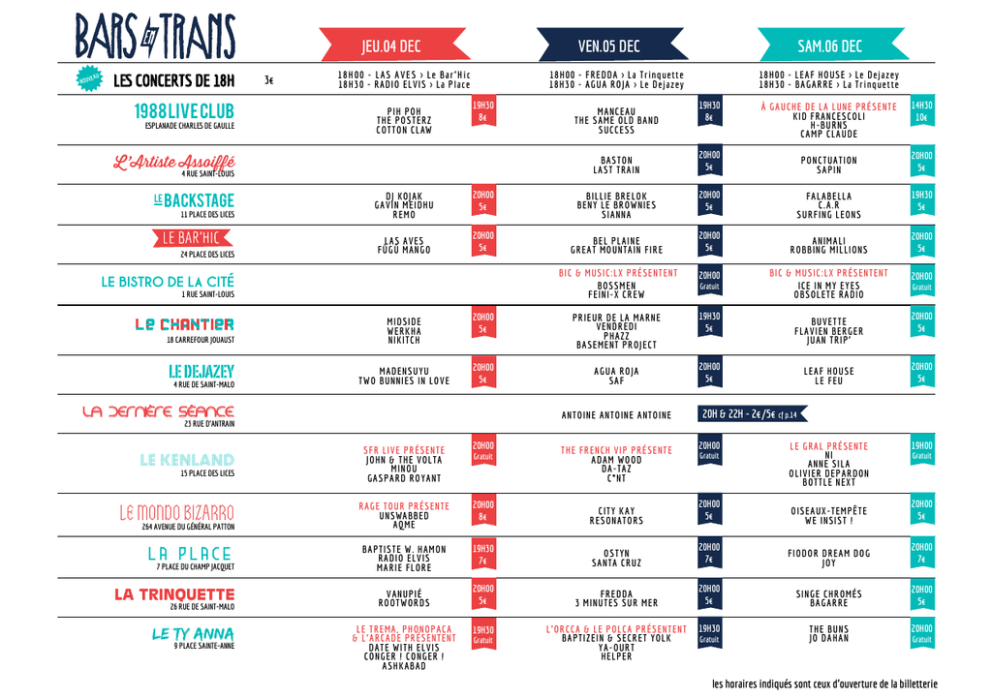 JEU.04 DEC EAU NOUV LES CONCERTS DE 18H 1988 LIVE CLUB ESPLANADE CHARLES DE GAULLE 3€ VEN.05 DEC 18H00 - LAS AVES > Le Bar’Hic 18H 30 - RA DIO ELV IS > La Place PIH POH THE POSTERZ COTTON CLAW 1 8 H0 0 - F R E D D A > La T ri nq ue t t e 1 8 H3 0 - A GUA R OJ A > Le D e jaz e y 19H30 8€ L ’Artiste Assoiffé 4 RUE SAINT-LOUIS LE SAM.06 DEC MA N C E A U T HE S A ME OL D BA N D S UC C E S S 1 8 H0 0 - L E A F HOUS E > Le D e j a ze y 1 8 H3 0 - BA GA R R E > La T r i n qu e tte 19H30 8€ À GA UC HE D E L A L UN E P RÉ S E N T E K ID F RA N C E S C O L I H-BUR N S C A MP C L A UDE 14H30 10€ BA S T ON L A S T T RA IN 20H00 5€ PON C T UA T ION S A PIN 20H00 5€ 11 PLACE DES LICES DJ KOJA K G A V IN MEIDH U REMO 20H00 5€ BIL L IE BR E L OK BE N Y L E BR OW N IE S S IA N N A 20H00 5€ F A L A BE L L A C.A.R S UR F IN G L E ONS 19H30 5€ 24 PLACE DES LICES LA S A V ES FÙG Ù MA NG O 20H00 5€ BE L PL A IN E GR E A T MOUN TA IN F IR E 20H00 5€ A N IMA L I R OBBIN G MIL L IO N S 20H00 5€ BIC & MUS IC : L X PR É S E N T E N T IC E IN MY E YES OBS OL E T E RA DI O 20H00 BACKSTAGE BIC & MUS IC : L X PR É S E N T E N T BOS S ME N F E IN I-X C R E W 20H00 20H00 5€ PR IE UR D E L A MA R N E VENDREDI PHA Z Z BA S E ME N T PR OJ E C T 19H30 5€ 20H00 5€ A GUA R OJ A SAF 20H00 5€ LE BISTRO DE LA CITÉ 1 RUE SAINT-LOUIS 18 CARREFOUR JOUAUST LE DEJAZEY 4 RUE DE SAINT-MALO MIDSIDE WERK HA NIK ITCH MA DENSUYU TWO B UNNIES IN L OV E LA DERNIÈRE SÉANCE A N T OIN E A N T OIN E A N T OIN E 23 RUE D’ANTRAIN LE KENLAND 15 PLACE DES LICES LE MONDO BIZARRO 264 AVENUE DU GÉNÉRAL PATTON LA PLACE 7 PLACE DU CHAMP JACQUET LA TRINQUETTE 26 RUE DE SAINT-MALO LE TY ANNA 9 PLACE SAINTE-ANNE Gratuit BUV E T T E F L A V IE N BE R GE R J UA N T R IP’ L E A F HOUS E LE FEU Gratuit 20H00 5€ 20H00 5€ 20H & 22H - 2€/5€ cf p.14 20H00 19H00 SFR LIV E PRÉSEN T E JOH N & TH E V OL TA MINOU G A SPA RD ROYAN T 20H00 RA G E TOU R P R ÉSE NTE UNSWA B B ED A QME 20H00 8€ C IT Y K A Y R E S ON A T OR S 20H00 5€ OIS E A UX -T E MP Ê T E W E IN S IS T ! 20H00 5€ B A PTISTE W. H A MON RA D I O ELV I S MA RIE FLOR E 19H30 7€ OS T YN S A N TA C R UZ 20H00 7€ F IOD OR D R E A M D O G J OY 20H00 7€ V A NUPIÉ ROOTWORDS 20H00 5€ FREDDA 3 MIN UT E S S UR ME R 20H00 5€ S IN GE C HR OMÉS BA GA R R E 20H00 5€ T HE BUN S J O D A HA N 20H00 LE TREMA , PH ONOPA C A & L’A RCA DE PRÉSE N T E N T DA TE WITH ELVIS CONG ER ! CONG E R ! A SH K A B A D Gratuit 19H30 Gratuit T HE F R E N C H V IP PR É S E N T E A D A M W OOD D A -TA Z C*NT L ’ OR C C A & L E POL C A PR É S E N T E N T BA PT IZ E IN & S E C R E T YOL K YA -OUR T HE L PE R Gratuit 19H30 Gratuit L E GRA L PR É S EN T E NI A N N E S IL A OL IV IE R D E PA R D O N BOT T L E N E X T Gratuit Gratuit les horaires indiqués sont ceux d’ouverture de la billetterie