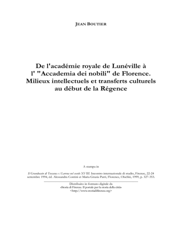 JEAN BOUTIER De l'académie royale de Lunéville à l' "Accademia dei nobili" de Florence. Milieux intellectuels et transferts culturels au début de la Régence A stampa in Il Granducato di Toscana e i Lorena nel secolo XVIII. Incontro internazionale di studio, Firenze, 22-24 settembre 1994, éd. Alessandra Contini et Maria Grazia Parri, Florence, Olschki, 1999, p. 327-353. ________________________________________________________ Distribuito in formato digitale da «Storia di Firenze. Il portale per la storia della città» <http://www.storiadifirenze.org> 1 Colloque "Il Granducato di Toscana e i Lorena" Florence, 23 septembre 1994 Jean Boutier De l'académie royale de Lunéville à l' "Accademia dei nobili" de Florence. Milieux intellectuels et transferts culturels au début de la Régence* 1. Dans l'un des tout premiers numéros de ses Novelle Letterarie, daté de janvier 1740, Giovanni Lami annonce l'ouverture à Florence d'une nouvelle académie pour jeunes nobles : "Il dì primo del corrente mese di Gennaio si aperse in questa città l'Accademia dei Nobili trasferitavi di Nansì per ordine del Nostro Real Sovrano, nella quale hanno già cominciato a leggere le scienze, e professare le arti, i diversi Maestri, che sono stati eletti a questo effetto, cioè di Mattematica, d'Ius Pubblico, d'Istoria, di Fortificazioni, di Fisica, di Cavallerizza, Scherma, Ballo, Lingua Franzese, Italiana, e Tedesca. Si spera che vi concorrerà la Nobiltà di diverse Nazioni straniere, atteso lo splendido trattamento, e la comodità di esercitarsi con tutta la perfezione nelle arti cavalleresche. Si dara per l'avvenire più distinto ragguaglio della costituzione e regolamento della medesima."1 L'annonce peut a priori étonner puisque Florence, depuis 1689, était déjà dotée d'une institution semblable ; certes, celle-ci avait connu depuis quelques années des difficultés financières, mais elle n'avait pas pour autant fermé ses portes2. Cette "ouverture" est en fait l'une des nombreuses conséquences de l'arrivée d'un nouveau souverain en Toscane, qui entend non seulement gouverner, mais aussi installer dans la capitale toscane une partie de sa Maison et des personnes qui l'entourent. C'est ainsi qu'est transférée à Florence l'académie de Lunéville, créée par le duc Léopold de Lorraine en 1699, soit dix ans après celle de Florence3 ; après une période d'alternance, au gré des circonstances politiques, entre Lunéville et Nancy, elle était installée depuis * Je tiens particulièrement à remercier Alessandra Contini et André Courbet pour les importantes informations qu'ils m'ont très généreusement communiquées. 1 Novelle Letterarie, I, n°4, 22 janvier 1740, col. 49 ; l'information est signalée par Giuseppe Gasperoni, "Di alcune fonti essenziali per la storia della cultura in Toscana nel secolo XVIII", Atti della Società Colombaria fiorentina, XIII-XV, 1934-1937, p. 120. Quelques semaines plus tard, les Novelle Letterarie confirment que les professeurs ont "incominciato le loro lezioni", Novelle Letterarie, I, n°10, 4 mars 1740, col. 150. 2 Cf. Jean Boutier, "L' « Accademia dei Nobili » di Firenze. Sociabilità ed educazione dei giovani nobili negli anni di Cosimo III", in La Toscana di Cosimo III. Atti del convegno Pisa-San Domenico di Fiesole (FI) 4-5 giugno 1990, a cura di F. Angiolini, V. Becagli, M. Verga, Florence, EDIFIR, 1993, p. 205-224. 3 Règlement pour l'Académie qui sera établie à Nancy, capitale de la Lorraine, le mois de may de la présente année 1699, imprimé, 4 p., Bibliothèque municipale de Nancy, ms. 392, f°s 60-61. 2 1725 dans l'Hôtel des Pages de Lunéville, et était dirigée depuis 1730 par le baron Ulrich von Schack4. Au lendemain des préliminaires de Vienne, signés en avril 1736, le duc François-Étienne entreprend de déplacer sa maison à Bruxelles, ainsi que son académie noble5. Le transfert est loin d'être immédiat, puisque la convention qui fixe les conditions de la cession de la Lorraine n'est signée que le 28 août 1736, et que François Etienne fait traîner la cession de la Lorraine elle-même jusqu'en février 17376. Si le projet de déplacement de l'académie de Nancy à Bruxelles existe bel et bien dès 17367, aucun témoignage en revanche ne nous est parvenu sur l'ouverture de l'académie royale à Bruxelles, où une académie existait, plus ou moins régulièrement, depuis le début du XVIIe siècle, jusqu'à sa stabilisation en 16718. Quelques mois plus tard, en juillet 1737, arrive la nouvelle de la mort de Jean-Gaston de Médicis, grand-duc de Toscane ; François-Étienne prend alors rapidement les dispositions pour prendre possession de son nouvel état et, d'Anvers, fait envoyer à Livourne ses bagages ; le personnel de la Maison ne tarde pas à suivre. Le cabinet de physique de Lunéville est ainsi placé dans une salle du palais Pitti9 ; la bibliothèque ducale part aussi –en partie du moins– pour la 4 5 6 7 8 9 Norbert Conrads, Ritterakademien der frühen Neuzeit. Bildung als Standesprivileg im 16. und 17. Jahrhundert, Göttingen, Vandenhoeck & Ruprecht, 1982, p. 227-230. Charles VI avait promis, dès mars 1736, le gouvernement des Pays-Bas autrichiens au duc François III de Lorraine, qui l'aurait exercé en attendant sa prise de possession en Toscane : L. Bittner, Chronologisches Verzeichnis der österreichischen Staatsverträge, Vienne, 1903, I, p. 158, cité par Henri Pirenne, Histoire de Belgique, Bruxelles, H. Lamartin, I, 1920, p. 244. L'exercice d'une telle charge paraît toutefois peu probable, malgré ce qu'affirme Hubert Collin ("François Etienne, dernier duc de Lorraine (1729-1737) et premier empereur de la maison de Lorraine-Habsbourg (1745-1765)", in Jean-Paul Bled, Eugène Faucher, René Taveneaux (éd.), Les Habsbourg et la Lorraine. Actes du colloque international, Nancy, 22-24 mai 1987, Nancy, Presses Universitaires de Nancy, 1988, p. 154), puisque l'archiduchesse Marie-Elisabeth, gouvernant