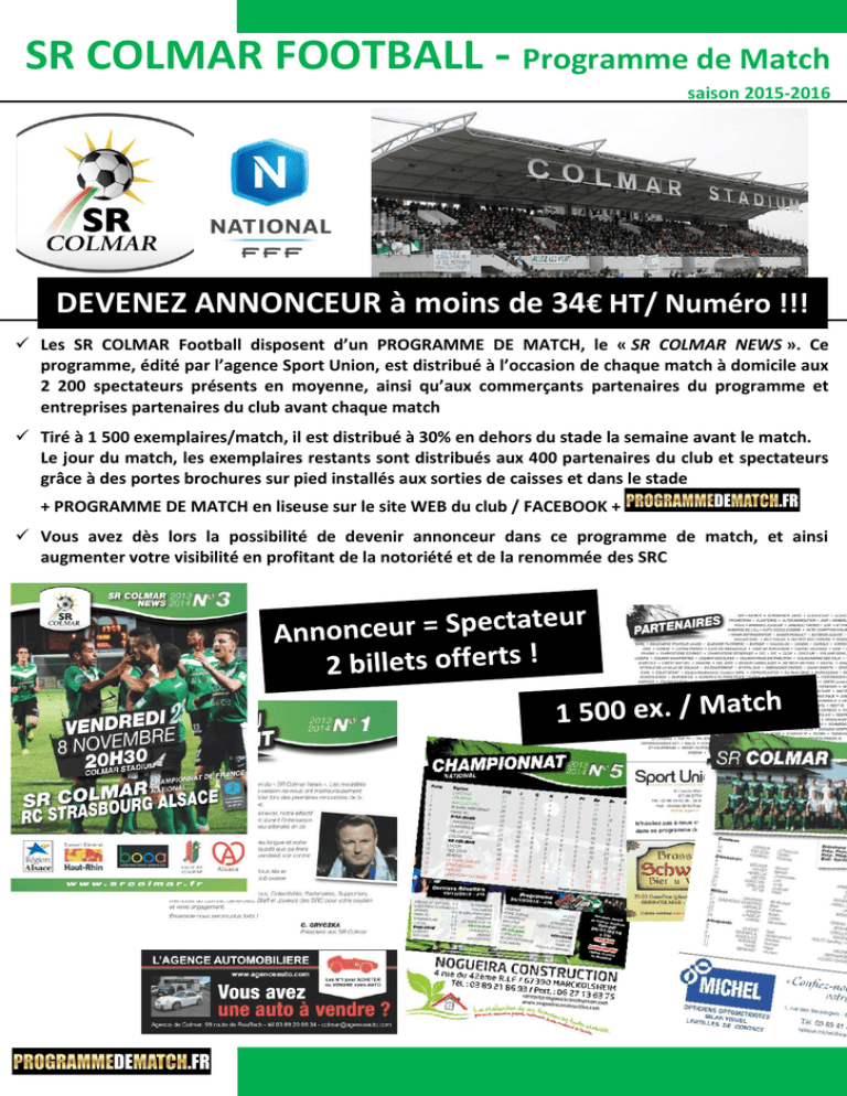 SR COLMAR FOOTBALL - Programme de Match saison 2015-2016 DEVENEZ ANNONCEUR à moins de 34€ HT/ Numéro !!! Les SR COLMAR Football disposent d’un PROGRAMME DE MATCH, le « SR COLMAR NEWS ». Ce programme, édité par l’agence Sport Union, est distribué à l’occasion de chaque match à domicile aux 2 200 spectateurs présents en moyenne, ainsi qu’aux commerçants partenaires du programme et entreprises partenaires du club avant chaque match Tiré à 1 500 exemplaires/match, il est distribué à 30% en dehors du stade la semaine avant le match. Le jour du match, les exemplaires restants sont distribués aux 400 partenaires du club et spectateurs grâce à des portes brochures sur pied installés aux sorties de caisses et dans le stade + PROGRAMME DE MATCH en liseuse sur le site WEB du club / FACEBOOK + Vous avez dès lors la possibilité de devenir annonceur dans ce programme de match, et ainsi augmenter votre visibilité en profitant de la notoriété et de la renommée des SRC LES OFFRES DU PROGRAMME DEMI-SAISON 2015-2016 SR COLMAR NEWS N°9 le 15 Janvier 2016 contre BOULOGNE 9 matchs à domicile = 9 programmes de matchs DERBY INCLUS CONTRE LE RC STRASBOURG ALSACE (N°12) du 11/03/2016 !! Format de l’insertion Taille de l’insertion Tarifs HT pour les 9 Numéros demi-saison 2015/2016 1/8 ème de page 74 X 52,5 mm 320€ HT / demi-saison ¼ de page 74 X 105 mm ou 148 mm X 52,5 mm 575€ HT / demi-saison ¼ de page VIP (unique annonceur sur la page) 148 mm X 52,5 mm 650€ HT/ demi-saison ½ page 148 X 105 mm 1100€ HT/ demi-saison 1 page 148 X 210 mm 1 650€ HT/ demi-saison sous EQUIPE ADVERSE, CLASSEMENT, MOT DU CLUB P3 Un escompte de 5% sur les tarifs ci-dessus est accordé en cas de paiement intégral à la signature du bon de commande En devenant annonceur, vous bénéficiez de 2 billets par match de championnat à domicile pour la saison 2015-2016 des SR COLMAR (National) CONTACT Nicolas DENTZ 06.86.04.08.38 [email protected] Tél : 03.88.43.52.36 Fax : 09.81.38.87.59 Calendrier SR COLMAR 2015 / 2016 N° Programme DATES 1 2 3 4 5 6 7 8 9 10 11 12 13 14 15 16 17 07-août-15 Colmar Chambly 14-août-15 Boulogne Colmar 21-août-15 Colmar Chateauroux 28-août-15 Marseille Consolat Colmar 04-sept-15 Colmar Luçon 11-sept-15 Avranches Colmar 18-sept-15 Colmar Bastia CA 25-sept-15 Strasbourg Colmar 02-oct-15 Colmar Belfort 16-oct-15 Dunkerque Colmar 30-oct-15 Colmar Orléans 06-nov-15 Béziers Colmar 20-nov-15 Colmar Les Herbiers 27-nov-15 Sedan Colmar 11-déc-15 Colmar Fréjus St Raphaël 18-déc-15 Epinal Colmar 08-janv-16 Amiens Colmar 15-janv-16 Colmar Boulogne 29-janv-16 Chateauroux Colmar 05-févr-16 Colmar Marseille Consolat 12-févr-16 Luçon Colmar 19-févr-16 Colmar Avranches 04-mars-16 Bastia CA Colmar 11-mars-16 Colmar Strasbourg 18-mars-16 Belfort Colmar 01-avr-16 Colmar Dunkerque 08-avr-16 Orléans Colmar 15-avr-16 Colmar Béziers 22-avr-16 Les Herbiers Colmar 29-avr-16 Colmar Sedan 06-mai-16 Fréjus St Raphaël Colmar 13-mai-16 Colmar Epinal 27-mai-16 Colmar Amiens 03-juin-16 Chambly Colmar
