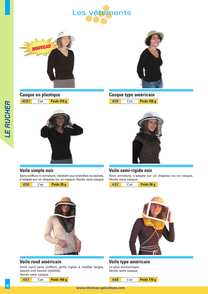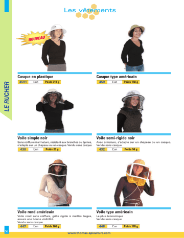 Les vêtements U NOUVEA LE RUCHER Casque en plastique 4591 459 Poids 210 g L’un Poids 150 g Voile simple noir Voile semi-rigide noir Sans coiffure ni armature, résistant aux branches ou épines, s’adapte sur un chapeau ou un casque. Vendu sans casque Avec armature, s’adapte sur un chapeau ou un casque. Vendu sans casque 430 L’un 432 Poids 20 g L’un Poids 50 g Voile rond américain Voile type américain Voile rond sans coiffure, grille rigide à mailles larges, assure une bonne visibilité. Vendu sans casque Le plus économique Vendu sans casque 447 56 L’un Casque type américain L’un Poids 160 g 448 www.thomas-apiculture.com L’un Poids 170 g Masque Le Protect type américain Masque américain Avec coiffure et armature, mais pliant. Souple tombant sur les épaules. Cordon de maintien à ceinturer. Vendu sans casque 435 L’un Couvre les épaules, double armature et élastiques sous les bras. L’un L’un Poids 260 g Voile avec chapeau Voile rond avec coiffure 446 449 Poids 220 g 377 L’un Poids 210 g Poids 200 g Voile rond avec coiffure et armature Voile Gauthier avec coiffure Avec passage pour les bras. Chapeau à armature. Tamis nylon. 438 L’un LE RUCHER Les vêtements Poids 250 g 434 L’un www.thomas-apiculture.com Poids 250 g 57 Les vêtements Gants cuir LE RUCHER Souples mais très résistants, toutes tailles y compris pour les enfants. B10-5/6 5/6 ans Poids 120 g B10-7/8 7/8 ans Poids 150 g B10-9/10 9/10 ans Poids 150 g B10-7 Taille 7 Poids 160 g B10-8 Taille 8 Poids 170 g B10-9 Taille 9 Poids 190 g B10-10 Taille 10 Poids 190 g B10-11 Taille 11 Poids 200 g B10-12 Taille 12 Poids 200 g dultes a s e l l i Ta nts et enfa mique o n o c é Le plus Gants cuir Gants cuir type américain Excellent rapport qualité/prix Grande souplesse de travail Longueur manchette coton 22 cm Modèle professionnel en cuir souple avec manchette en toile épaisse assurant une parfaite protection de l’utilisateur. La bande ventilée apporte un confort de travail appréciable en été. 439-7 Taille 7 Poids 150 g 439-8 Taille 8 Poids 160 g 439-9 Taille 9 Poids 170 g 439-10 Taille 10 Poids 190 g 439-11 Taille 11 Poids 190 g 442 Taille 9 Poids 280 g 440 Taille 10 Poids 300 g Gants synthétiques avec manchettes coton Modèle très confortable. Taille unique 10. Gants cuir hydrofuge Gants cuir avec manchette. Modèle sans aération 378-9 Taille 9 Poids 160 g 378-10 Taille 10 Poids 180 g 378-11 Taille 11 Poids 200 g 441-9 Taille 9 Poids 120 g 441-10 Taille 10 Poids 120 g ges Hydrofu Modèle avec aération 58 Gants latex 379-9 Taille 9 Poids 180 g 379-10 Taille 10 Poids 200 g 379-11 Taille 11 Poids 220 g Renforcé avec manchette coton et bande de tricot (longueur environ 45 cm). Très confortable et résistant. 444-8 Taille 8 Poids 215 g 444-9 Taille 9 Poids 215 g 444-10 Taille 10 Poids 215 g www.thomas-apiculture.com Les vêtements d’apiculture Vareuse simple avec gants Vareuse simple sans gant 474-L Taille L Poids 420 g 475-L Taille L Poids 480 g 474-XL Taille XL Poids 490 g 475-XL Taille XL Poids 550 g 475-XXL Taille XXL Poids 620 g 474-XXL Taille XXL Poids 530 g Avec armature complémentaire Existe avec une armature complémentaire au niveau de la coiffure afin de maintenir le voile éloigné du visage. LE RUCHER Idem ci-contre avec gants cuir cousus aux poignets et poche ventrale. Zip d’ouverture au poignet droit pour libérer la main. Vareuse coton blanc, souple et légère à porter par dessus des vêtements. Élastiques aux poignets et à la taille. légère ” “ e m Gam ique ” m o n o c et “ é 702-L Taille L Poids 500 g 703-L Taille L Poids 560 g 702-XL Taille XL Poids 580 g 703-XL Taille XL Poids 640 g 702-XXL Taille XXL Poids 760 g U NOUVEA Pantalon 703-XXL Taille XXL Poids 840 g enfants s e l r u Po Combinaison pour enfants En coton blanc léger, élastique réglable à la taille, élastique simple aux chevilles. Poche à outils latérale. Combinaison en coton blanc avec voile cousu à l’arrière pour ne laisser qu’un minimum d’ouverture et ainsi optimiser la sécurité. Élastiques aux poignets et aux chevilles. Ceinture réglable. 2 poches à la taille. 476-L Taille L Poids 380 g B11-4/6 476-XL Taille XL Poids 480 g B11-7/10 Taille 7 à 10 ans Poids 750 g 476-XXL Taille XXL Poids 520 g B11-11/13 Taille 11 à 13 ans Poids 800 g Taille 4 à 6 ans B11-S Taille S Poids 600 g Poids 960 g Gants réf. B10 pour enfants Voir page 58 www.thomas-apiculture.com 59 Les vêtements d’apiculture Pour répondre aux attentes de nos clients apiculteurs, nous avons élaboré une gamme de vêtements avec un excellent rapport qualité/prix. La combinaison “ SUPER PROTECT ” est confectionnée en coton blanc léger avec un zip aux chevilles. Élastique de serrage à la taille. Bourrelet au col pour adapter tous types de voile. Élastiques aux poignets et chevilles. Deux poches poitrine et deux latérales. LE RUCHER Combinaison Super Protect Vendue sans voile B21-L Taille L Poids 1,3 kg B21-XL Taille XL Poids 1,4 kg B21-XXL Taille XXL Poids 1,5 kg U NOUVEA Voile Super Protect Double armature, élastique de serrage sous les bras. B22 L’un Poids 100 g Vareuse super éclair Vareuse en coton blanc léger avec une armature complète éloignant le voile du visage. La coiffe est totalement détachable pour un nettoyage sans dommage. Poche ventrale. Élastique serre-tête, aux poignets et à la taille. AVEC GANTS COUSUS AUX POIGNETS SANS GANT 60 1498-L Taille L Poids 780 g 1402-L Taille L Poids 840 g 1498-XL Taille XL Poids 870 g 1402-XL Taille XL Poids 930 g 1498-XXL Taille XXL Poids 990 g 1402-XXL Taille XXL Poids 1,1 kg www.thomas-apiculture.com Les vêtements d’apiculture Vêtement coton blanc avec voile 360° à double armature entièrement détachable pour un nettoyage facile. Une poche poitrine, 2 poches à la taille. Blouson “ super pro ” Vareuse “ super pro ” B18-M Taille M Poids 780 g B20-M Taille M Poids 770 g B18-L Taille L Poids 810 g B20-L Taille L Poids 800 g B1