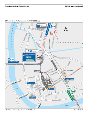 Direktanfahrt Eventhalle MCH Messe Basel HAU SST RASS ERST nd RAS SE BASL ZOLL ASSE DOUANE WI SSE E ES BADE E NSTR E ERST RASS FREIB S ER RG BE CH HO URGE RSTRA GÄRT N INH ÜN ING ER STR ASS KLE Deut s FST DOR NEU chla Messe Checkpoint 3 aus R. E GPS: vis-à-vis Riehenstrasse 70, CH-4058 Basel T RA SS E BAZ Messe Basel-Kl’hüningen Riehen MAUERSTRASSE Messe THOMY FAS A NE NS TRA SSE EE FRANK NW DA RE HO SC SC AR HW EN M R E LLE SSE ke h Sc RHEIN We tt MCH Messe Schweiz (Basel) AG | CH-4005 Basel ste inb rüc ke wa rzw GRENZACHERSTRA iz we Rebgasse rüc A EIN ch W T TS ET Messe b ald EG FW MER 2 RI TPETER-RO H RIE sse Me tz pla Messeturm H5 A TR NS E EH Bad. Bad. Bahnhof Bahnhof 1 E SS STRASSE EN H2 H4 A NT E OS E SS RA T LS T AT IST EIN E RA ST E SS R. RST G RIN ExpoShop HAM SE AS BG RE E EH RI rS 5 E SS RA T NS de B O CL A CL SE AS TR S RA E ASS STR C LA R AH AR AG B RA ST UG TZ AH DR SE S RA BAD. BAHNHOF s au re tle ke rüc H1 BL R. ST E ICH E Claramatte RHEIN Mit RIEHENRING T RS ER SP 4 R. EN Joh H3 cke ü E SS RA ST N SE LE AS TR ER US A ÖN SE SCH AS TR RS E BE UL MA Stand: 01.2011 DS EN LM SSE STRA BERG AL Musical Theater FELD rbr AL ZW HORBURGSTRASSE SE KLYBECKSTRAS Dreirosenbrücke ite ann EG LL aus Frankreich TR AS SE