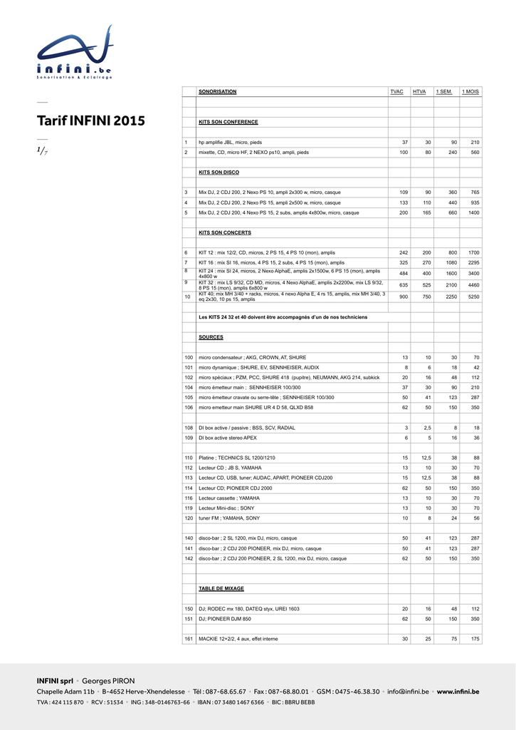 SONORISATION Tarif INFINI 2015 1/7 TVAC HTVA 1 SEM. 1 MOIS KITS SON CONFERENCE 1 hp amplifie JBL, micro, pieds 2 mixette, CD, micro HF, 2 NEXO ps10, ampli, pieds 37 30 90 210 100 80 240 560 KITS SON DISCO 3 Mix DJ, 2 CDJ 200, 2 Nexo PS 10, ampli 2x300 w, micro, casque 109 90 360 765 4 Mix DJ, 2 CDJ 200, 2 Nexo PS 15, ampli 2x500 w, micro, casque 133 110 440 935 5 Mix DJ, 2 CDJ 200, 4 Nexo PS 15, 2 subs, amplis 4x800w, micro, casque 200 165 660 1400 KITS SON CONCERTS 6 KIT 12 : mix 12/2, CD, micros, 2 PS 15, 4 PS 10 (mon), amplis 242 200 800 1700 7 KIT 16 : mix SI 16, micros, 4 PS 15, 2 subs, 4 PS 15 (mon), amplis 325 270 1080 2295 8 KIT 24 : mix SI 24, micros, 2 Nexo AlphaE, amplis 2x1500w, 6 PS 15 (mon), amplis 4x800 w KIT 32 : mix LS 9/32, CD MD, micros, 4 Nexo AlphaE, amplis 2x2200w, mix LS 9/32, 8 PS 15 (mon), amplis 6x800 w KIT 40; mix MH 3/40 + racks, micros, 4 nexo Alpha E, 4 rs 15, amplis, mix MH 3/40, 3 eq 2x30, 10 ps 15, amplis 484 400 1600 3400 635 525 2100 4460 900 750 2250 5250 13 10 30 70 8 6 18 42 48 112 9 10 Les KITS 24 32 et 40 doivent être accompagnés d’un de nos techniciens SOURCES 100 micro condensateur ; AKG, CROWN, AT, SHURE 101 micro dynamique ; SHURE, EV, SENNHEISER, AUDIX 102 micro spéciaux ; PZM, PCC, SHURE 418 (pupitre), NEUMANN, AKG 214, subkick 20 16 104 micro émetteur main ; SENNHEISER 100/300 37 30 90 210 105 micro émetteur cravate ou serre-tête ; SENNHEISER 100/300 50 41 123 287 106 micro emetteur main SHURE UR 4 D 58, QLXD B58 62 50 150 350 108 DI box active / passive ; BSS, SCV, RADIAL 3 2,5 8 18 109 DI box active stereo APEX 6 5 16 36 110 Platine ; TECHNICS SL 1200/1210 15 12,5 38 88 112 Lecteur CD ; JB S, YAMAHA 13 10 30 70 113 Lecteur CD, USB, tuner; AUDAC, APART, PIONEER CDJ200 15 12,5 38 88 114 Lecteur CD; PIONEER CDJ 2000 62 50 150 350 116 Lecteur cassette ; YAMAHA 13 10 30 70 119 Lecteur Mini-disc ; SONY 13 10 30 70 120 tuner FM ; YAMAHA, SONY 10 8 24 56 140 disco-bar ; 2 SL 1200, mix DJ, micro, casque 50 41 123 287 141 disco-bar ; 2 CDJ 200 PIONEER, mix DJ, micro, casque 50 41 123 287 142 disco-bar ; 2 CDJ 200 PIONEER, 2 SL 1200, mix DJ, micro, casque 62 50 150 350 TABLE DE MIXAGE 150 DJ; RODEC mx 180, DATEQ styx, UREI 1603 20 16 48 112 151 DJ; PIONEER DJM 850 62 50 150 350 161 MACKIE 12+2/2, 4 aux, effet interne 30 25 75 175 INFINI sprl • Georges PIRON Chapelle Adam 11b • B-4652 Herve-Xhendelesse • Tél : 087-68.65.67 • Fax : 087-68.80.01 • GSM : 0475-46.38.30 • [email protected] • www.infini.be TVA : 424 115 870 • RCV : 51534 • ING : 348-0146763-66 • IBAN : 07 3480 1467 6366 • BIC : BBRU BEBB SONORISATION Tarif INFINI 2015 2/7 TVAC HTVA 1 SEM. 1 MOIS 162 MACKIE 16+2/2, 4 aux, effet interne 50 41 123 287 163 YAMAHA 01V (12+2/2, 4 aux, effets internes) 62 50 150 350 164 SOUNDCRAFT SI 16 + rack 16/8 + cable cat5 100 82 246 574 165 MIDAS venice (24+4/4/2, 6 aux) 100 82 246 574 166 SOUNDCRAFT SI 24c + rack 32/8 + cable cat5 180 150 450 1050 167 YAMAHA LS 9/32 180 150 450 1050 168 YAMAHA QL5 250 200 600 1400 169 SOUNDCRAFT MH 3/40, (40 in + 4v st, 12 aux, 8 vca) 370 300 900 2700 170 SOUNDCRAFT VI 4 avec racks (48 in, 24 bus) 600 500 1500 3500 RACKS 171 Rack CD MD ; lecteur CD, lecteur enregistreur MD 30 25 75 175 172 Rack 16 25 20 60 140 37 30 90 270 8 comp. DBX, 4 gate DRAWMER 62 50 150 350 Rack 40 37 30 90 270 6 comp. DRAWMER, 6 gate DRAWMER 90 75 225 525 Rack EQ : 3 eq 2x30 ; BSS, ALTAIR 62 50 150 350 56 sources : MD, CD effets/inserts : réverb. TC M one, 3 dble comp./gate DBX 166 173 Rack 24 sources/control : MD, CD, Eq APEX 230, DBX 4800 effets/inserts : TC M 3000, TC M 2000 174 sources/control : MD, CD, Eq APEX 230, DBX 4800 effets/inserts : LEXICON PCM 96, TC M 2000, TC D two, YAMAHA SPX 990 176 MULTIPAIRES 180 8 à 12 paires, 10 à 15 m 10 8 24 181 16+4 paires 30 m 13 10 30 70 182 24+8 paires 40 m 25 20 60 140 183 40+8 paires 60 m 37 30 90 270 184 40+8 paires 80 m 62 50 150 350 185 2x cat5, 2x xlr, 1x 220v 25 20 60 140 186 2x cat5, 1x 12paires, 1x 220v 62 50 150 350 en 40 ou 60m EFFETS ET INSERTS 189 Multi-effets ; TC el. M 3000, M 2000, LEXICON PCM 70, PCM 96 45 37 111 260 190 Multi-effets ; TC el. M one, YAMAHA SPX 990 37 30 90 270 192 Delay ; TC el. D two 25 20 60 140 195 Compresseurs, gate ; DRAWMER 241 – 201, DBX 166 20 16 48 112 197 Egaliseur 2x30 ; APEX, ALTAIR, BSS 25 20 60 140 199 Processeur DBX 4800 50 40 120 280 8 6 18 42 DIVERS 200 Casque ; SENNHEISER, BEYER 210 IN EAR SHURE PSM 600 37 30 90 270 219 Emetteur FM 20w (sous reserve d’autorisation) 37 30 90 270 INTERCOM INFINI sprl • Georges PIRON Chapelle Adam 11b • B-4652 Herve-Xhendelesse • Tél : 087-68.65.67 • Fax : 087-68.80.01 • GSM : 0475-46.38.30 • [email protected] • www.infini.be TVA : 424 115 870 • RCV : 51534 • ING : 348-0146763-66 • IBAN : 07 3480 1467 6366 • BIC : BBRU BEBB SONORISATION Tarif INFINI 2015 3/7 TVAC HTVA 1 SEM. 1 MOIS 220 Base + casque 25 20 60 140 221 Belt-pack + casque 10 8 24 42 224 lampe flash 5 4 12 28 225 alimentation réseau 5 4 12 28 226 Walkie talkie KENWOOD 3301 15 12,5 30 88 AMPLIS : puissance en 2 x 8 ohms 244 rack 3600/5000; CROWN 3600 + CROWN 5000 + proc NEXO nx 241 60 50 150 350 248 rack 5000/5000; 2x CROWN 5000 + proc NEXO nx 242 75 60 180 540 249 rack 4000/4000; 2x LAB 4000 + proc NEXO nx 242 75 60 180 540 250 4x550w NEXO 4x1 50 40 120 280 251 4x1300w NEXO 4x4 75 60 180 540 255 1x200w : APART (100v, 3 mic, line) 25 20 60 140 SYSTEMES NEXO PS 278 2 ps 8 + ampli 2x200w + controller 50 40 120 280 279 4 ps 8 + ampli 2x300w + controller 75 62 186 434 281 2 ps 10 + ampli 2x300w + controller 50 40 120 280 282 4 ps 10 + ampli 2x500w + controller 75 62 186 434 283 2 ps 15 + ampli 2x500w + controller 75 62 186 434 284 4 ps 15 + ampli 2x800w + controller 112 92 276 644 286 2 RS 15 ( sub 2x15" 1500w-4 ohms) 60 50 150 350 287 2 LS 18 ( sub 1x18’’ 1500w-8 ohms) 60 50 150 350 288 2 CD 18 ( sub 2x18’’ 2x2000w-2x8 ohms) 100 80 240 560 SYSTEMES NEXO ALPHA E 291 2 bass + 2 top + rack : CROWN 50