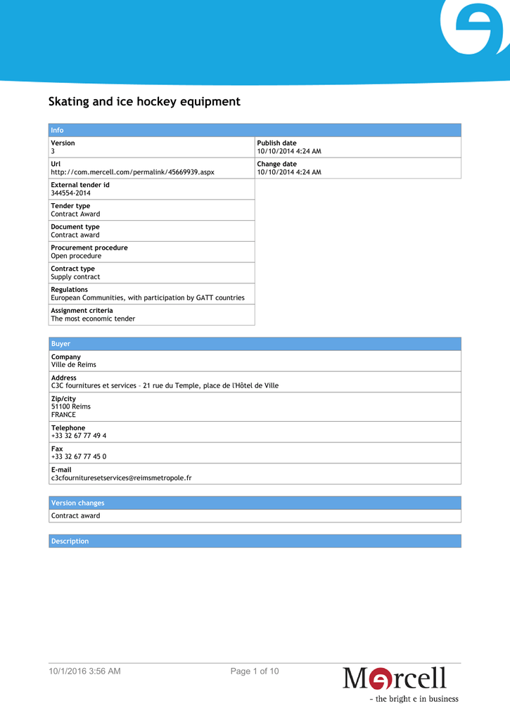 Skating and ice hockey equipment Info Version 3 Publish date 10/10/2014 4:24 AM Url http://com.mercell.com/permalink/45669939.aspx Change date 10/10/2014 4:24 AM External tender id 344554-2014 Tender type Contract Award Document type Contract award Procurement procedure Open procedure Contract type Supply contract Regulations European Communities, with participation by GATT countries Assignment criteria The most economic tender Buyer Company Ville de Reims Address C3C fournitures et services – 21 rue du Temple, place de l'Hôtel de Ville Zip/city 51100 Reims FRANCE Telephone +33 32 67 77 49 4 Fax +33 32 67 77 45 0 E-mail [email protected] Version changes Contract award Description 10/1/2016 3:56 AM Page 1 of 10 Ville de Reims, c3c fournitures et services – 21 rue du Temple, place de l'Hôtel de Ville, Reims, 51100, FRANCE. Telephone: +33 326777494. Fax: +33 326777450. E-mail: [email protected] (Supplement to the Official Journal of the European Union, 2.7.2014, 2014/S 124-220426) 2014/S 144-258403 RE: CPV:37411200 Skating and ice hockey equipment Instead of: IV.3.4) Date limite de réception des offres ou des demandes de participation: 25.8.2014 (17:00) Read: IV.3.4) Date limite de réception des offres ou des demandes de participation: 1.9.2014 (17:00) Other additional information Annonce n° 264, BOAMP 125 B du 2.7.2014. Date d'envoi du présent avis au JOUE et au BOAMP: 25.7.2014. Original text: Ville de Reims, c3c fournitures et services – 21 rue du Temple, place de l'Hôtel de Ville, Reims, 51100, FRANCE. Téléphone: +33 326777494. Fax: +33 326777450. E-mail: [email protected] (Supplément au Journal officiel de l'Union européenne, 2.7.2014, 2014/S 124-220426) 2014/S 144-258403 Objet: CPV:37411200 Équipement de patinage et de hockey sur glace Au lieu de: IV.3.4) Date limite de réception des offres ou des demandes de participation: 25.8.2014 (17:00) Lire: IV.3.4) Date limite de réception des offres ou des demandes de participation: 1.9.2014 (17:00) Autres informations complémentaires 10/1/2016 3:56 AM Page 2 of 10 Annonce n° 264, BOAMP 125 B du 2.7.2014. Date d'envoi du présent avis au JOUE et au BOAMP: 25.7.2014. Assignment 10/1/2016 3:56 AM Page 3 of 10 Section V: Award of contract Contract No: vf6t403l1 Lot No: 1 V.3) Name and address of economic operator in favour of whom the contract award decision has been taken Groupement d'entreprises : mandataire : colors production - rue du Berlaimont 6a - 6220 Fleurus Belgique / cotraitant : Spaciotempo - ZAC des Hauts du Val de Nievre - BP 42 - 80420 Flixecourt Contract No: vf6t403l2 Lot No: 2 V.3) Name and address of economic operator in favour of whom the contract award decision has been taken Groupement d'entreprises : mandataire : Spaciotempo - ZAC des hauts du Val de Nievre - BP 42 - 80420 flixecourt / cotraitant 1 : colors Production, rue du Berlaimont 6a - 6220 Fleurus Belgique / cotraitant 2 : Geoffroy Architectes - 14 rue Libergier 51100 Reims Original text: le présent marché a pour objet l'acquisition et l'installation d'une patinoire provisoire, de la structure extérieure et des aménagements intérieurs. Il se décompose en 2 lots : - lot 1 : Acquisition et installation d'une patinoire provisoire ; - lot 2 : Acquisition et installation de la structure extérieure et des aménagements intérieurs. Le marché est conclu pour une durée de 4 ans à compter de sa date de notification. Sans préjudice des dispositions des articles 29 et suivants du CCAG-FCS, il est résiliable à chaque date anniversaire par décision de la personne publique contractante notifiée au titulaire par lettre recommandée avec accusé de réception deux (2) mois avant l'échéance de la période en cours. Cette dénonciation n'ouvre droit à aucune indemnité au titulaire. Section V: Attribution du marché Marché nº: vf6t403l1 Lot nº: 1 - Intitulé: Acquisition et installation d'une patinoire provisoire V.1) Date d'attribution du marché: 3.10.2014 V.2) Informations sur les offres Nombre d'offres reçues: 2 V.3) Nom et adresse de l'opérateur économique auquel le marché a été attribué Groupement d'entreprises : mandataire : colors production - rue du Berlaimont 6a - 6220 Fleurus Belgique / cotraitant : Spaciotempo - ZAC des Hauts du Val de Nievre - BP 42 - 80420 Flixecourt Marché nº: vf6t403l2 Lot nº: 2 - Intitulé: Acquisition et installation de la structure extérieure et des aménagements intérieurs V.1) Date d'attribution du marché: 3.10.2014 V.2) Informations sur les offres Nombre d'offres reçues: 3 10/1/2016 3:56 AM Page 4 of 10 V.3) Nom et adresse de l'opérateur économique auquel le marché a été attribué Groupement d'entreprises : mandataire : Spaciotempo - ZAC des hauts du Val de Nievre - BP 42 - 80420 flixecourt / cotraitant 1 : colors Production, rue du Berlaimont 6a - 6220 Fleurus Belgique / cotraitant 2 : Geoffroy Architectes - 14 rue Libergier 51100 Reims Ext. description 10/1/2016 3:56 AM Page 5 of 10 Contract award notice Supplies 2014/S 195-344554 Directive 2004/18/EC Section I: Contracting authority I.1) Name, addresses and contact point(s) Telephone: E-mail: Fax: Ville de Reims, C3C fournitures et services – 21 rue du Temple, place de l'Hôtel de Ville, 51100 Reims, FRANCE +33 326777494, [email protected] +33 326777450 Internet address(es): General address of the contracting authority: http://www.ville-reims.fr Address of the buyer profile: https://marches.reimsmetropole.fr Section II: Object of the contract II.1) Description II.1.5) Common procurement vocabulary (CPV) 37411200 Description Skating and ice hockey equipment. Section V: Award of contract Contract No: vf6t403l1 Lot No: 1 V.3) Name and address of economic operator in favour of whom the contract award decision has been taken Groupement d'entreprises : mandataire : colors production - rue du Berlaimont 6a - 6220 Fleurus Belgique / cotraitant : Spaciotempo - ZAC des Hauts du Val de Nievre - BP 42 - 80420 Flixecourt V.4) Information on val