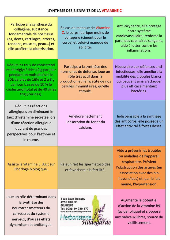 SYNTHESE DES BIENFAITS DE LA VITAMINE C Participe à la synthèse du collagène, substance fondamentale de nos tissus (os, dents, cartilages, artères, tendons, muscles, peau…) et elle accélère la cicatrisation. En cas de manque de Vitamine C, le corps fabrique moins de collagène (ciment pour le corps) et celui-ci manque de solidité. Anti-oxydante, elle protège notre système cardiovasculaire, renforce la paroi des capillaires sanguins, aide à lutter contre les inflammations. Réduit les taux de cholestérol Participe à la synthèse des et de triglycérides (2 g par jour hormones de défense, joue un pendant un mois abaisse le rôle très actif dans la LDL de plus de 16% et 2 à 3 g production et l'efficacité de nos par jour baisse de 10 % le cellules immunitaires, qu'elle cholestérol total et de 40 % les stimule. triglycérides). Nécessaire aux défenses antiinfectieuses, elle améliore la mobilité des globules blancs, qui peuvent ainsi s'attaquer plus efficace mentaux bactéries. Réduit les réactions allergiques en diminuant le taux d'histamine secrétée lors d'une réaction allergique ouvrant de grandes perspectives pour l'asthme et le rhume. Améliore nettement l'absorption du fer et du calcium. Indispensable à la synthèse des anticorps, elle possède un effet antiviral à fortes doses. Rajeunirait les spermatozoïdes et favoriserait la fertilité. Aide à prévenir les troubles ou maladies de l'appareil respiratoire. Prévient l'obstruction des artères (en association avec des bio flavonoïdes) et, par le fait même, l'hypertension. Assiste la vitamine E. Agit sur l'horloge biologique. Joue un rôle déterminant dans la synthèse des neurotransmetteurs du cerveau et du système nerveux, d'où ses effets dynamisant et antifatigue. Augmente le potentiel d'action de la vitamine B9 (acide folique) et s'oppose aux radicaux libres, source du vieillissement. Evite la diminution de carnitine dans les muscles, dont le manque provoque fatigue et faiblesse (substance indispensable au cœur et muscles du squelette). Participe à la synthèse de la noradrénaline, une hormone secrétée par les glandes surrénales pendant les situations de stress, d'où son rôle anti-stress. Dégrade les substances toxiques (métaux lourds, pesticides, médicaments…) et les éliminent dans les urines. Inhibe la formation d'agents cancérigènes (nitrosamines…). Prévient la cataracte liée au vieillissement. Antiscorbutique par excellence. L'acide L-ascorbique n'est pas un médicament mais un complément alimentaire qui peut être pris tous les jours. La forme L- est la seule qui soit reconnue et assimilable par l'organisme. Cette forme de Vitamine C est essentielle pour des doses supérieures à deux grammes par jour. La dose de base pour un adulte en bonne santé est de 5 à 10 g par jour selon les individus et à répartir en trois fois dans la journée. La Vitamine C, aussi appelée acide L-ascorbique, est impliquée dans tant de nombreux processus biochimiques, qu’après 40 ans de recherches et plus de 50.000 articles scientifiques publiés, on ne connaît pas encore toutes ses vertus. Elle est préconisée dans de nombreuses thérapies en médecines douces. L'acide L-ascorbique est antiscorbutique (d'où son nom). Le scorbut est une maladie provoquée par une carence en Vitamine C (perte de poids, hémorragies au niveau des gencives, les dents se déchaussent et tombent)... Les marins du 17ème et du18ème siècle coutumiers des longues traversées de la marine à voile étaient fréquemment atteints par le scorbut. Leur alimentation (céréales, viandes fumées et séchées...) était trop pauvre en Vitamine C. Un médecin écossais, James Lind, eut l'idée d'embarquer des citrons et des oranges et d'en donner régulièrement aux hommes d'équipage. Le problème fut réglé. La Vitamine C a bien plus d’indications que le scorbut. Elle stimule les défenses naturelles, le tonus général, est préconisée contre les rhumes, la grippe, les diverses infections virales et bactériennes. Elle combat aussi les cancers, les troubles cardio- vasculaires et cérébraux-vasculaires, l'arthrose et les rhumatismes, le vieillissement, l'asthme, les allergies, les affections oculaires diverses, les ulcères, les affections des reins et de la vessie, le diabète et l'hypoglycémie, les agressions chimiques, biochimiques et physiques, l'état de choc etc. Étant présente dans bon nombre de processus biochimiques, une complémentation de Vitamine C abaisse le taux de mauvais cholestérol et améliore l’absorption du fer. Ayant par ailleurs un effet anxiolytique avantageux elle est indiquée dans le traitement des schizophrénies. La Vitamine C élimine également les métaux lourds, les pesticides, les polluants et en facilite l’élimination à long terme dans les urines. La Vitamine C que l'on trouve dans les fruits (acérola, kiwi, orange, citron...) et les légumes est de l'acide L-ascorbique, seule forme assimilable par l'organisme, c'est pourquoi la molécule reproduite en laboratoire doit être identique. Ce qui est remarquable avec la Vitamine C(acide L-ascorbique)c’est que même prise à haute dose pendant de longue période elle est sans danger. La Vitamine C pure est acide de goût mais elle n'acidifie pas l'organisme ! Il y a peu de substances avec une telle activité physiologique qui soit non toxique. Son seul défaut est de ne pas être synthétisée par l'organisme humain auquel elle est indispensable. LE SAVIEZ-VOUS ? La Vitamine C (acide L-ascorbique): - prévient les maladies cardiovasculaires en bloquant la formation de cholestérol à 95 % ! - est indispensable dans les mécanismes de défense immunitaire pour lutter contre toutes sortes d'infections bactériennes et virales, - en intraveineuses guérit la polio, l'hépatite B et C, la rougeole, la varicelle, l’herpès, la maladie de Lyme, la mononucléose..., - annihile la plupart des poisons (exemple de l’amanit