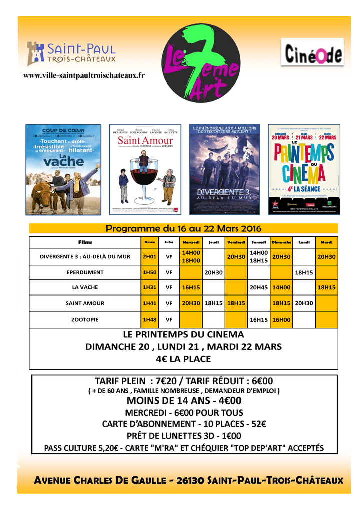 Programme du 16 au 22 Mars 2016 Films Durée Infos Mercredi DIVERGENTE 3 : AU-DELÀ DU MUR 2H01 VF 14H00 18H00 EPERDUMENT 1H50 VF LA VACHE 1H31 VF 16H15 SAINT AMOUR 1H41 VF 20H30 18H15 18H15 ZOOTOPIE 1H48 VF Jeudi Vendredi 20H30 Samedi Dimanche Lundi 14H00 20H30 18H15 20H30 Mardi 20H30 18H15 20H45 14H00 18H15 20H30 16H15 16H00 LE PRINTEMPS DU CINEMA DIMANCHE 20 , LUNDI 21 , MARDI 22 MARS 4€ LA PLACE 18H15