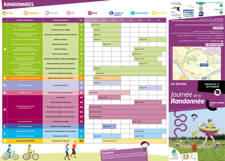 RANDONNÉES Structure / Association Randonnée proposée km Club de marche des Risle-Pattes de Pont-Audemer Chez Maupassant 10 Club de Marche de la Mailleraye À la découverte du village 12 Départ à 9h Conservatoire d’espaces naturels de Haute-Normandie Découvrons la biodiversité du marais Vernier 8 Départ à 9h Parc naturel régional & ethnobotaniste Balade à croquer 5,5 Départ à 9h Association Culture et Nature & Studio’D Marche avec les ânes 6 HAROPA - Port de Rouen (Club Marche Plaisir et Découverte) Histoire de Seine 8 Association Hénouville Rando Entre monts et marais 10 Communauté de communes de Quillebeuf-sur-Seine Randonnée familiale & ateliers pédagogiques 3 Association pour l’Animation dans le Parc & Lire et Faire Lire Balade contée au rythme des enfants 2 Parc naturel régional & association les Courtils de Bouquelon Randonnée en bottes au cœur du marais 15 Club de Marche des Baronnies de Jumièges et Duclair Randonnée patrimoine historique 21 Association d’Attelages de Seine-Maritime Balade entre courtils et chaumières 21 Départ à 9h Ça roule au marais ! 30 Départ à 9h GCOB Rando Roller 9h 10h 13h 14h 15h 16h Maison du Parc naturel régional des Boucles de la Seine Normande Tél. 02 35 37 23 16 CONTACTS De Pont-Audemer : D100 direction Bouquelon, puis emprunter le Chemin du Roy (route du bas) pour arriver aux stands. De Rouen : A13 puis A131 direction Le Havre puis N182 et D103. Du Havre : A131 puis N182 et D103. Départ à 14h Covoiturez ! covoiturage27.net ou covoiturage76.net Départ à 10h COMMENT VENIR ? Départ à 13h30 Départ à 14h Départ à 9h Départ à 9h15 ATTENTION : de nombreux sens uniques de circulation sont mis en place pour la sécurité des randonneurs. Départ à 13h15 Conception, illustrations : Le Zèbre - Imprimerie Iropa, imprimé sur papier 100 % recyclé non chloré avec des encres végétales Photos : C. Noël, G. Aubin, S. Bonhomme Départ à 13h30 Présence d’un traducteur en langue des signes 26e ÉDITION 20 Départ à 14h 35 Les vallons 40 Sur la route des chaumières 40 Du marais au bocage - Moyen parcours 40 Départ libre dès 8h30 Du marais au bocage - Grand parcours 60 Départ libre dès 8h30 Rando vélo familiale au cœur du marais 20 Départ libre dès 8h30 Parc naturel régional Tout autour du marais 20 Les Castors Rislois Initiation au stand-up paddle - Association AGV VISITER Descente de l’Austreberthe en canoë-kayak 14 Club Nautique Caudebec Descente de la Risle 8 Association AGV VISITER Randonnée en vélo-rail 3,5 Ligue de Haute-Normandie de Cyclotourisme 12h VÉLO-RAIL Départ à 8h45 Du tout terrain pour une belle vue Club ACPA – VTT 11h CANOË-KAYAK Office de tourisme de la Communauté de communes de Quillebeuf-sur-Seine à Bourneville - Tél. 02 32 57 32 23 À PIED ATTELAGES ROLLERS VTT VÉLO STAND-UP PADDLE Départ à 8h30 Départ à 9h30 Départ à 13h30 DIMANCHE 13 SEPTEMBRE Journée de la Randonnée c o m a n d e . - n o r m e n i e s p n r - Départ à 13h15 Départ à 10h Départ à 13h30 Départ à 9h Départ à 13h30 Départ toutes les heures NOUVEAUTÉ Parapente ! ng ées tout au lo seront propos . es es nn qu rie gi aé lo ro ns étéo Des animatio s conditions m de n tio nc fo en de la journée 2015 MARAIS-VERNIER (27) PROGRAMME À PIED ATTELAGES ROLLERS VTT VÉLO STAND-UP PADDLE Les vallons Ligue de Haute-Normandie de Cyclotourisme Boucle à une allure modérée, au rythme adapté à un public féminin. Accompagné par un capitaine de route. Casque obligatoire pour les moins de 18 ans, adultes casque conseillé. MATIN À la découverte du village Club de Marche de la Mailleraye 9h à 12h 12 km Inscription dès 8h sur place Richard Bernage : 02 35 37 06 95 Tout public Marche avec les ânes (pas à dos d’ânes) Association Culture et Nature & Studio’D Pause repas au Studio’D avec des produits locaux et de ferme ou pique nique acheté au stand avant le départ ou tiré du sac. Animations à l’association. Retour à pied en autonomie. Places limitées. 10h à 12h Environ 6 km Antoine Crevon : 06 10 35 86 54 – [email protected] Tout public Chez Maupassant Club de marche des Risle-Pattes de Pont-Audemer Randonnée commentée avec découverte du patrimoine autour du château, des trésors cachés de la série Maupassant et la rencontre des habitants du marais. 8h45 à 12h 10 km Inscription dès 8h sur place. 50 personnes maximum Marcheurs avertis. Passages avec du dénivelé assez important Découvrons la biodiversité du marais Vernier Conservatoire d’espaces naturels de Haute-Normandie Balade à croquer Parc naturel régional & ethnobotaniste Balade pour découvrir toute la richesse de la flore des zones humides. 9h à 12h 5,5 km Inscription par téléphone ou sur place dès 8h. 20 personnes maximum Maison du Parc : 02 35 37 23 16 Enfants à partir de 8 ans Ça roule au marais ! GCOB Rando Roller 9h à 12h 30 km Inscription dès 8h sur place. Pierre Andru : 07 54 82 95 41 – [email protected] Pour patineurs confirmés de plus de 18 ans (sauf licenciés) Du tout terrain pour une belle vue 8h30 à 13h 35 km Inscription dès 8h sur place. Jean-Louis Joyeux - [email protected] Niveau confirmé Gratuit pour licenciés, 2 € pour tout public Club Nautique Caudebec 9h à 12h 8 km Réservation obligatoire par téléphone Reynald Picard : 06 28 53 04 99 Balade entre courtils et chaumières APRÈS-MIDI Histoire de Seine 13h30 à 17h00 Environ 8 km Inscription par téléphone. 50 personnes maximum Philippe Boullier : 02 35 96 08 40 Tout niveau Balade contée au rythme des enfants Association pour l’Animation dans le Parc & Lire et Faire Lire 14h à 16h30 2 km Inscription par téléphone ou sur place dès 8h Maison du Parc : 02 35 37 23 16 Randonnée familiale et ateliers pédagogiques Communauté de communes de Quillebeuf-sur-Seine Marche jusqu’au pré aux ânes pour animations nature variées : découverte et ateliers. 13h30 à 16h 3 km Inscription par téléphone ou sur p