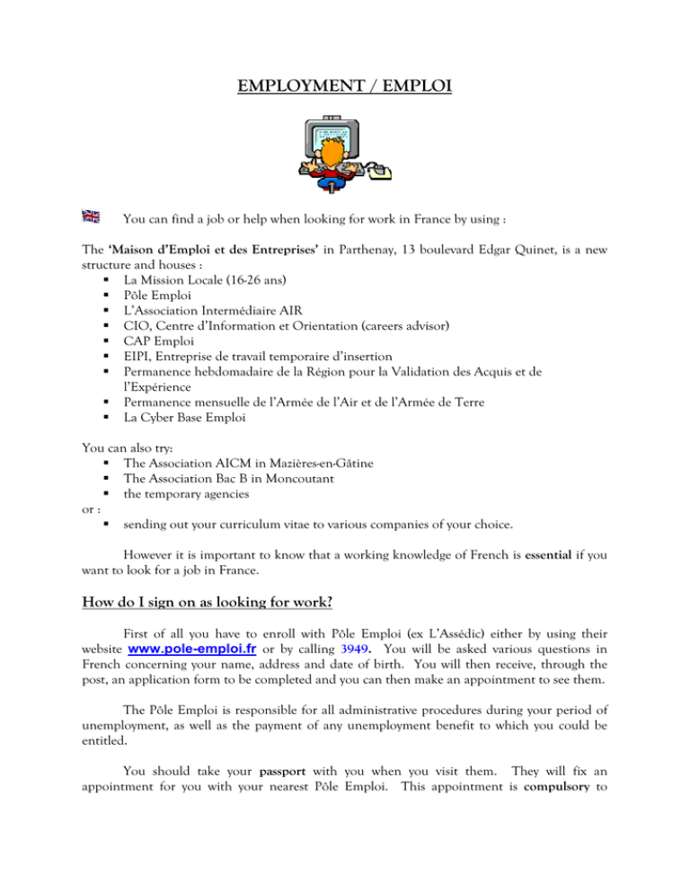 EMPLOYMENT / EMPLOI You can find a job or help when looking for work in France by using : The ‘Maison d’Emploi et des Entreprises’ in Parthenay, 13 boulevard Edgar Quinet, is a new structure and houses : La Mission Locale (16-26 ans) Pôle Emploi L’Association Intermédiaire AIR CIO, Centre d’Information et Orientation (careers advisor) CAP Emploi EIPI, Entreprise de travail temporaire d’insertion Permanence hebdomadaire de la Région pour la Validation des Acquis et de l’Expérience Permanence mensuelle de l’Armée de l’Air et de l’Armée de Terre La Cyber Base Emploi You can also try: The Association AICM in Mazières-en-Gâtine The Association Bac B in Moncoutant the temporary agencies or : sending out your curriculum vitae to various companies of your choice. However it is important to know that a working knowledge of French is essential if you want to look for a job in France. How do I sign on as looking for work? First of all you have to enroll with Pôle Emploi (ex L’Assédic) either by using their website www.pole-emploi.fr or by calling 3949. You will be asked various questions in French concerning your name, address and date of birth. You will then receive, through the post, an application form to be completed and you can then make an appointment to see them. The Pôle Emploi is responsible for all administrative procedures during your period of unemployment, as well as the payment of any unemployment benefit to which you could be entitled. You should take your passport with you when you visit them. They will fix an appointment for you with your nearest Pôle Emploi. This appointment is compulsory to finalize your enrolment. From the 4th month following your enrolment at Pôle Emploi, you will be allocated a consultant from Pôle Emploi who will be designated to accompany and help you. An important point to remember is to update your employment situation with Pôle Emploi, between the 1st and 8th of each month, even if you are still looking for a job or have only worked several hours in the month. You can do this by phone on 3949 or on internet www.pole-emploi.fr Pôle Emploi offers the following services: “self service” consultation of job offers. advisory interviews to help you go about finding employment, defining your professional objectives and evaluating your work skills. participation in job search workshops, information on benefits for job seekers. availability of computer equipment, a telephone line, national and international business press, documentation bank (business directories). Pôle Emploi opening hours : Monday, Tuesday, Wednesday : 8.30 – 16h30 Thursday : 8h30 - 12h30 Friday : 8h30 – 15h30 Curriculum Vitae This must be in French and on one page. A letter of motivation should accompany your cv. After a period of time you can follow up by telephoning to see if your letter has got to the correct person and whether you can obtain an interview. La Mission Locale (16-26 ans) If you are between 16 and 26 years old and are looking for a job or want help with your career La Mission Locale can help you. They specialize in : Individually helping young job seekers Writing cvs and accompanying letters Consulting Pôle Emploi job offers Researching different types of jobs and training It is important to ring and make an appointment which will be at one of their branch offices, nearest to your home. Transport : If you are looking for work and have difficulty finding transport La Maison de l'Emploi et des Entreprises can help you. Telephone : 06 74 96 66 89. Vous pouvez trouver du travail et/ou une aide à la recherche de travail en France dans différentes structures : La ‘Maison d’Emploi et des Entreprises’ située au 13 boulevard Edgar Quinet à Parthenay, cette nouvelle structure héberge : La Mission Locale (16-26 ans) Pôle Emploi L’Association Intermédiaire AIR CIO, Centre d’Information et Orientation CAP Emploi EIPI, Entreprise de travail temporaire d’insertion Permanence hebdomadaire de la Région pour la Validation des Acquis et de l’Expérience Permanence mensuelle de l’Armée de l’Air et de l’Armée de Terre La Cyber Base Emploi Ou : L’Association AICM à Mazières-en-Gâtine L’Association Bac B à Moncoutant Les agences de travail temporaire Les entreprises locales en faisant des candidatures spontanées (envoi de CV et lettre de motivation aux entreprises). Cependant, il est important de parler le français pour rechercher un travail en France. Comment s’inscrire comme demandeur d’emploi C’est Pôle Emploi (ex Assédic) qui procède à l’inscription des demandeurs d’emploi. Vous pouvez vous inscrire sur le site internet, www.pole-emploi.fr ou appeler le 3949. Vous devrez indiquer en français vos noms, adresse et votre date de naissance. Pôle Emploi vous transmettra par la poste une demande d’allocations à compléter et vous fixera un rendez-vous. C’est Pôle Emploi qui gère toutes les procédures administratives pendant votre période de chômage, ainsi que le versement des indemnités de chômage auxquelles vous pourriez avoir droit. Lors de votre rendez-vous à Pôle Emploi, n’oubliez pas de vous munir de votre passeport. Votre interlocuteur vous fixera un rendez-vous d’inscription avec un conseiller Pôle Emploi dont vous dépendez. Cet entretien est obligatoire pour finaliser votre inscription. A partir du 4ème mois d’inscription à Pôle Emploi un Conseiller Référent Unique accompagne tous les chercheurs d’emploi dans leurs démarches, les rencontres sont mensuelles et obligatoires jusqu’à l’emploi. Point important : ne pas oubliez d’informer entre le 1er et le 8 de chaque mois de votre situation, que vous soyez ou non encore à la recherche d’un emploi, même si vous n’avez travaillé que quelques heures dans le mois. Vous avez la possibilité de le faire par Internet sur www.pole-emploi.fr ou par serveur vocal au 3949. Pôle Emploi offre une multitude de servic