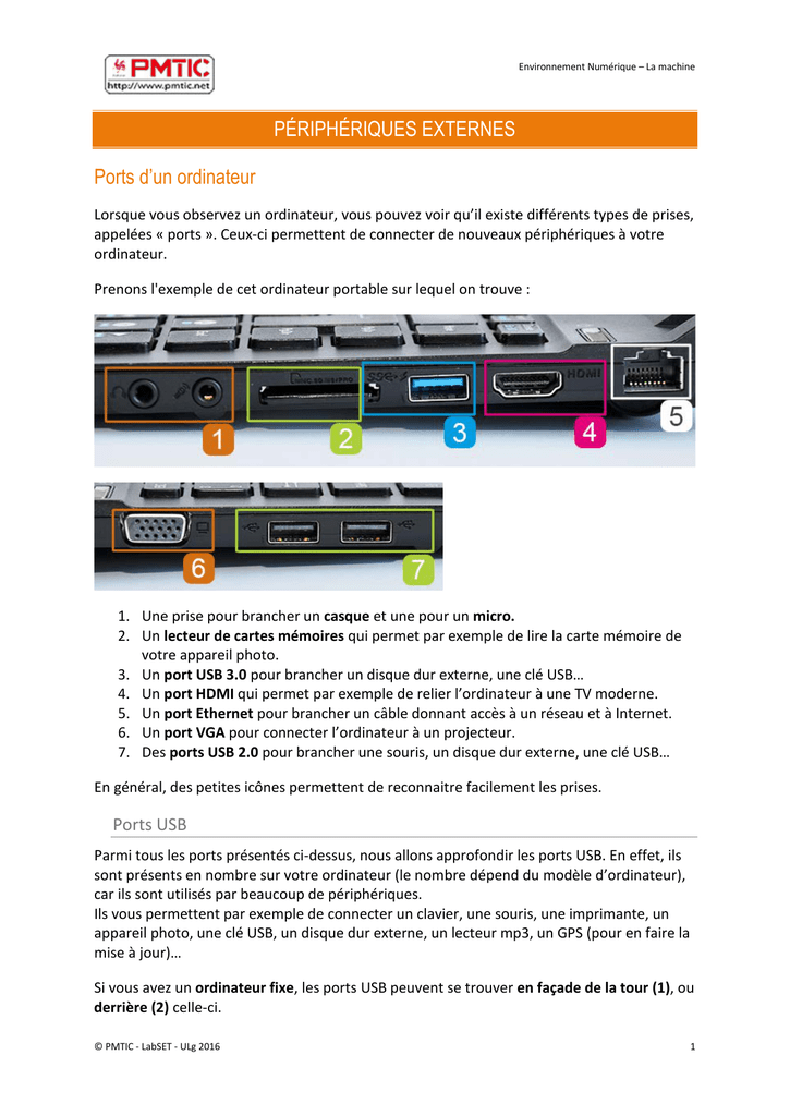 Environnement Numérique – La machine PÉRIPHÉRIQUES EXTERNES Ports d’un ordinateur Lorsque vous observez un ordinateur, vous pouvez voir qu’il existe différents types de prises, appelées « ports ». Ceux-ci permettent de connecter de nouveaux périphériques à votre ordinateur. Prenons l'exemple de cet ordinateur portable sur lequel on trouve : 1. Une prise pour brancher un casque et une pour un micro. 2. Un lecteur de cartes mémoires qui permet par exemple de lire la carte mémoire de votre appareil photo. 3. Un port USB 3.0 pour brancher un disque dur externe, une clé USB… 4. Un port HDMI qui permet par exemple de relier l’ordinateur à une TV moderne. 5. Un port Ethernet pour brancher un câble donnant accès à un réseau et à Internet. 6. Un port VGA pour connecter l’ordinateur à un projecteur. 7. Des ports USB 2.0 pour brancher une souris, un disque dur externe, une clé USB… En général, des petites icônes permettent de reconnaitre facilement les prises. Ports USB Parmi tous les ports présentés ci-dessus, nous allons approfondir les ports USB. En effet, ils sont présents en nombre sur votre ordinateur (le nombre dépend du modèle d’ordinateur), car ils sont utilisés par beaucoup de périphériques. Ils vous permettent par exemple de connecter un clavier, une souris, une imprimante, un appareil photo, une clé USB, un disque dur externe, un lecteur mp3, un GPS (pour en faire la mise à jour)… Si vous avez un ordinateur fixe, les ports USB peuvent se trouver en façade de la tour (1), ou derrière (2) celle-ci. © PMTIC - LabSET - ULg 2016 1 Environnement numérique – La machine Sur les ordinateurs portables, les ports sont souvent situés sur les côtés de l’ordinateur. Vous pouvez généralement repérer ces ports grâce à l’icône USB : Jusqu'à présent, on utilisait des prises USB 2.0. Toutefois, depuis quelques années, on note l'apparition de l'USB 3.0, qui permet un transfert plus rapide des données. Les prises USB 3.0 sont généralement reconnaissables grâce à leur languette bleue (ce n’est pas toujours le cas) et leur logo. Remarque : pour profiter de la vitesse de l'USB 3.0, il faut avoir un port USB 3.0 sur son ordinateur ET un périphérique USB 3.0 (disque dur externe, clé USB...). Si vous branchez un disque dur USB 3.0 sur un port USB 2.0, vous ne pourrez pas profiter de la vitesse de l'USB 3.0. © LabSET – ULg 2016 2 Environnement numérique – La machine Stockage USB Toutes vos données (photos, vidéos, musiques…) sont sur le disque dur de votre ordinateur. Dans certains cas, on peut avoir besoin de les copier sur un périphérique externe : pour sauvegarder des données, pour transférer des données d’un ordinateur à l’autre… Pour cela, vous pouvez par exemple utiliser une clé USB, ou un disque dur externe. Clé USB Une clé USB (ou "stick USB") est un petit objet qui permet de stocker des données informatiques (films, photos, musiques, fichiers Word…). Elle s'insère dans le port USB de n'importe quel ordinateur, mais également de certains autres appareils comme des chaines hifis, des autoradios, des téléviseurs, des lecteurs DVD… Fin 2016, les clés USB vendues dans le commerce ont généralement une capacité allant de 8 Go (gigas) à 128 Go. Il existe une multitude de modèles de clés USB, dont certains sont parfois très originaux… L’avantage de cet objet c’est qu’il est de petite taille, et qu’il permet facilement de copier des données d’un appareil à l’autre. Vous pouvez par exemple l’utiliser pour • • • • copier vos données vers un autre ordinateur, copier un film/des photos afin de les afficher sur une télévision (modèle récent) copier des musiques et les diffuser sur votre chaine hifi ou sur l’autoradio … Disque dur externe Comme la clé USB, le disque dur externe est un objet qui permet de stocker des données informatiques. On le relie à un ordinateur via un câble USB que l’on insère dans le port USB. Par rapport à une clé USB, le disque dur est généralement plus encombrant, mais il permet également de stocker plus de fichiers. En 2016, les disques durs externes vendus ont généralement une capacité qui varie de 500 gigas à 5 téras (5000 gigas). Les disques durs externes sont généralement classés en 2 catégories : © LabSET – ULg 2016 3 Environnement numérique – La machine 1. Les disques durs "de bureau" : ceux-ci sont souvent plus gros (3,5") et ont une plus grande capacité de stockage. Ils ont généralement besoin d'une prise de courant pour fonctionner. 2. Les disques durs "portables" : ceux-ci sont faciles à transporter, car ils prennent moins de place (entre 1,8 " et 2,5"), ils sont également plus légers et ils ne nécessitent généralement pas une prise de courant pour fonctionner. L'inconvénient, c'est qu'ils peuvent contenir moins de données, et ils coutent souvent plus cher qu'un disque dur de bureau pour une même capacité. Voici une photo où sont représentés (de gauche à droite) : • • • Une clé USB Un disque dur portable Un disque dur de bureau En résumé : Avantages ( + ) Disque dur Clé USB © LabSET – ULg 2016 Inconvénients ( - ) Grande capacité de stockage (en 2016, généralement de 500 à 5000 Go) Encombrant Facile à transporter grâce à sa petite taille. Fragile Certains modèles ont besoin de courant pour fonctionner Capacité de stockage inférieure à un disque dur externe (en 2016, généralement de 8 à 128 Go) 4 Environnement numérique – La machine Utiliser un support de stockage USB Brancher une clé USB Dans quel sens insérer une clé USB ? Si vous avez un logo sur la clé, celui-ci est souvent positionné vers le dessus. Si vous n’avez pas de logo, il faudra observer la clé : • • Un côté contient 2 trous « ouverts ». Un côté avec 2 trous « bouchés », ainsi qu’une petite ligne. C’est le côté avec les trous ouverts qui doit généralement être po