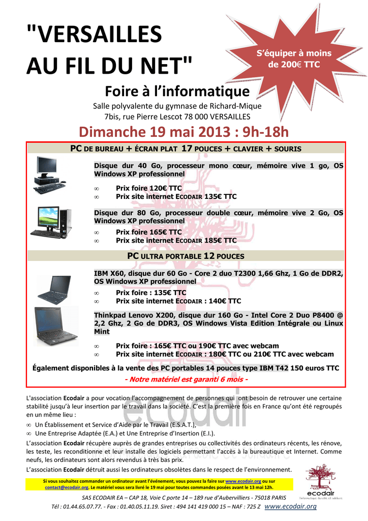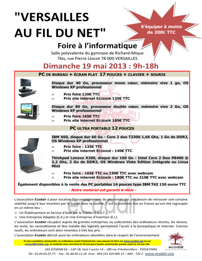 "VERSAILLES AU FIL DU NET" S’équiper à moins de 200€ TTC Foire à l’informatique Salle polyvalente du gymnase de Richard-Mique 7bis, rue Pierre Lescot 78 000 VERSAILLES Dimanche 19 mai 2013 : 9h-18h PC DE BUREAU + ÉCRAN PLAT 17 POUCES + CLAVIER + SOURIS Disque dur 40 Go, processeur mono cœur, mémoire vive 1 go, OS Windows XP professionnel • • Prix foire 120€ TTC Prix site internet ECODAIR 135€ TTC Disque dur 80 Go, processeur double cœur, mémoire vive 2 Go, OS Windows XP professionnel • • Prix foire 165€ TTC Prix site internet ECODAIR 185€ TTC PC ULTRA PORTABLE 12 POUCES IBM X60, disque dur 60 Go - Core 2 duo T2300 1,66 Ghz, 1 Go de DDR2, OS Windows XP professionnel • • Prix foire : 135€ TTC Prix site internet ECODAIR : 140€ TTC Thinkpad Lenovo X200, disque dur 160 Go - Intel Core 2 Duo P8400 @ 2,2 Ghz, 2 Go de DDR3, OS Windows Vista Edition Intégrale ou Linux Mint • • Prix foire : 165€ TTC ou 190€ TTC avec webcam Prix site internet ECODAIR : 180€ TTC ou 210€ TTC avec webcam Également disponibles à la vente des PC portables 14 pouces type IBM T42 150 euros TTC - Notre matériel est garanti 6 mois L'association Ecodair a pour vocation l’accompagnement de personnes qui ont besoin de retrouver une certaine stabilité jusqu’à leur insertion par le travail dans la société. C’est la première fois en France qu’ont été regroupés en un même lieu : • Un Établissement et Service d’Aide par le Travail (E.S.A.T.), • Une Entreprise Adaptée (E.A.) et Une Entreprise d’Insertion (E.I.). L’association Ecodair récupère auprès de grandes entreprises ou collectivités des ordinateurs récents, les rénove, les teste, les reconditionne et leur installe des logiciels permettant l’accès à la bureautique et Internet. Comme neufs, les ordinateurs sont alors revendus à très bas prix. L’association Ecodair détruit aussi les ordinateurs obsolètes dans le respect de l’environnement. Si vous souhaitez commander un ordinateur avant l’événement, vous pouvez la faire sur www.ecodair.org ou sur [email protected]. Le matériel vous sera livré le 19 mai pour toutes commandes posées avant le 13 mai 12h. SAS ECODAIR EA – CAP 18, Voie C porte 14 – 189 rue d’Aubervilliers - 75018 PARIS Tél : 01.44.65.07.77. - Fax : 01.40.05.11.19. Siret : 494 141 419 000 15 – NAF : 725 Z www.ecodair.org