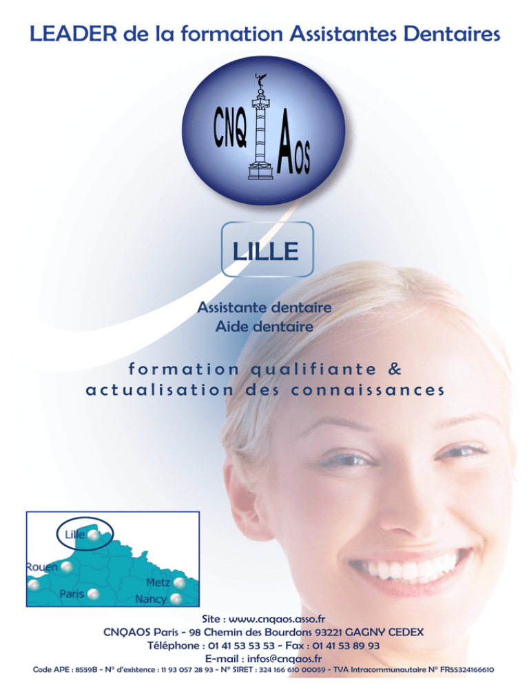 LEADER de la formation Assistantes Dentaires LILLE Assistante dentaire Aide dentaire formation qualifiante & actualisation des connaissances Site : www.cnqaos.asso.fr CNQAOS Paris - 98 Chemin des Bourdons 93221 GAGNY CEDEX Téléphone : 01 41 53 53 53 - Fax : 01 41 53 89 93 E-mail : [email protected] Code APE : 8559B - N° d’existence : 11 93 057 28 93 - N° SIRET : 324 166 610 00059 - TVA Intracommunautaire N° FR55324166610 LILLE • Lille est un lieu de cours et d’examen important qui permet de préparer la qualification : d’assistante dentaire – épreuves générales ; d’aide dentaire. • Pour tous renseignements s’adresser à Monsieur BIRAUD au 03.20.12.19.93 les mardis et jeudis ou au 06.11.86.07.13 les autres jours ou par mail : [email protected]. • AIDE AU RECRUTEMENT : si un employeur souhaite connaître l’avis de la C.N.Q.A.O.S. , il peut demander à un candidat potentiel de se présenter à une réunion d’information sur le métier d’assistant(e) ou d’aide dentaire et à un entretien de motivation à ce métier. • Possibilité de subir les épreuves d’admission à l’enseignement du certificat de qualification d’assistante dentaire au centre CNQAOS Paris-Gagny. Au préalable, adresser une lettre de motivation + C.V. à CNQAOS – 98-100 Chemin des Bourdons 93221 GAGNY CEDEX. Mis à jour le 30 mars 2016 2 COMMENT SE RENDRE AU LIEU DE COURS : Espace Tween - 32 Place de la Gare 59000 LILLE Plan d’accès : En face de la gare LILLE-FLANDRES Restauration à proximité 3 ESTIMATION DU TEMPS DE TRANSPORT : Secteur Point de départ Point d'arrivée VOITURE SNCF DUNKERQUE 1h 35 mn à 1h10 CALAIS 1h15 30 mn à 1h30 BOULOGNE SUR MER 1h30 1h à 2h10 BERCK 2h - ABBEVILLE 2h 2h10 à 2h30 AMIENS 1h40 1h20 à 1h30 45 mn 35 mn à 1h 1h20 1h30 à 2h40 HENIN BEAUMONT 30 mn 20 à 30 mn MAUBEUGE 1h 1h à 1h30 TOURCOING 20 mn 15 à 20 mn BETHUNE 50 mn 25 à 45 mn MONS (BELGIQUE) 1h 1h15 à 1h45 TOURNAI (BELGIQUE) 25 mn 25 à 35 mn ARRAS LILLE SAINT QUENTIN LILLE BUS Gare routière lieu de formation 21 mn lieu de formation Gare routière 21 mn Horaire des jours de cours : • Matin : 08h30 – 12h30 07h00 • Après-midi : 13h30 – 16h30 4 CALENDRIER PREVISIONNEL DES JOURS DE COURS - LILLE Chaque entrée en formation est précédée du Module d’introduction à la formation (N00 - 2 jours). Jour de cours : MARDI A05-GESTION DE L’AGENDA A01-GESTION DU RISQUE INFECTIEUX N04-GESTION DE L’AGENDA DE L’ENTREPRISE N02-DÉSINFECTION, STÉRILISATION MARDI 19 JUILLET 2016 MARDI 23 AOÛT 2016 MARDI 17 JANVIER 2017 MARDI 24 JANVIER 2017 MARDI 31 JANVIER 2017 MARDI 07 FÉVRIER 2017 MARDI 14 FÉVRIER 2017 MARDI 21 FÉVRIER 2017 MARDI 28 FÉVRIER 2017 (4 H/TP) N05-ORGANISATION DES RDV DU PRATICIEN MARDI 30 AOÛT 2016 MARDI 06 SEPTEMBRE 2016 A03-HYGIÈNE ET PRÉVENTION AU TRAVAIL N09-GESTION DES STOCKS N11-L’ASSISTANT(E) DENTAIRE AU SEIN DE SON ENVIRONNEMENT PROFESSIONNEL MARDI 07 MARS 2017 JOURNÉE D’ÉVALUATION JEUDI 20 AVRIL 2017 MARDI 13 SEPTEMBRE 2016 N12-ÉVALUATION ET PRÉVENTION DES RISQUES AU TRAVAIL A02-AIDE OPÉRATOIRE N03-IMAGERIE MÉDICALE MARDI 20 SEPTEMBRE 2016 MARDI 27 SEPTEMBRE 2016 MARDI 14 MARS 2017 MARDI 21 MARS 2017 MARDI 28 MARS 2017 A04-ÉDUCATION À LA SANTÉ BUCCO-DENTAIRE N08-PROPHYLAXIE ET HYGIÈNE BUCCO-DENTAIRE N06-LE TRAVAIL À 4 MAINS MARDI 04 OCTOBRE 2016 MARDI 11 OCTOBRE 2016 MARDI 04 AVRIL 2017 MARDI 11 AVRIL 2017 MARDI 18 AVRIL 2017 MARDI 25 AVRIL 2017 MARDI 02 MAI 2017 MARDI 09 MAI 2017 MARDI 16 MAI 2017 (3 H/TP) A06-ACCUEIL ET COMMUNICATION N01-COMMUNIQUER AVEC LES PATIENTS MARDI 18 OCTOBRE 2016 MARDI 25 OCTOBRE 2016 MARDI 08 NOVEMBRE 2016 N07-ASSISTANCE AUX TRAVAUX PROTHÉTIQUES ET ORTHODONTIQUES JOURNÉE D’ÉVALUATION JEUDI 01 DÉCEMBRE 2016 MARDI 23 MAI 2017 MARDI 30 MAI 2017 MARDI 06 JUIN 2017 MARDI 13 JUIN 2017 MARDI 20 JUIN 2017 A07-CRÉATION ET SUIVI DES DOSSIERS N13-CRÉER ET SUIVRE UN DOSSIER PATIENT N10-GESTES ET SOINS D’URGENCE MARDI 15 NOVEMBRE 2016 MARDI 22 NOVEMBRE 2016 MARDI 29 NOVEMBRE 2016 MARDI 06 DÉCEMBRE 2016 MARDI 27 JUIN 2017 MARDI 04 JUILLET 2017 JOURNÉE D’ÉVALUATION JEUDI 21 SEPTEMBRE 2017 N14-ÉTABLIR ET CONTRÔLER LES DOSSIERS DE REMBOURSEMENT MARDI 13 DÉCEMBRE 2016 MARDI 20 DÉCEMBRE 2016 MARDI 03 JANVIER 2017 MARDI 10 JANVIER 2017 5 CALENDRIER PREVISIONNEL DES JOURS DE COURS - LILLE Chaque entrée en formation est précédée du Module d’introduction à la formation (N00 - 2 jours). Jour de cours : JEUDI A02-AIDE OPÉRATOIRE A03-HYGIÈNE ET PRÉVENTION AU TRAVAIL N03-IMAGERIE MÉDICALE N11-L’ASSISTANT(E) DENTAIRE AU SEIN DE SON ENVIRONNEMENT PROFESSIONNEL JEUDI 09 JUIN 2016 JEUDI 16 JUIN 2016 JEUDI 23 JUIN 2016 JEUDI 09 FÉVRIER 2017 N12-ÉVALUATION ET PRÉVENTION DES RISQUES AU TRAVAIL N06-LE TRAVAIL À 4 MAINS JEUDI 30 JUIN 2016 JEUDI 07 JUILLET 2016 JEUDI 21 JUILLET 2016 JEUDI 25 AOÛT 2016 JEUDI 01 SEPTEMBRE 2016 JEUDI 08 SEPTEMBRE 2016 JEUDI 22 SEPTEMBRE 2016 JEUDI 16 FÉVRIER 2017 JEUDI 23 FÉVRIER 2017 A05-GESTION DE L’AGENDA N04-GESTION DE L’AGENDA DE L’ENTREPRISE JEUDI 02 MARS 2017 JEUDI 09 MARS 2017 N07-ASSISTANCE AUX TRAVAUX PROTHÉTIQUES ET ORTHODONTIQUES N05-ORGANISATION DES RDV DU PRATICIEN JEUDI 29 SEPTEMBRE 2016 JEUDI 06 OCTOBRE 2016 JEUDI 13 OCTOBRE 2016 JEUDI 20 OCTOBRE 2016 JEUDI 27 OCTOBRE 2016 JEUDI 16 MARS 2017 JEUDI 23 MARS 2017 A06-ACCUEIL ET COMMUNICATION N10-GESTES ET SOINS D’URGENCE N01-COMMUNIQUER AVEC LES PATIENTS JEUDI 03 NOVEMBRE 2016 JEUDI 10 NOVEMBRE 2016 JEUDI 30 MARS 2017 JEUDI 06 AVRIL 2017 JEUDI 13 AVRIL 2017 JOURNÉE D’ÉVALUATION JEUDI 01 DÉCEMBRE 2016 JOURNÉE D’ÉVALUATION JEUDI 20 AVRIL 2017 A04-ÉDUCATION À LA SANTÉ BUCCO-DENTAIRE A01-GESTION DU RISQUE INFECTIEUX N08-PROPHYLAXIE ET HYGIÈNE BUCCO-DENTAIRE N02-DÉSINFECTION, STÉRILISATION JEUDI 17 NOVEMBRE 2016 JEUDI 24 NOVEMBRE 2016 JEUDI 27 AVRIL 2017 JEUDI 04 MAI 2017 JEUDI 11 MAI 2017 JEUDI 18 MAI 2017 JEUDI 01 JUIN 2017 JEUDI 08 JUIN 2017 JEUDI 15 JUIN 2017 (4 H/TP) A07-CRÉATION ET 