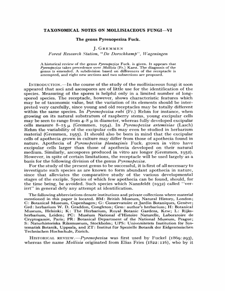 TAXONOMICAL NOTES ON MOLLISIACEOUS FUNGI-VI The genus Pyrenopeziza Fuck. ]. GREMMEN Forest Research Station, "De Dorschkamp", TVageningen A historical review of the genus Pyrenopeziza Fuck. is given. It appears that Pyrenopeziza takes precedence over Mollisia (Fr.) Karst. The diagnosis of the genus is emended. A subdivision based on differences of the receptacle is attempted, and eight new sections and two subsections are proposed. INTRODUCTION .-In the course of the study of the mollisiaceous fungi it soon appeared that asci and ascospores are of little use for the identification of the species. Measuring of the spores is helpful only in a limited number of longspored species. The receptacle, however, shows characteristic features which may be of taxonomic value, but the variation of its elements should be interpreted very carefully, since young and old receptacles may be totally different within the same species. In Pyrenopeziza rubi (Fr.) Rehm for instance, when growing on its natural substratum of raspberry stems, young excipular cells may be seen to range from 4-8 f1. in diameter, whereas fully developed excipular cells measure 8-15 f1. (Gremmen, 1954). In Pyrenopeziza artemisiae (Lasch) Rehm the variability of the excipular cells may even be studied in herbarium material (Gremmen, 1955). It should also be born in mind that the excipular cells of apothecia grown in culture may differ from those of apothecia found in nature. Apothecia of Pyrenopeziza plantaginis Fuck. grown in vitro have excipular cells larger than those of apothecia developed on their natural medium. Similarly, ascospores produced in vitro are longer (Gremmen, 1952). However, in spite of certain limitations, the receptacle will be used largely as a basis for the following division of the genus Pyrenopeziza. For the study of the present genus to be successful, it is first of all necessary to investigate such species as are known to form abundant apothecia in nature, since that alleviates the comparative study of the various developmental stages of the exciple. Species of which few apothecia can be found, should, for the time being, be avoided. Such species which Nannfeldt (1932) called "verirrt" in general defy any attempt at identification. The following abbreviations denote institutions and private collections where material mentioned in this paper is located. BM: British Museum, Natural History, London; C: Botanical Museum, Copenhagen; G: Conservatoire et Jardin Botaniques, Geneve; Grd: herbarium W. D. Graddon, Congleton; Grm: author's herbarium; H: Botanical Museum, Helsinki; K: The Herbarium, Royal Botanic Gardens, Kew; L: Rijksherbarium, Leiden; PC: Museum National d'Histoire Naturelle, Laboratoire de Cryptogamie, Paris; PR: Botanical Department of the National Museum, Prague; S: Naturhistoriska Riksmuseum, Stockholm; UPS: Universitetets Institution for Systematisk Botanik, Uppsala, and ZT: Institut fur Spezielle Botanik der Eidgenossischen Technischen Hochschule, Zurich. HISTORICAL REVIEw.-Pyrenopeziza was first used by Fuckel (1869: 293), whereas the name Mollisia originated from Elias Fries (1822: 116), who by it FUNGUS [JAARG. 28 No. 1-4 indicated a tribus of his genus Peziza. This tribus was raised to generic rank by P. A. Karsten (1871: IS), and two sections were distinguished, viz. "Sect. 1. Apothecia subiculo nullo vel minus distincto insidentia" and "Sect. n. Apothecia subiculo distincto subtomentoso insidentia Tapesia Fr. p.pr." Phillips (1887) regarded Mollisia sensu Fr. as a good genus, dividing it in the subgenera Niptera Fuck., Pyrenopeziza Fuck., Dilutella Phill., Mollisiella Phill., Hysteropeziza Rabh., Pseudopeziza Fuck., and Peristomialis (without author's name). In part this scheme is based on the apothecial structure, e.g. Niptera being characterized by "texture rather firm; cups plane" and Pyrenopeziza by "texture soft; cups globose (mostly black) ," but on the whole the genus is very heterogeneous. Rehm (r896) recognized in his Mollisieae the group Eumollisieae with "Apothecien von Anfang an sitzend" and the Pyrenopezizeae characterized by "Apothecien zuerst in die oberen Zellschichten eingesenkt, durch dieselben hervorbrechend und dann sitzend." The Eumollisieae are split up into (a) genera without a subiculum, comprising Mollisia Fr., Niptera Fr., Belonidium Mont. & Dur., and Belonopsis Sacc., and (b) genera with a subiculum such as Tapesia Pers. and Trichobelonium Sacc. The Pyrenopezizeae comprise the Pseudopezizeae with the genera Pseudopeziza Fuck., and Fabraea Sacc., and the Eupyrenopezizeae with Pyrenopeziza Fuck., Pirottaea Sacc. & Speg., Beloniella Sacc., and Velutaria Fuck. Boudier (r907) mentioned in his family Mollisiacees the following genera: Pyrenopeziza Fuck., Ephelina Sacc., Pirottaea Sacc., Coronellaria Karst., Mollisia Fr., Tapesia Pers., Niptera Fr., Mollisiella Boud., and Spilopodia Boud. He characterized Mollisia as follows: "L'aspect general aplati, plus Hale, des receptacles qui sont toujours sessiles, ... " and Pyrenopeziza: "Les receptacles sont generalement noirs exterieurement avec la marge plus blanche." According to Boudier the paraphyses in M ollisia are filled with an oily protoplasm, lacking in Pyrenopeziza. In r9I2 Rehm revised the Pyrenopezizeae and the genus Pyrenopeziza was again discussed in detail. Nannfeldt (1932) recognized two subfamilies in his Mollisioideae, viz. the Mollisieae and the Pyrenopezizeae. The first category dealt with the species having the "Apothecien ganz oberfHichlich oder nur mit zapfen-formiger Basis im Substrat eingesenkt," those of the second group having the "Apothecien im Substrat eingesenkt, hervorbrechend." In the former are found the genera Haglundia Nannf., Belonium Sacc., Coronellaria Karst., Tapesia Fuck., Trichobelonium Rehm, Motlisia (Fr.) Karst., and Belonopsis Rehm; in the latter Pirottaea Fuck. and Hysteropezizella v. Hohn. The present author already demonstrated that it is hardly possible to delimit the genus Pyr