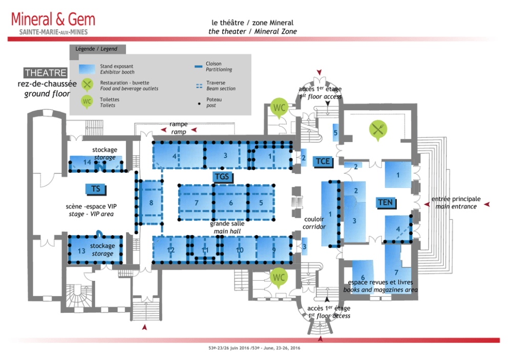 le théâtre / zone Mineral the theater / Mineral Zone Légende / Legend THEATRE rez-de-chaussée ground floor Cloison Partitioning Stand exposant Exhibitor booth Restauration - buvette Food and beverage outlets Traverse Beam section Toilettes Toilets Poteau post accès 1er étage 1st floor access rampe ramp stockage storage TCE TGS TS TEN scène -espace VIP stage - VIP area grande salle main hall couloir corridor stockage storage espace revues et livres books and magazines area accès 1er étage 1st floor access 53e-23/26 juin 2016 /53e - June, 23-26, 2016 entrée principale main entrance