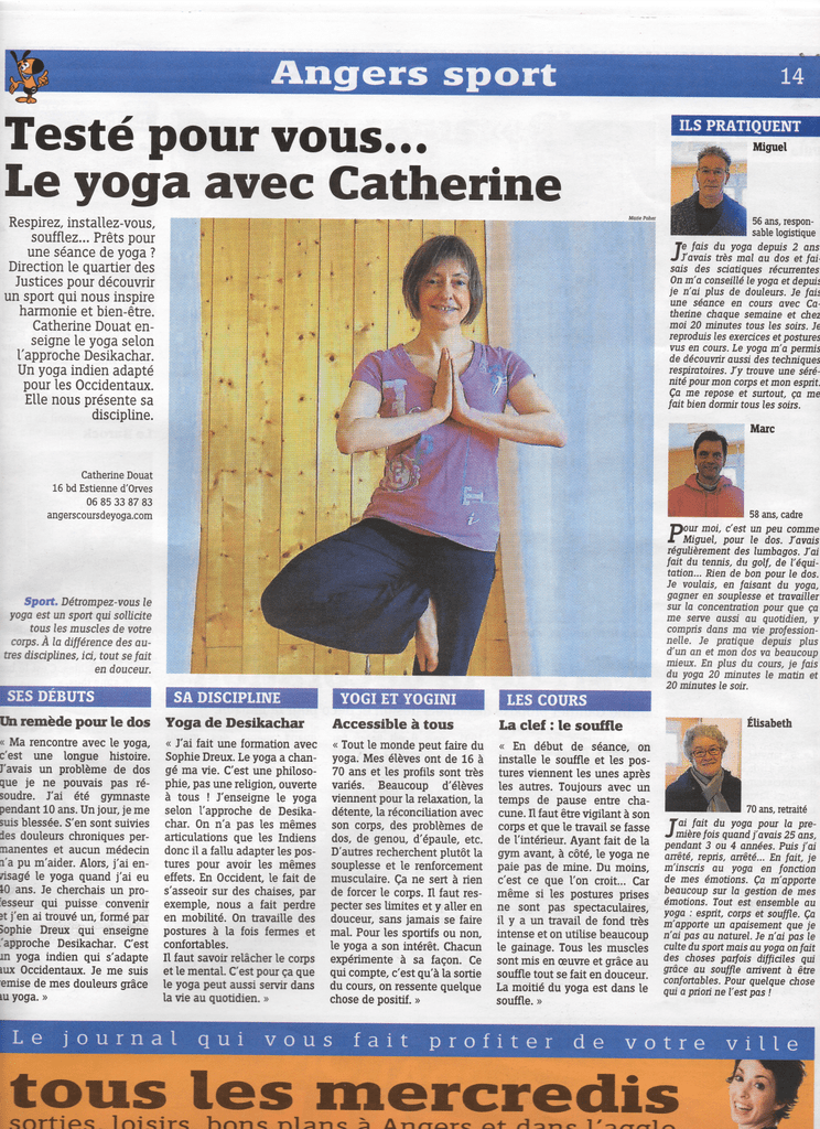 Angers sport 14 Testé pour vous... Le yoga avec Catherine ILS PRATIQUENT Miguel Respirez, installez-vous, soufflez... Prêts pour une séance de yoga ? Direction le quartier des Justices pour découvrir un sport qui nous inspire harmonie et bien-être. Catherine Douât enseigne le yoga selon l'approche Desikachar. Un yoga indien adapté pour les Occidentaux. Elle nous présente sa discipline. J 'e fais du yoga depuis 2 ans Tavais très mal au dos et faisais des sciatiques récunentes On m'a conseillé le yoga et depuis je n'ai plus de douleurs. Je fais une séance en cours avec Catherine chaque semaine et chez moi 20 minutes tous les soirs. Je reproduis les exercices et postures vus en cours. Le yoga m'a permis de découvrir aussi des techniques respiratoires. J'y trouve une sérénité pour mon corps et mon esprit Ça me repose et surtout, ça me fait bien dormir tous les soirs. Marc Catherine Douât 16 bd Estlenne d'Orves 06 85 33 87 83 angerscoursdeyoga.com P ' 58 ans, cadre our moi, c'est un peu comme Miguel, pour le dos. J'avais régulièrement des lumbagos. J'ai fait du tennis, du golf, de l'équitation... Rien de bon pour le dos Je voulais, en faisant du yoga gagner en souplesse et travailler sur la concentration pour que ça me serve aussi au quotidien, y compris dans ma vie professionnelle. Je pratique depuis plus d'un an et mon dos va beaucoup mieux. En plus du cours, je fais du yoga 20 minutes le matin et 20 minutes le soir. Sport, Détrompez-vous le yoga est un sport qui sollicite tous les muscles de votre corps. À la différence des autres disciplines, ici, tout se fait en douceur. SES DEBUTS SA DISCIPLINE YOGI ET YOGINI LES COURS ÉUsabeth Un remède pour le dos Yoga de Desikachar Accessible à tous La clef : le souffle « Ma rencontre avec le yoga, c'est une longue histoire, l'avais un problème de dos que je ne pouvais pas résoudre. J'ai été gymnaste pendant 10 ans. Un jour, je me suis blessée. S'en sont suivies des douleurs chroniques permanentes et aucun médecin l'a pu m'aider. Alors, j'ai en/Isagé le yoga quand j'ai eu 10 ans. Je cherchais un pro'esseur qui puisse convenir ît j'en ai trouvé un, formé par Sophie Dreux qui enseigne 'approche Desikachar. C'est m yoga indien qui s'adapte lux Occidentaux. Je me suis émise de mes douleurs grâce lu yoga. » « J'ai fait une formation avec Sophie Dreux. Le yoga a changé ma vie. C'est une philosophie, pas une religion, ouverte à tous ! J'enseigne le yoga selon l'approche de Desikachar. On n'a pas les mêmes articulations que les Indiens donc il a fallu adapter les postures pour avoir les mêmes effets. En Occident, le fait de s'asseoir sur des chaises, par exemple, nous a fait perdre en mobilité. On travaille des postures à la fois fermes et confortables. Il faut savoir relâcher le corps et le mental. C'est pour ça que le yoga peut aussi servir dans la vie au quotidien. » « Tout le monde peut faire du yoga. Mes élèves ont de 16 à 70 ans et les profils sont très variés. Beaucoup d'élèves viennent pour la relaxation, la détente, la réconciliation avec son corps, des problèmes de dos, de genou, d'épaule, etc. D'autres recherchent plutôt la souplesse et le renforcement musculaire. Ça ne sert à rien de forcer le corps. Il faut respecter ses limites et y aller en douceur, sans jamais se faire mal. Pour les sportifs ou non, le yoga a son intérêt. Chacun expérimente à sa façon. Ce qui compte, c'est qu'à la sortie du cours, on ressente quelque chose de positif. » « En début de séance, on installe le souffle et les postures viennent les unes après les autres. Toujours avec un temps de pause entre chacune. Il faut être vigilant à son corps et que le travail se fasse de l'intérieur. Ayant fait de la gym avant, à côté, le yoga ne paie pas de mine. Du moins, c'est ce que l'on croit... Car même si les postures prises ne sont pas spectaculaires, il y a un travail de fond très intense et on utilise beaucoup le gainage. Tous les muscles sont mis en œuvre et grâce au souffle tout se fait en douceur. La moitié du yoga est dans le souffle. » Le 56 ans, responsable logistique journal qui vous fait profiter de J 70 ans, retraité 'ai fait du yoga pour la première fois quand j'avais 25 ans pendant 3 ou 4 années. Puis j'ai arrêté, repris, anêté... En fait, je m'inscris au yoga en fonction de mes émotions. Ça m'apporte beaucoup sur la gestion de mes émotions. Tout est ensemble au yoga : esprit, corps et souffle. Ça m'apporte un apaisement que je n'ai pas au naturel. Je n'ai pas le culte du sport mais au yoga on fait des choses parfois difficiles qui grâce au souffle anivent à être confortables. Pour quelque chose qui a priori ne l'est pas ! votre ville