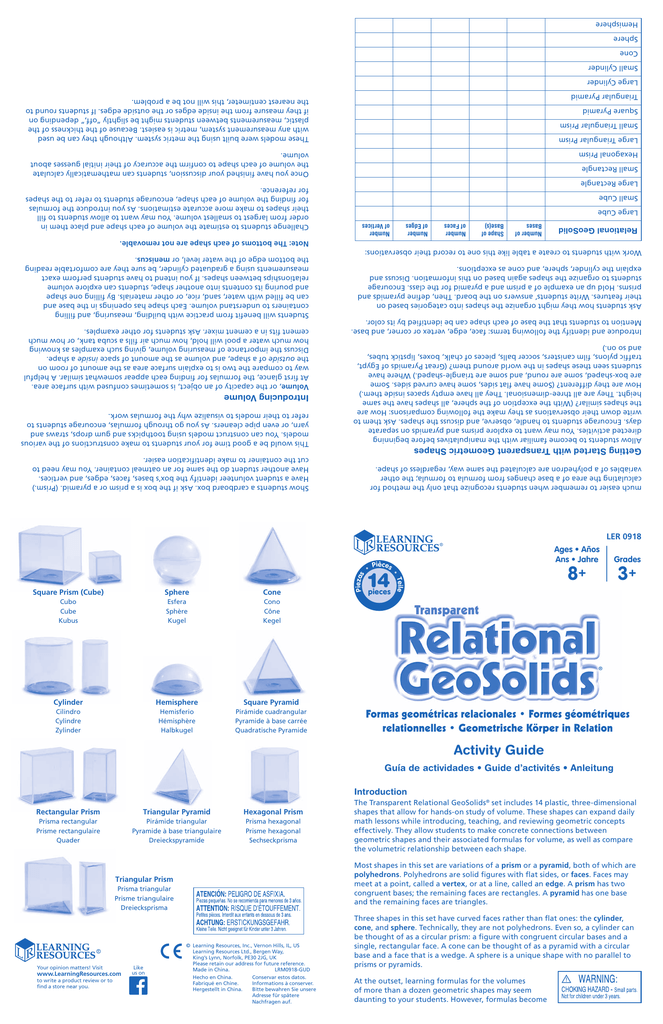 to write a product review or to find a store near you. www.LearningResources.com Your opinion matters! Visit Like us on © Learning Resources, Inc., Vernon Hills, IL, US Learning Resources Ltd., Bergen Way, King’s Lynn, Norfolk, PE30 2JG, UK Please retain our address for future reference. Made in China. LRM0918-GUD Hecho en China. Conservar estos datos. Fabriqué en Chine. Informations à conserver. Hergestellt in China. Bitte bewahren Sie unsere Adresse für spätere Nachfragen auf. Prisma triangular Prisme triangulaire Dreiecksprisma At the outset, learning formulas for the volumes of more than a dozen geometric shapes may seem daunting to your students. However, formulas become Three shapes in this set have curved faces rather than flat ones: the cylinder, cone, and sphere. Technically, they are not polyhedrons. Even so, a cylinder can be thought of as a circular prism: a figure with congruent circular bases and a single, rectangular face. A cone can be thought of as a pyramid with a circular base and a face that is a wedge. A sphere is a unique shape with no parallel to prisms or pyramids. Most shapes in this set are variations of a prism or a pyramid, both of which are polyhedrons. Polyhedrons are solid figures with flat sides, or faces. Faces may meet at a point, called a vertex , or at a line, called an edge. A prism has two congruent bases; the remaining faces are rectangles. A pyramid has one base and the remaining faces are triangles. Triangular Prism Rectangular Prism Triangular Pyramid Hexagonal Prism Prisma rectangular Prisme rectangulaire Quader Pirámide triangular Pyramide à base triangulaire Dreieckspyramide Prisma hexagonal Prisme hexagonal Sechseckprisma The Transparent Relational GeoSolids® set includes 14 plastic, three-dimensional shapes that allow for hands-on study of volume. These shapes can expand daily math lessons while introducing, teaching, and reviewing geometric concepts effectively. They allow students to make concrete connections between geometric shapes and their associated formulas for volume, as well as compare the volumetric relationship between each shape. Introduction Guía de actividades • Guide d’activités • Anleitung Activity Guide Cylinder Hemisphere Square Pyramid Cilindro Cylindre Zylinder Hemisferio Hémisphère Halbkugel Pirámide cuadrangular Pyramide à base carrée Quadratische Pyramide Formas geométricas relacionales • Formes géométriques relationnelles • Geometrische Körper in Relation Cono Cône Kegel Piezas Cone Esfera Sphère Kugel pieces 8+ • Sphere Cubo Cube Kubus Te i l e ® Square Prism (Cube) 14 • Pièces Ages • Años Ans • Jahre 3+ Grades LER 0918 This would be a good time for your students to make constructions of the various models. You can construct models using toothpicks and gum drops, straws and yarn, or even pipe cleaners. As you go through formulas, encourage students to refer to their models to visualize why the formulas work. Allow students to become familiar with the manipulatives before beginning directed activities. You may want to explore prisms and pyramids on separate days. Encourage students to handle, observe, and discuss the shapes. Ask them to write down their observations as they make the following comparisons: How are the shapes similar? (With the exception of the sphere, all shapes have the same height. They are all three-dimensional. They all have empty spaces inside them.) How are they different? (Some have flat sides, some have curved sides. Some are box-shaped, some are round, and some are triangle-shaped.) Where have students seen these shapes in the world around them? (Great Pyramids of Egypt, traffic pylons, film canisters, soccer balls, pieces of chalk, boxes, lipstick tubes, and so on.) Show students a cardboard box. Ask if the box is a prism or a pyramid. (Prism.) Have a student volunteer identify the box’s bases, faces, edges, and vertices. Have another student do the same for an oatmeal container. You may need to cut the container to make identification easier. much easier to remember when students recognize that only the method for calculating the area of a base changes from formula to formula; the other variables of a polyhedron are calculated the same way, regardless of shape. Getting Started with Transparent Geometric Shapes Introduce and identify the following terms: face, edge, vertex or corner, and base. Mention to students that the base of each shape can be identified by its color. Ask students how they might organize the shapes into categories based on their features. Write students’ answers on the board. Then, define pyramids and prisms. Hold up an example of a prism and a pyramid for the class. Encourage students to organize the shapes again based on this information. Discuss and explain the cylinder, sphere, and cone as exceptions. Work with students to create a table like this one to record their observations: Introducing Volume Volume, or the capacity of an object, is sometimes confused with surface area. At first glance, the formulas for finding each appear somewhat similar. A helpful way to compare the two is to explain surface area as the amount of room on the outside of a shape, and volume as the amount of space inside a shape. Discuss the importance of measuring volume, giving such examples as knowing how much water a pool will hold, how much air fills a scuba tank, or how much cement fits in a cement mixer. Ask students for other examples. Students will benefit from practice with building, measuring, and filling containers to understand volume. Each shape has openings in the base and can be filled with water, sand, rice, or other materials. By filling one shape and pouring its contents into another shape, students can explore volume relationships between shapes. If you intend to have students perform exact measurements using a graduated cylinder, be sure they are comfortable reading the bottom edge of the water level, or meniscus. Note: The b