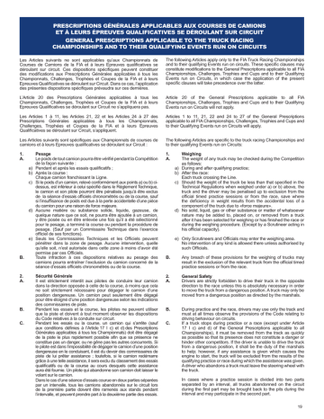PRESCRIPTIONS GÉNÉRALES APPLICABLES AUX COURSES DE CAMIONS ET À LEURS ÉPREUVES QUALIFICATIVES SE DÉROULANT SUR CIRCUIT GENERAL PRESCRIPTIONS APPLICABLE TO THE TRUCK RACING CHAMPIONSHIPS AND TO THEIR QUALIFYING EVENTS RUN ON CIRCUITS Les Articles suivants ne sont applicables qu’aux Championnats de Courses de Camions de la FIA et à leurs Epreuves qualificatives se déroulant sur circuit. Ces dispositions spécifiques peuvent constituer des modifications aux Prescriptions Générales applicables à tous les Championnats, Challenges, Trophées et Coupes de la FIA et à leurs Epreuves Qualificatives se déroulant sur Circuit. Dans ce cas, l’application des présentes dispositions spécifiques prévaudra sur ces dernières. The following Articles apply only to the FIA Truck Racing Championships and to their qualifying Events run on circuits. These specific clauses may constitute modifications to the General Prescriptions applicable to all FIA Championships, Challenges, Trophies and Cups and to their Qualifying Events run on Circuits, in which case the application of the present specific clauses will take precedence over the latter. L’Article 20 des Prescriptions Générales applicables à tous les Championnats, Challenges, Trophées et Coupes de la FIA et à leurs Epreuves Qualificatives se déroulant sur Circuit ne s’appliquera pas. Article 20 of the General Prescriptions applicable to all FIA Championships, Challenges, Trophies and Cups and to their Qualifying Events run on Circuits will not apply. Les Articles 1 à 11, les Articles 21, 22 et les Articles 24 à 27 des Prescriptions Générales applicables à tous les Championnats, Challenges, Trophées et Coupes de la FIA et à leurs Epreuves Qualificatives se déroulant sur Circuit, s’appliquent. Articles 1 to 11, 21, 22 and 24 to 27 of the General Prescriptions applicable to all FIA Championships, Challenges, Trophies and Cups and to their Qualifying Events run on Circuits will apply. Les Articles suivants sont spécifiques aux Championnats de courses de camions et à leurs Epreuves qualificatives se déroulant sur Circuit : The following Articles are specific to the truck racing Championships and to their qualifying Events run on Circuits: 1. A. 1.Weighing A. The weight of any truck may be checked during the Competition as follows: a) During and after qualifying practice; b) After the race: Each truck crossing the Line. c) Should the weight of the truck be less than that specified in the Technical Regulations when weighed under a) or b) above, the truck and the driver may be penalised up to exclusion from the official timed practice sessions or from the race, save where the deficiency in weight results from the accidental loss of a component of the truck due to «force majeure». d) No solid, liquid, gas or other substance or matter of whatsoever nature may be added to, placed on, or removed from a truck after it has been selected for weighing or has finished the race or during the weighing procedure. (Except by a Scrutineer acting in his official capacity). Pesage Le poids de tout camion pourra être vérifié pendant la Compétition de la façon suivante : a) Pendant et après les essais qualificatifs ; b) Après la course : Chaque camion franchissant la Ligne. c) Si le poids d’un camion, relevé conformément aux points a) ou b) cidessus, est inférieur à celui spécifié dans le Règlement Technique, le camion et son pilote pourront être pénalisés jusqu’à être exclus de la séance d’essais officiels chronométrés ou de la course, sauf si l’insuffisance de poids est due à la perte accidentelle d’une pièce du camion pour une raison de force majeure. d) Aucune matière ou substance solide, liquide, gazeuse, de quelque nature que ce soit, ne pourra être ajoutée à un camion, y être posée ou en être enlevée une fois qu’il a été sélectionné pour le pesage, a terminé la course ou pendant la procédure de pesage. (Sauf par un Commissaire Technique dans l’exercice officiel de ses fonctions). e) Seuls les Commissaires Techniques et les Officiels peuvent pénétrer dans la zone de pesage. Aucune intervention, quelle qu’elle soit, n’est autorisée dans cette zone à moins d’avoir été permise par ces Officiels. B. Toute infraction à ces dispositions relatives au pesage des camions pourra entraîner l’exclusion du camion concerné de la séance d’essais officiels chronométrés ou de la course. 2. A. B. C. Sécurité Générale Il est strictement interdit aux pilotes de conduire leur camion dans la direction opposée à celle de la course, à moins que cela ne soit strictement nécessaire pour dégager le camion d’une position dangereuse. Un camion peut seulement être dégagé pour être éloigné d’une position dangereuse selon les indications des commissaires de piste. Pendant les essais et la course, les pilotes ne peuvent utiliser que la piste et doivent à tout moment observer les dispositions du Code relatives à la conduite sur circuit. Pendant les essais ou la course, un camion qui s’arrête (sauf aux conditions définies à l’Article 17 I c) et d) des Prescriptions Générales applicables à tous les Championnats) doit être dégagé de la piste le plus rapidement possible afin que sa présence ne constitue pas un danger, ou ne gêne pas les autres concurrents. Si le pilote est dans l’impossibilité de dégager le camion d’une position dangereuse en le conduisant, il est du devoir des commissaires de piste de lui prêter assistance ; toutefois, si le camion redémarre grâce à une telle assistance, il sera exclu du classement des essais qualificatifs ou de la course au cours desquels cette assistance aura été fournie. Un pilote qui abandonne son camion doit laisser le volant sur le camion. Dans le cas d’une séance d’essais courue en deux parties séparées par un intervalle, tous les camions abandonnés sur le circuit lors de la première partie doivent êt