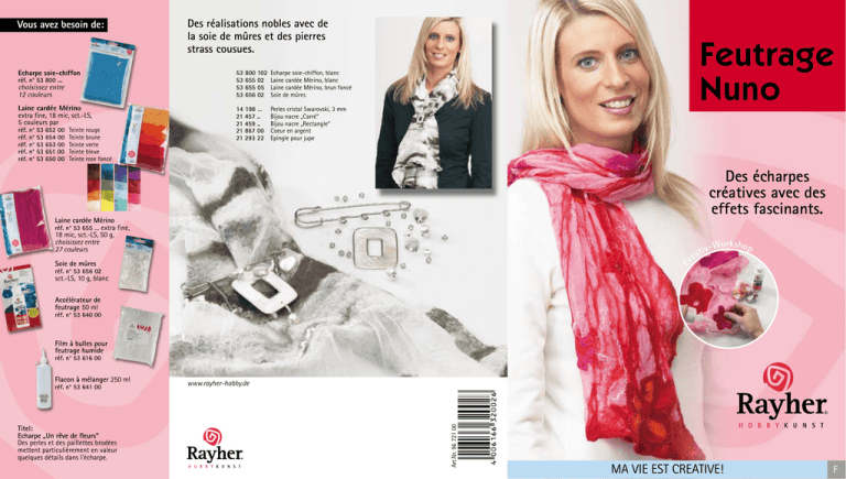 Vous avez besoin de: Echarpe soie-chiffon réf. n° 53 800 ... choisissez entre 12 couleurs Laine cardée Mérino extra fine, 18 mic, sct.-LS, 5 couleurs par réf. n° 53 652 00 réf. n° 53 654 00 réf. n° 53 653 00 réf. n° 53 651 00 réf. n° 53 650 00 Teinte rouge Teinte brune Teinte verte Teinte bleue Teinte rose foncé Laine cardée Mérino réf. n° 53 655 … extra fine, 18 mic, sct.-LS, 50 g, choisissez entre 27 couleurs réf. n° 53 656 02 14 198 … 21 457 .. 21 459 .. 21 867 00 21 293 22 Perles cristal Swarovski, 3 mm Bijou nacre „Carré“ Bijou nacre „Rectangle“ Coeur en argent Epingle pour jupe Des écharpes créatives avec des effets fascinants. C orkshop v-W i t a re sct.-LS, 10 g, blanc réf. n° 53 640 00 Film à bulles pour feutrage humide Accélérateur de feutrage 50 ml réf. n° 53 616 00 Flacon à mélanger 250 ml réf. n° 53 641 00 Titel: Echarpe „Un rêve de fleurs“ Des perles et des paillettes brodées mettent particulièrement en valeur quelques détails dans l’écharpe. www.rayher-hobby.de Art.Nr. 96 721 00 Feutrage Nuno 53 800 102 Echarpe soie-chiffon, blanc 53 655 02 Laine cardée Mérino, blanc 53 655 05 Laine cardée Mérino, brun foncé 53 656 02 Soie de mûres Soie de mûres Des réalisations nobles avec de la soie de mûres et des pierres strass cousues. MA VIE EST CREATIVE! F „Nuno est le mot japonais pour tissu. De la soie-chiffon très fine est feutrée avec de la laine Merino super-fine. Un accroche-regard individuel Réalisez vous même votre écharpe feutrée favorite. Faites votre choix dans notre grand assortiment de couleurs. Feutrage Nuno Des écharpes à la mode ayant un cachet personnel Feutrez sur de la soie-chiffon très fine avec Merino laine vierge super-fine. Par le rétrécissement de la laine Merino, l’écharpe en soie-chiffon se resserre et il en résulte des effets fascinants. Utilisez en plus de la soie de mûres, réf. n° 53 656 02 pour obtenir des détails brillants. Pour un feutrage rapide et simple, nous conseillons l’accélérateur de feutrage réf. n°53 640 00. Des accents colorés par les carreaux rectilignes. 53 800 210 53 652 00 Une écharpe pour beaucoup d’occasions. 53 800 404 53 655 07 53 655 65 53 656 02 Echarpe soie-chiffon, turquoise Laine cardée Mérino, turquoise Laine cardée Mérino, turquoise clair Soie de mûres Décorez à votre guise avec de multiples accessoires de notre programme. 14 176 … Pierres strass en verre 6,4 mm 14 175 … Pierres strass en verre 4 mm 14 178 … Pierres strass en verre, ovales pointues, 11 x 4 mm 14 309 Rocailles „Arktis“, 2,6 mm 14 064 … Rocailles, 2 mm Echarpe soie-chiffon, orange Laine cardée Mérino, teinte rouge Voici comment faire 1. Étaler le film à bulles, env. 20 cm de chaque côté plus long que l’écharpe. Les bulles toujours vers le haut, vers l’ouvrage à feutrer. 2. Poser l’écharpe et marquer quelques points aux coins et au grand côté avec un crayon feutre. 3. Enlever l’écharpe et la mettre de côté. La surface à feutrer est indiquée par point 2. 4. Poser le motif: d’abord partiel la soie de mûres, puis rangée par rangée, comme pour poser des tuiles mettre la laine Merino dessus. Etaler la soie de mûres en couches très fines et toujours la mettre en-dessous de la laine Merino (après ce sera la face externe), parce que seulement de cette façon la soie de mûre peut feutrer dans cette combinaison. La soie de mûre feutre peu avec l’écharpe en soie-chiffon! 5. Mettre prudemment l’écharpe dessus, travailler à deux. 6. Poser la gaze ou le tissu moustiquaire ou une feuille lisse au-dessus. 7. Remplir le flacon pour mélanger avec 250 ml d’eau chaude (accélère le processus de feutrage) et env. 10 gouttes d’accélérateur de feutrage, bien agiter et mouiller la première face recouverte, appuyer prudemment. 8. Très prudemment – sans pression! feutrer la laine Merino en faisant des mouvements giratoires, pour que les petits poils de laine glissent dans le tissu. 9. Enrouler un autre film à bulles et faire un “rouleau/noyau” puis enrouler l’écharpe sans serrer. 10. Fouler sans pression de l’intérieur vers l’extérieur et de l’extérieur vers l’intérieur bouger les mains et entretemps toujours rouler. Travailler l’écharpe enroulée de chaque côté en foulant, env. 5 min. de chaque côté. 11. Retourner l’écharpe et rouler et fouler à nouveau de chaque côté, env. 5 min. 12. Enrouler comme rouleau/noyau sans film à bulles et enrouler uniquement le film à bulles inférieur. 13. Augmenter la pression en foulant/roulant. 14. Plier l’écharpe en deux (mettre les deux faces de l’envers l’une contre l’autre) puis enrouler sur un film à bulles en sens longitudinal – fouler. 15. Mettre les faces avant de l’écharpe l’une contre l’autre, enrouler et fouler. Pas trop longtemps, pour que les faces avant ne feutrent pas ensemble. Ouvrir – regarder. 16. Enrouler l’écharpe de tous les côtés sans serrer et fouler encore une fois. 17. Laver l’écharpe avec prudence.