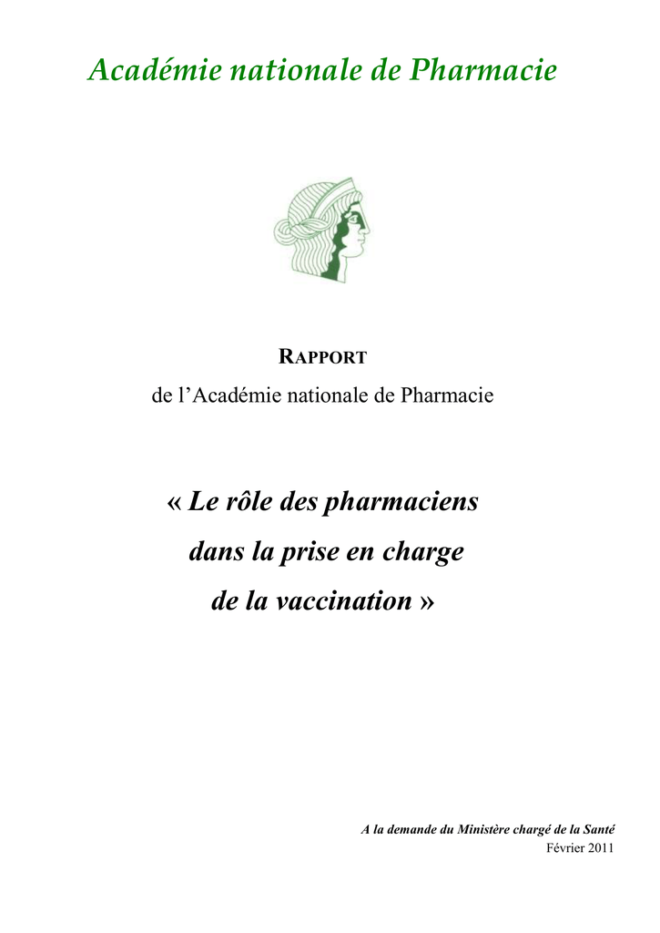Académie nationale de Pharmacie RAPPORT de l’Académie nationale de Pharmacie « Le rôle des pharmaciens dans la prise en charge de la vaccination » A la demande du Ministère chargé de la Santé Février 2011 Ce rapport est établi à la demande du Ministère chargé de la Santé Arrêté du 30 septembre 2010 AnP / Rapport / Rôle des Pharmaciens dans la prise en charge de la vaccination 1/25 RECOMMANDATIONS Dans le cas général d’une situation de routine de vaccination, l’Académie nationale de Pharmacie recommande : l’adoption par décret d’un texte autorisant la vaccination par le pharmacien en officine selon le protocole requis (produits et personnes, ordre des injections) à l’instar des personnels infirmiers ; la modification par décret des règles d’utilisation du DP permettant son extension fonctionnelle dans le sens de la gestion du calendrier vaccinal et du statut vaccinal ; l’automatisation des pré-requis pour une vaccination ou son rappel à partir de critères délivrés par la Carte Sesam Vitale® (âge) et/ou la Banque de Données Médicamenteuses (BDM) ; la certification des pharmaciens à l’acquisition du geste vaccinal ; l’utilisation du site CESPHARM pour mettre à la disposition des pharmaciens des protocoles adaptés à leur niveau d’intervention ainsi que des éléments de langage requis ; l’identification au sein de l’officine d’un pharmacien intégré dans les procédures qualité, « référent » en charge de l’information ; la formation continue périodique de mise à jour des connaissances sur la vaccination (calendrier vaccinal, nouveaux vaccins) ; la définition de la conformité des locaux, dans l’éventualité d’une administration du vaccin in situ par un pharmacien, et/ou un(e) infirmière. Dans le cas particulier d’une situation de crise impliquant une vaccination, l’Académie nationale de Pharmacie recommande : la vaccination préalable par des pharmaciens volontaires à l’instar de la réserve sanitaire ; la gestion des flux de personnes à vacciner en complémentarité avec les sites référencés (avec un focus sur les personnes difficilement déplaçables) ; la diffusion immédiate et générale des alertes et précautions dans les officines par la procédure centralisée d’alerte DP (sur l’ensemble du territoire ou par zone critique) ; le compte rendu de la couverture vaccinale effective avec cartographie de zone au profit des ARS ou de l’autorité compétente dans la gestion de crise sanitaire ; la gestion et relais des alertes nationales ou régionales (urgences DGS). Recommandations adoptées par l’Académie nationale de Pharmacie, lors de sa séance du 2 février 2011 AnP / Rapport / Rôle des Pharmaciens dans la prise en charge de la vaccination 2/25 SOMMAIRE PRÉAMBULE 1. OBJECTIF DU GROUPE DE TRAVAIL 2. MÉTHODE 2.1. Membres du groupe de travail 2.2. État des lieux et recherche documentaire 2.3. Experts audités par le groupe de travail 3. PANORAMA GÉNÉRAL 3.1. Bref rappel de l’état des lieux de la couverture vaccinale 3.2. Acteurs impliqués dans la vaccination 3.2.1. Médecins 3.2.2. Infirmier(e)s 3.2.3. Sages-femmes 3.3. Les pharmaciens d’officine 3.3.1. Une répartition géographique permettant de structurer les soins primaires 3.3.2. Une mission dynamique : de l’orientation du patient jusqu’à la pharmacovigilance 3.3.3. Un système d’information très performant au profit du patient et de la santé publique 4. PROBLÉMATIQUES VACCINALES RENCONTRÉES EN PHARMACIE 4.1. Problèmes liés à l’information du patient 4.1.1. Le passage d’une logique d’obligation à une logique de recommandation 4.1.2. La méconnaissance fréquente du calendrier vaccinal 4.1.3. L’ignorance fréquente du statut vaccinal 4.2. Problèmes liés aux comportements 4.2.1. L’inconscience de catégories de patients face au risque infectieux 4.2.2. L’inquiétude face à des sources d’information divergentes 4.2.3. Le doute à l’égard d’une logique d’apparence commerciale 4.2.4. La préférence de la liberté individuelle à l’immunité collective 4.3. Problèmes liés à l’acte de vaccination 4.3.1. La perception essentiellement médicalisée de la vaccination 4.3.2. La méconnaissance de la spécificité du vaccin et de sa logistique 4.3.3. La traçabilité des vaccins après délivrance (domicile mais aussi cabinet médical) 4.3.4. La sous-notification dans le système français de pharmacovigilance 4.3.5. L’inégalité du suivi et du rappel des vaccinations 4.4. Conclusion intermédiaire AnP / Rapport / Rôle des Pharmaciens dans la prise en charge de la vaccination 3/25 5. CONTRIBUTION POTENTIELLE DU PHARMACIEN À LA PRISE EN CHARGE VACCINALE 5.1. Pistes potentielles 5.1.1. Gestion par le pharmacien du carnet vaccinal grâce au Dossier pharmaceutique 5.1.2. Dispensation et administration tracées par le pharmacien, en officine * Sur prescription médicale * Sur initiative pharmaceutique 5.1.3. Dispensation pharmaceutique et administration infirmière tracée en pharmacie (situation de crise pandémique) 5.2. Avantages comparatifs 6. CONDITIONS D’IMPLICATION ÉVENTUELLE DU PHARMACIEN DANS LA PRISE EN CHARGE VACCINALE 6.1. Conditions tenant au cadre juridique de l’exercice 6.1.1. Vaccination et missions du pharmacien avant la loi HPST 6.1.2. Vaccination et missions du pharmacien issues de la loi HPST * La contribution obligatoire aux soins de premiers recours * L’offre de prestations favorisant le maintien de l’état de santé 6.1.3. La responsabilité du pharmacien liée à une éventuelle vaccination 6.2. Conditions tenant à la compétence professionnelle 6.2.1. Les formations initiales en vaccinologie des médecins et pharmaciens sont analogues 6.2.2. Les pharmaciens bénéficient d’une formation continue sur la vaccination 6.2.3. La vaccination (hors prescription) est une tâche aisément protocolisable 6.2.4. Les systèmes d’informations sont disponibles,