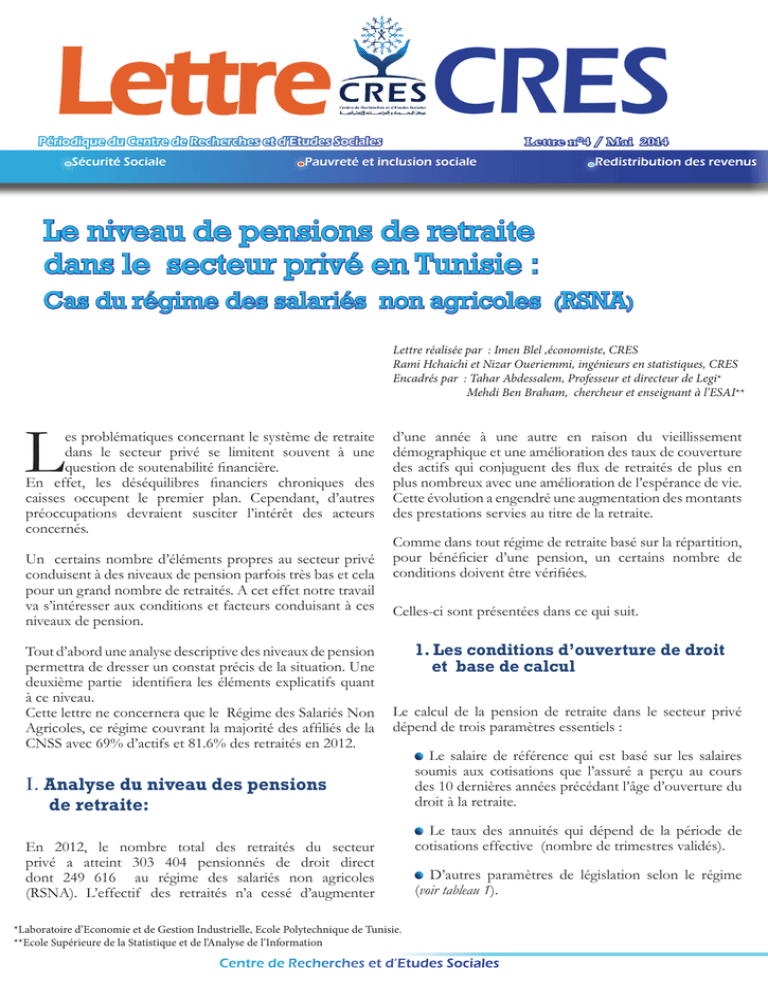 Lettre CRES Lettre n°4 / Mai 2014 Périodique du Centre de Recherches et d’Etudes Sociales Sécurité Sociale Pauvreté et inclusion sociale Redistribution des revenus Le niveau de pensions de retraite dans le secteur privé en Tunisie : Cas du régime des salariés non agricoles (RSNA) Lettre réalisée par : Imen Blel ,économiste, CRES Rami Hchaichi et Nizar Oueriemmi, ingénieurs en statistiques, CRES Encadrés par : Tahar Abdessalem, Professeur et directeur de Legi* Mehdi Ben Braham, chercheur et enseignant à l’ESAI** L es problématiques concernant le système de retraite dans le secteur privé se limitent souvent à une question de soutenabilité financière. En effet, les déséquilibres financiers chroniques des caisses occupent le premier plan. Cependant, d’autres préoccupations devraient susciter l’intérêt des acteurs concernés. Un certains nombre d’éléments propres au secteur privé conduisent à des niveaux de pension parfois très bas et cela pour un grand nombre de retraités. A cet effet notre travail va s’intéresser aux conditions et facteurs conduisant à ces niveaux de pension. Tout d’abord une analyse descriptive des niveaux de pension permettra de dresser un constat précis de la situation. Une deuxième partie identifiera les éléments explicatifs quant à ce niveau. Cette lettre ne concernera que le Régime des Salariés Non Agricoles, ce régime couvrant la majorité des affiliés de la CNSS avec 69% d’actifs et 81.6% des retraités en 2012. d’une année à une autre en raison du vieillissement démographique et une amélioration des taux de couverture des actifs qui conjuguent des flux de retraités de plus en plus nombreux avec une amélioration de l’espérance de vie. Cette évolution a engendré une augmentation des montants des prestations servies au titre de la retraite. Comme dans tout régime de retraite basé sur la répartition, pour bénéficier d’une pension, un certains nombre de conditions doivent être vérifiées. Celles-ci sont présentées dans ce qui suit. 1. Les conditions d’ouverture de droit et base de calcul Le calcul de la pension de retraite dans le secteur privé dépend de trois paramètres essentiels : I. Analyse du niveau des pensions de retraite: En 2012, le nombre total des retraités du secteur privé a atteint 303 404 pensionnés de droit direct dont 249 616 au régime des salariés non agricoles (RSNA). L’effectif des retraités n’a cessé d’augmenter Le salaire de référence qui est basé sur les salaires soumis aux cotisations que l’assuré a perçu au cours des 10 dernières années précédant l’âge d’ouverture du droit à la retraite. Le taux des annuités qui dépend de la période de cotisations effective (nombre de trimestres validés). D’autres paramètres de législation selon le régime (voir tableau 1). *Laboratoire d’Economie et de Gestion Industrielle, Ecole Polytechnique de Tunisie. **Ecole Supérieure de la Statistique et de l’Analyse de l’Information Centre de Recherches et d’Etudes Sociales Ainsi, selon ces paramètres, le montant minimum des pensions de retraite dans le secteur privé varie d’un régime à un autre comme le montre le tableau suivant : RSNA Rendement des annuités RSA 4% par an pour les 4% par an pour les 10 premières 10 premières années années majoré de 0.5% par majoré de 0.5% par trimestre avec un plafond de 80%. trimestre avec un plafond de 80%. Pension minimale Régime - 2/3SMIG si le stage >=120 mois -50% SMIG si le stage est compris entre 60 et 120 mois RSAA RTNS RTFR 4% par an pour les 10 premières années majoré de 0.5% par trimestre avec un plafond de 80%. 3% par an pour les 10 premières années majoré de 0.5% par trimestre avec un plafond de 80%. 3% par an pour les 10 premières années majoré de 0.5% par trimestre avec un plafond de 80%. 50% SMAG 30% SMIG/SMAG 30% SMIG /SMAG 40% SMAG Source : CRES Tableau n°1 : Paramètres législatifs de la pension à la CNSS 2. Etat des lieux des pensions de retraite N°4/Mai 2014 En effet, sur l’effectif total des retraités en 2012, on remarque que près de 25 379 assurés ont travaillé dans différents régimes de la CNSS et perçoivent une pension à part pour chaque régime. A itre d’exemple, un retraité perçoit une pension du régime RSNA s’élevent à 50 DT et perçoit également une pension du régime RINA à hauteur de 350 DT. Une partie de la faiblesse des pensions est à imputer à ce facteur de coordination. Il est donc essentiel d’analyser les statistiques des pensions perçues avec prudence étant donnée la complexité du sujet et la multitude des facteurs qui peuvent intervenir dans Cependant, et malgré la prise en compte des éléments tels par exemple la coordination, nous constatons que le niveau des pensions perçues dans le régime RSNA demeure relativement faible au regard de celui qui prévaut par exemple dans le secteur public. Graphe n°1 : Fréquence cumulée croissante des retraités par niveau de pension (2012) 1,0 0,9 SMIG 0,8 0,7 0,6 0,5 0,4 0,3 0,2 0,1 0,0 Lecture : 10% des retraités perçoivent une pension inférieure à 1/2 SMIG Ce constat nous a conduit à analyser plus en profondeur la distribution des pensions afin d’expliquer les raisons de leur faible niveau. Dans ce cadre, le graphe n°2 présente la distribution des retraités par niveau de pensions et par âge pour l’année 2012. 1. Article 45 du décret 74-499 du 27 avril 1974 relatif au régime de pension de vieillesse, d’invalidité et de survivants dans le secteur non agricole. Source : CRES Le graphe n°1 met également en évidence que 50% des retraités ont une pension inférieure à 241dt (valeur de la pension médiane). Cela peut résulter de carrière courte , de salaire de référence relativement bas, d’un nideau de SMIG relativement bas dans le passé mais également des effets de la coordination à savoir des retaités qui bénéficient d’une pension pr