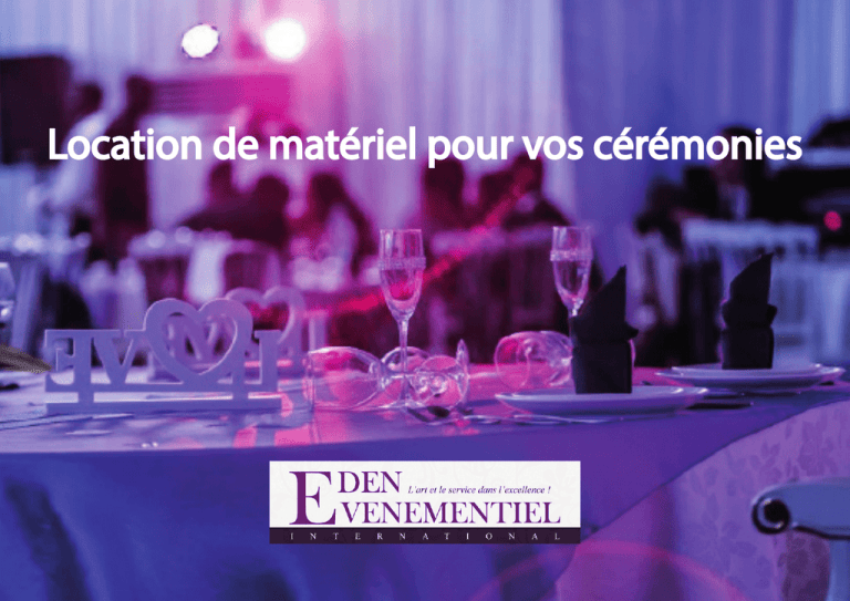 Location de matériel pour vos cérémonies Nos Linges Nappes de table de couleur Craquer pour la couleur avec des nappes de table de plusieurs teintes. 9,60 € TTC Nappes de tables blanches rectangulaires Habillez vos tables avec nos nappes qui pourront être personnalisées à souhait avec des accessoires tendances. 6,00 € TTC Nappes de tables blanches rondes Rien de mieux qu’une nappe blanche ronde pour habiller votre table. 8,00 € TTC Juponnage Le juponnage rajoutera à votre table une touche d’originalité et vous apporte l’esthétique et le confort dont vous aurez besoin. 21,60 € TTC Nos Linges Serviettes de tables blanches Des serviettes qui peuvent se décliner sous forme de pétale, d’orchidée, de lotus, etc. 0,66 € TTC Housses de chaises lycra Blanche Extensible, cette housse s’adapte à plusieurs types de chaise grâce à ses 4 encoches en spandex qui maintiennent efficacement les pieds de chaise. 1,80 € TTC ou 2€ TTC avec nœud de chaise offert (dans la limite des stocks) Serviettes de table de couleur Faites la différence avec des serviettes de tables colorées qui ne ressembleront à aucune autre. 0,96 € TTC Housses de chaises lycra turquoise Extensible, nous vous proposons également des housses de chaises en couleur. 2,00 € TTC Nos Linges Noeuds de chaises lycra Noeuds de chaises Le nœud de chaise en lycra est extensible, rapide à placer et à utiliser c’est un gagne temps combiné au design. organza Pour apporter une touche de transparence à vos chaises. 0,60 € TTC 0,96 € TTC Noeuds de chaises satin Rien de mieux pour apporter une touche de chic et de brillance à vos chaises. 0,72 € TTC Demandez la couleur de votre choix. Candy Bar: Confiez-nous la réalisation de votre décoration de salle et de tables, nous vous offrons un candy Bar pour vos invités ! c andy B Offert ! ar Quoi de plus convivial qu’un espace où vos invités pourrons profiter d’une douceur et échanger entre eux, pour que la fête soit encore plus belle ! Profitez-en dès maintenant, offre limitée. Nos Centres de Tables Vase martini Blanc 70cm Vase Cognac Pour un centre de table chic et raffiné, laissez-vous tenter par ces vases qui changent des vases transparents. Ce vase cognac apportera une originalité à votre table. Vous pourrez l’utiliser comme bougeoir en disposant une bougie cylindrique à l’intérieur. 11,00 € TTC 5,70 € TTC Vase martini Transparent 60cm - 70 cm Il peut s’accompagner de fleurs, de bougies flottantes, de plume. Faites votre choix. 9,00 € TTC Nos Centres de Tables Vase Cylindrique 45cm Vase coupe Vase pouvant contenir de belles décorations florales, des perles, des bougies et du sable afin de rajouter une touche tendance à votre salle. Optez pour un centre de table moins imposant, faites le choix du vase coupe. 7,00 € TTC 6,00 € TTC Boules de fleurs Parfait pour décorer vos tables ou encore vos haies pour un mariage laïque ou en église 9,00 € TTC Nos Centres de Tables Centre de table acrylique Chandeliers Sa forme légère se marie parfaitement avec un bouquet de fleur frais, de quoi apporter une touche de sensualité à votre table. Pour illuminer votre salle, un chandelier vous apportera une touche d’élégance nécessaire pour vos grandes occasions. 6,20 € TTC 10,80 € TTC Soliflore Pour apporter une touche de fraîcheur à votre décorationn optez pour un soliflore. 10,20 € TTC Agrémentez vos espaces avec : Colonnes Afin de mettre en valeur votre décoration en église ou pour un mariage laïque, optez pour nos colonnes afin de créer une haie majestueuse. 9,60 € TTC Tapis rouge Un tapis rouge pour vous permettre de faire sensation... Il est l’accessoire déco idéal pour un thème de mariage sur le cinéma ou autre et pourra également servir de tapis d’église flamboyant. 8m30 sur 2m : 40 € TTC 2m50 sur 2 m : 25 € TTC Eden Evenementiel I n t e r n a t i o n a l 49 Cours de la Marne 33 000 Bordeaux Tél : 09 81 20 63 91 / 06 29 80 78 25 Site internet : www.eden-evenementiel.fr Mail : [email protected] Rejoignez nous Autres matériels à louer : Tables, Chaises, Couverts, Bougeoirs, Arches, etc.
