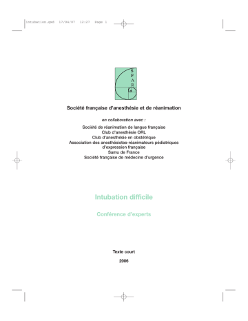 intubation.qxd 17/04/07 12:27 Page 1 Société française d’anesthésie et de réanimation en collaboration avec : Société de réanimation de langue française Club d’anesthésie ORL Club d’anesthésie en obstétrique Association des anesthésistes-réanimateurs pédiatriques d’expression française Samu de France Société française de médecine d’urgence Intubation difficile Conférence d’experts Texte court 2006 intubation.qxd 17/04/07 12:27 Page 2 Conférence d’experts - Sfar - 2006 • Président de la conférence d’experts Anne-Marie Cros (Bordeaux) • Experts Bruno Bally (Grenoble), Jean-Louis Bourgain (Villejuif), Jean Chastre (Paris), Xavier Combes (Créteil), Pierre Diemunsch (Strasbourg), Marc Fischler (Suresnes), Daniel Francon (Marseille), Yann Hervé (Bordeaux), Samir Jaber (Montpellier), Ollivier Laccourreye (Paris), Olivier Langeron (Paris), Annick Legras (Tours), François Lenfant (Dijon), Bruno Marciniak (Lille), Gilles Orliaguet (Paris), Didier Pean (Nantes), Patrick Ravussin (Sion), Martine Richard (Grenoble), François Sztark (Bordeaux). 2 intubation.qxd 17/04/07 12:27 Page 3 Conférence d’experts - Sfar - 2006 PRÉAMBULE Cette conférence d’experts est une réactualisation de la conférence d’experts organisée par la Société française d’anesthésie et de réanimation (Sfar) en 1996. Elle a été organisée et s’est déroulée conformément à la méthodologie développée par la Sfar. Le président de cette conférence a été désigné par le comité des référentiels et a constitué le groupe d’experts en collaboration avec ce comité. Les experts ont travaillé en sous groupes pour chaque question posée. Ils ont élaborés des recommandations après analyse et synthèse de la littérature médicale. Les références ont été analysées avec la grille de classement établie par le comité des référentiels. Les recommandations ont été discutées en séance plénière et validées par tous les experts soit à l’unanimité soit à la majorité des deux tiers. FORCE DES RECOMMANDATIONS Les lettres entre parenthèses représentent les niveaux de recommandations résultant de l’analyse de la littérature. • Grade A : deux études (ou plus…) de niveau I • Grade B : une étude de niveau I • Grade C : étude(s) de niveau II • Grade D : une étude (ou plus…) de niveau III • Grade E : études de niveau IV ou V Question 1 Quels sont les facteurs prédictifs de l’intubation difficile et de la ventilation au masque difficile ? Définition Une intubation est difficile si elle nécessite plus de deux laryngoscopies et/ou la mise en œuvre d’une technique alternative après optimisation de la position de la tête, avec ou sans manipulation laryngée externe. Une ventilation au masque est difficile : 1) s’il est impossible d’obtenir une ampliation thoracique suffisante ou un volume courant supérieur à l’espace mort (3 ml/kg), un tracé capnographique identifiable, de maintenir une SpO2 > 92 % ; 2) s’il est nécessaire d’utiliser l’oxygène rapide à plusieurs reprises, d’appeler un autre opérateur ; 3) si la pression d’insufflation est supérieure à 25 cmH2O Le dépistage de l’intubation difficile (ID) et de la ventilation au masque difficile (VMD) doit être systématique et documenté chaque fois qu’une intubation est prévue ou probable (consultation d’anesthésie, admission en réanimation). Dans les conditions d’urgence, le dépistage est plus difficile mais il doit être réalisé chaque fois que cela est possible. Critères prédictifs Critères prédictifs de la VMD L’âge supérieur à 55 ans, un index de masse corporelle (IMC) > 26 kg/m2, l’absence de dents, la limitation de la protusion mandibulaire, la présence d’un ronflement et d’une barbe ont été retrouvés comme facteurs prédictifs d’une VMD (grade C). La présence de deux de ces facteurs est prédictive d’une VMD. Le risque d’ID difficile est multiplié par 4 chez les patients ayant eu une VMD (grade D). 3 intubation.qxd 17/04/07 12:27 Page 4 Conférence d’experts - Sfar - 2006 Critères prédictifs d’une ventilation impossible Une distance thyromentonnière < 6 cm et la présence d’un ronflement sont des critères prédictifs d’une ventilation impossible (grade C). Critères prédictifs d’une ID Les critères suivants sont prédictifs d’une ID, il est recommandé de les rechercher : antécédents d’ID, classe de Mallampati > 2, distance thyromentonnière (DTM) < 6 cm et ouverture de bouche < 35 mm (grade C). Il est conseillé également de rechercher la mobilité mandibulaire (test de morsure de lèvre), mobilité du rachis cervical (angle fait par la tête en extension maximum sur le cou et en flexion maximum supérieur à 90°) (grade E). Certaines situations cliniques augmentent le risque d’ID : un IMC > 35 kg/m2, un syndrome d’apnées obstructives du sommeil (SAOS) avec tour de cou > 45,6 cm, une pathologie cervico-faciale (grade D) et un état prééclamptique (grade E). Chez l’enfant la classification de Mallampati n’est pas validée (grade E). Les critères prédictifs d’une ID sont une dysmorphie faciale, une DTM < 15 mm chez le nouveau-né, 25 mm chez le nourrisson et < 35 mm chez l’enfant de moins de 10 ans, une ouverture de bouche inférieure à trois travers de doigt de l’enfant et un ronflement nocturne avec ou sans SAOS (grade E). Critères prédictifs d’une ID dans le contexte de l’urgence Les critères recommandés doivent être recherchés dans la mesure du possible, mais ils sont mal adaptés au contexte de l’urgence. Certaines situations doivent alerter l’opérateur : un traumatisme cervico-facial (traumatisme du rachis, traumatisme facial), une pathologie ORL (cervico-faciale ou oropharyngolaryngée) et la présence de brûlures faciales (grade E). Question 2 Désaturation artérielle en oxygène et maintien de l’oxygénation pendant l’intubation