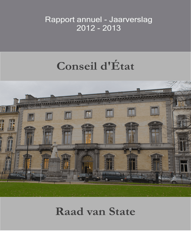 Rapport annuel - Jaarverslag 2012 - 2013 Conseil d'État Raad van State RAPPORT ANNUEL JAARVERSLAG SOMMAIRE KORTE INHOUD p. Introduction Inleiding 2 Chapitre Ier: Nouvelles règles concernant les compétences, l’organisation et le fonctionnement du Conseil d’État Hoofdstuk I: Chapitre II : Section de législation Hoofdstuk II: Chapitre III : Section du contentieux administratif Hoofdstuk III:Afdeling Bestuursrechtspraak 80 Chapitre IV :Auditorat Hoofdstuk IV :Auditoraat 188 Chapitre V : Bureau de coordination Hoofdstuk V:Coördinatiebureau 199 Chapitre VI : Greffe de la section du contentieux administratif Hoofdstuk VI : Griffie van de afdeling Bestuursrechtspraak 202 Chapitre VII : Service de la concordance des textes Hoofdstuk VII :Dienst Overeenstemming der teksten 207 Chapitre VIII :Service de l’informatique Hoofdstuk VIII : Dienst Informatica 212 Chapitre IX :Budget Hoofdstuk IX :Begroting 216 Chapitre X : Activités extérieures Hoofdstuk X : 224 Nieuwe regels betreffende de bevoegdheden, de organisatie en de werking van de Raad van State 6 Afdeling Wetgeving 11 Externe Activiteiten 1 Introduction au rapport annuel 2012-2013 Inleiding van het jaarverslag 2012-2013 De grandes réformes sont en cours et tout indique que les dispositions constitutionnelles et législatives qui en forment l’ossature seront adoptées au cours de la présente législature. La section de législation du Conseil d’État a participé de manière active à leur processus d’élaboration en donnant, en Assemblée générale, des avis sur cet impressionnant corpus législatif. Er zijn belangrijke hervormingen in gang gezet en alles wijst erop dat de grondwettelijke en wettelijke bepalingen die er de ruggengraat van vormen, in de loop van deze legislatuur zullen worden aangenomen. De afdeling Wetgeving van de Raad van State heeft actief deelgenomen aan de uitwerking ervan door in algemene vergadering adviezen te verstrekken over dit indrukwekkende wetgevingscorpus. La réforme une fois achevée, le Conseil d’État verra ses attributions profondément modifiées. La fédéralisation plus poussée aura pour effet inéluctable d’accroître le nombre des demandes d’avis dans les nombreuses matières transférées et donc d’alourdir la tâche de la section de législation. Eens de hervorming zal zijn afgerond, zullen de bevoegdheden van de Raad van State grondig zijn gewijzigd. De verder doorgedreven federalisering zal onvermijdelijk leiden tot een toename van het aantal adviesaanvragen in de talrijke overgehevelde aangelegenheden en dus de taak van de afdeling Wetgeving verzwaren. Par ailleurs, l’octroi à la section du contentieux administratif d’une compétence nouvelle au contentieux de l’indemnité – désormais la partie qui a triomphé dans son recours en annulation pourra, dans le prolongement de celle-ci, demander au juge administratif une indemnité réparatrice – et l’élargissement de la panoplie d’instruments dont le Conseil d’État disposera en vue d’atténuer les conséquences excessivement dommageables et, par suite, indésirables de certains arrêts d’annulation, et de prononcer des arrêts mettent une fois pour toutes définitivement fin au litige, confronteront cette section à de nouveaux défis qu’elle entend bien relever avec succès. Voorts zullen de toekenning aan de afdeling Bestuursrechtspraak van een nieuwe bevoegdheid inzake vorderingen tot schadevergoeding - voortaan zal de partij die de nietigverklaring heeft verkregen, in het verlengde hiervan, de bestuursrechter om een herstelvergoeding kunnen verzoeken - en de uitbreiding van het hele gamma instrumenten waarover de Raad van State zal beschikken om de buitengewoon schadelijke en bijgevolg ongewenste gevolgen van bepaalde vernietigingsarresten in te perken en arresten uit te spreken die het geschil eens en voor altijd beslechten, de afdeling Bestuursrechtspraak voor nieuwe uitdagingen plaatsen waaraan ze met succes het hoofd wil bieden. Conscient de l’ampleur de la tâche à accomplir, le législateur a d’ailleurs prévu en cette période Zich bewust van de omvang van de te volbrengen taak, is de wetgever overigens voornemens om 2 de crise que le Conseil d’État pourra, à cette fin, à tout le moins conserver le nombre de magistrats et de greffiers dont il dispose actuellement ce qui implique la mise à disposition de crédits nécessaires. in deze crisisperiode op zijn minst het huidige aantal magistraten en griffiers van de Raad van State te behouden met als gevolg de ter beschikkingstelling van de Raad van de nodige kredieten. Entre-temps, le Conseil d’État a, tout au long de l’année 2012-2013, poursuivi, comme à l’accoutumée, ses activités. La section de législation, en sus de sa participation active aux réformes en cours, a été saisie d’un nombre de demandes d’avis en nette augmentation par rapport à l’année 2011-2012 et, corrélativement, a donné un nombre d’avis sensiblement plus élevé et ce, à effectifs pratiquement constants, ce qui constitue une prouesse. Intussen heeft de Raad van State tijdens het jaar 2012-2013 zijn activiteiten naar gewoonte voortgezet. De afdeling Wetgeving heeft niet alleen actief deelgenomen aan de aan de gang zijnde hervormingen, maar heeft ook te maken gehad met een, in vergelijking met het jaar 2011-2012, sterk toegenomen aantal adviesaanvragen en heeft, daarmee samenhangend, met een nagenoeg onveranderd personeelsbestand aanzienlijk meer adviezen verstrekt, wat een hele krachttoer is. De son côté, la section du contentieux administratif n’est pas restée inactive, loin s’en faut, même s’il faut constater un léger tassement quant au nombre d’arrêts finaux prononcés et au stock d’affaires pendantes. Les raisons en sont données tant au niveau des chambres qu’à celui de l’Auditorat. De afdeling Bestuursrechtspraak heeft van haar kant absoluut niet stilgezeten, ook al moet een lichte daling van het aantal 
