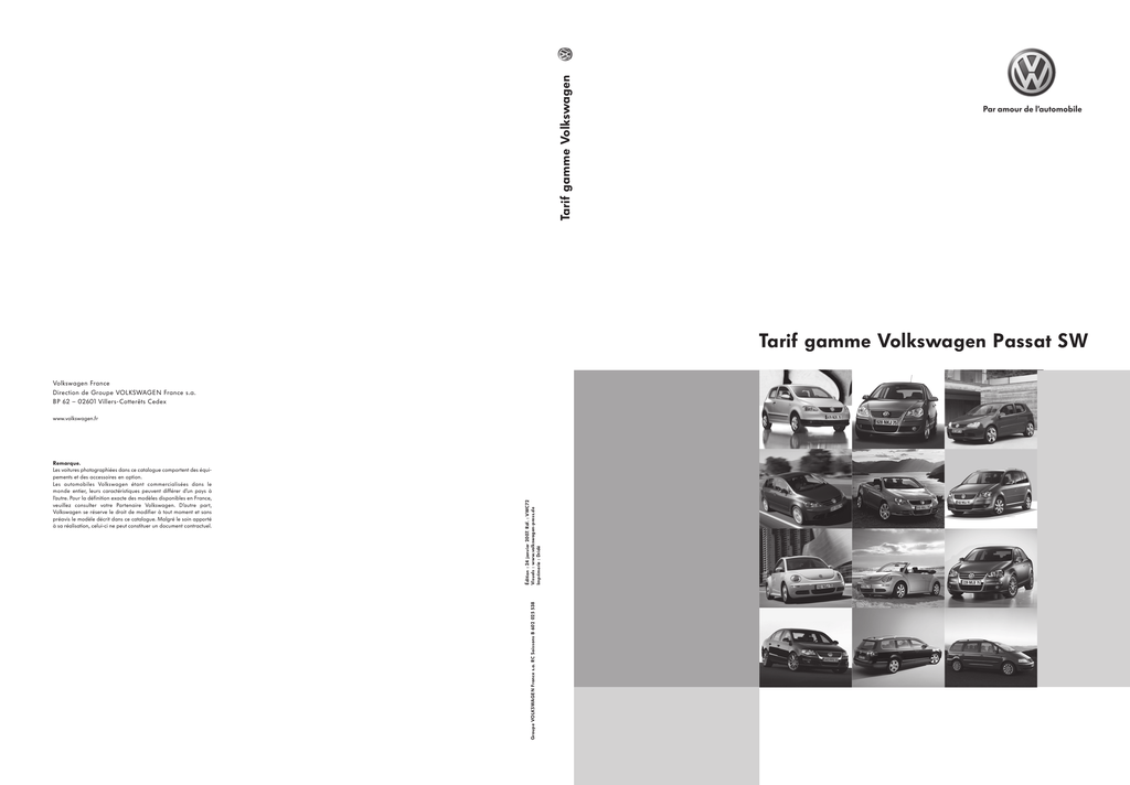 Tarif gamme Volkswagen Tarif gamme Volkswagen Passat SW Volkswagen France Direction de Groupe VOLKSWAGEN France s.a. BP 62 – 02601 Villers-Cotterêts Cedex Groupe VOLKSWAGEN France s.a. RC Soissons B 602 025 538 Remarque. Les voitures photographiées dans ce catalogue comportent des équipements et des accessoires en option. Les automobiles Volkswagen étant commercialisées dans le monde entier, leurs caractéristiques peuvent différer d’un pays à l’autre. Pour la définition exacte des modèles disponibles en France, veuillez consulter votre Partenaire Volkswagen. D’autre part, Volkswagen se réserve le droit de modifier à tout moment et sans préavis le modèle décrit dans ce catalogue. Malgré le soin apporté à sa réalisation, celui-ci ne peut constituer un document contractuel. Édition : 24 janvier 2007. Réf. : VWC72 Visuels : www.volkswagen-press.de Imprimerie : Dridé www.volkswagen.fr Passat SW Passat SW Caractéristiques techniques Dimensions VERSIONS 1.6 102 ch Dimensions extérieures Longueur / Largeur, mm Hauteur / Empattement, mm Voies avant / arrière, mm Diamètre de braquage, m Dimensions extérieures pour le garage Longueur avec attelage, mm Hauteur capot ouvert / Hauteur coffre ouvert, mm Largeur portières ouvertes avant / arrière, mm Largeur milieu véhicule et rétroviseurs gauche/droit, mm Dimensions intérieures Portières avant, largeur / hauteur, mm Portières arrière, largeur / hauteur, mm Hauteur sous pavillon, avant / arrière, mm 5) Distance min./max. dossier avant-pédales, mm Distance dossier arrière-pédales, mm Largeur aux coudes avant / arrière, mm Coffre Longueur banquette relevée/rabattue, mm Largeur maximale, mm Largeur entre les passages de roues, mm Hauteur / Hauteur sous pavillon, mm Volume banquette relevée/rabattue, l 6) Volume du réservoir, l 1.6 16S FSI 115 ch 2.0 16S FSI 150 ch 4 774 / 1 820 1517 7) / 2709 7) 1 552 / 1 551 7) env. 11,4 7) 4 774 / 1 820 1517 7) / 2709 7) 1 552 / 1 551 7) env. 11,4 7) 4 774 / 1 820 1517 7) / 2709 7) 1 552 / 1 551 7) env. 11,4 7) 4 870 1 826 7) / 2 058 7) 3 723 / 3 462 1 002 / 989 4 870 1 826 7) / 2 058 7) 3 723 / 3 462 1 002 / 989 4 870 1 826 7) / 2 058 7) 3 723 / 3 462 1 002 / 989 899 / 1 292 759 / 1 320 970 (952) / 980 (980) 5) 725 - 1 038 1 797 1 466 / 1 511 899 / 1 292 759 / 1 320 970 (952) / 980 (980) 5) 725 - 1 038 1 797 1 466 / 1 511 899 / 1 292 759 / 1 320 970 (952) / 980 (980) 5) 725 - 1 038 1 797 1 466 / 1 511 1 132 / 1 956 (2 903) 9) 1 428 1 000 463 - 522 / 831 603 / 1 731 8) env. 70 1 132 / 1 956 (2 903) 9) 1 428 1 000 463 - 522 / 831 603 / 1 731 8) env. 70 1 132 / 1 956 (2 903) 9) 1 428 1 000 463 - 522 / 831 603 / 1 731 8) env. 70 5) Valeur entre parenthèses : avec toît ouvrant en option. 6) Mesuré suivant ISO 3832 à l'aide de parallélépipèdes de 200x100x50 mm. 7) Mesuré sans conducteur avec 90% du plein de carburant. Le poids à vide effectif et par conséquent la charge utile varient dans cette fourchette suivant l'équipement (de série ou en option). 8) Cette mesure inclut les 90 litres de l'espace de chargement de la roue de secours. 9) Avec siège passager avant rabattable (de série sur Confort et disponible en option sur Trend). 1 Caractéristiques techniques (suite) Dimensions VERSIONS 2.0 16S FSI TURBO 200 ch Dimensions extérieures Longueur / Largeur, mm Hauteur / Empattement, mm Voies avant / arrière, mm Diamètre de braquage, m Dimensions extérieures pour le garage Longueur avec attelage, mm Hauteur capot ouvert / Hauteur coffre ouvert, mm Largeur portières ouvertes avant / arrière, mm Largeur milieu véhicule et rétroviseurs gauche/droit, mm Dimensions intérieures Portières avant, largeur / hauteur, mm Portières arrière, largeur / hauteur, mm Hauteur sous pavillon, avant / arrière, mm 5) Distance min./max. dossier avant-pédales, mm Distance dossier arrière-pédales, mm Largeur aux coudes avant / arrière, mm Coffre Longueur banquette relevée/rabattue, mm Largeur maximale, mm Largeur entre les passages de roues, mm Hauteur / Hauteur sous pavillon, mm Volume banquette relevée/rabattue, l 6) Volume du réservoir, l 2.0 16S FSI 150 ch 4MOTION 3.2 V6 FSI 250 ch DSG 4MOTION 4 774 / 1 820 1517 7) / 2709 7) 1 552 / 1 551 7) env. 11,4 7) 4 774 / 1 820 1517 7) / 2709 7) 1 552 / 1 551 7) env. 11,4 7) 4 774 / 1 820 1517 7) / 2709 7) 1 552 / 1 551 7) env. 11,4 7) 4 870 1 826 7) / 2 058 7) 3 723 / 3 462 1 002 / 989 4 870 1 826 7) / 2 058 7) 3 723 / 3 462 1 002 / 989 4 870 1 826 7) / 2 058 7) 3 723 / 3 462 1 002 / 989 899 / 1 292 759 / 1 320 970 (952) / 980 (980) 5) 725 - 1 038 1 797 1 466 / 1 511 899 / 1 292 759 / 1 320 970 (952) / 980 (980) 5) 725 - 1 038 1 797 1 466 / 1 511 899 / 1 292 759 / 1 320 970 (952) / 980 (980) 5) 725 - 1 038 1 797 1 466 / 1 511 1 132 / 1 956 (2 903) 9) 1 428 1 000 463 - 522 / 831 603 / 1 731 8) env. 70 1 132 / 1 956 (2 903) 9) 1 428 1 000 463 - 522 / 831 588 / 1 716 8) env. 68 1 132 / 1 956 (2 903) 9) 1 428 1 000 463 - 522 / 831 588 / 1 716 8) env. 68 5) Valeur entre parenthèses : avec toît ouvrant en option. 6) Mesuré suivant ISO 3832 à l'aide de parallélépipèdes de 200x100x50 mm. 7) Mesuré sans conducteur avec 90% du plein de carburant. Le poids à vide effectif et par conséquent la charge utile varient dans cette fourchette suivant l'équipement (de série ou en option). 8) Cette mesure inclut les 90 litres de l'espace de chargement de la roue de secours. 9) Avec siège passager avant rabattable (de série sur Confort et disponible en option sur Trend). 2 Passat SW Caractéristiques techniques (suite) Dimensions VERSIONS Dimensions extérieures Longueur / Largeur, mm Hauteur / Empattement, mm Voies avant / arrière, mm Diamètre de braquage, m Dimensions extérieures pour le garage Longueur avec attelage, mm Hauteur capot ouvert / Hauteur coffre ouvert, mm Largeur portières ouvertes avant / arrière, mm Largeur milieu véhicule et rétroviseurs gauche/droit, mm Dimensions intérieures Portières avant, largeur / h