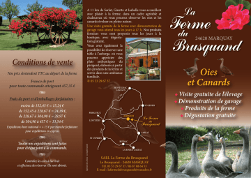 Conditions de vente Nos prix s’entendent TTC au départ de la ferme Franco de port pour toute commande atteignant 457,35 € A 11 km de Sarlat, Ginette et Isabelle vous accueillent avec plaisir à la ferme, dans un cadre agréable et chaleureux où vous pourrez observer les oies et les canards évoluer en pleine nature. Une visite gratuite de la ferme avec démonstration de gavage vous attend tous les jours à 17 h. Nos produits fermiers vous sont proposés tous les jours à la boutique, avec dégustation gratuite. Vous avez également la possibilité de réserver une table à l’auberge, où vous pourrez apprécier des plats authentiques du périgord, élaborés à partir des produits de la ferme et servis dans une ambiance familiale. ✆ 05 53 29 67 37 MONTIGNAC LASCAUX Frais de port et d’emballages forfaitaires : D D moins de 152,45 € = 15,24 € de 152,45 à 228,67 € = 24,39 € de 228,67 à 304,90 € = 28,97 € de 304,90 à 457 € = 33,54 € D 47 D 48 La Ferme du Brusquand SARLAT ST CYPRIEN BEYNAC Imprimerie de La Beune - La Chapelle Aubareil Contrôlez les colis à l’arrivée et effectuez des réserves s’ils sont abimés. ST GENIES 48 MARQUAY LES EYZIES D 6 PERIGUEUX Expéditions hors national = + 15 € par tranche forfaitaire pour expéditions en express Toutes nos expéditions sont faites pour chèque joint à la commande. 6 70 LA ROQUE GAGEAC SARL La Ferme du Brusquand Le Brusquand - 24620 MARQUAY Tél. 05 53 29 67 37 / 06 87 08 64 53 E-mail : [email protected] La Ferme du 24620 MARQUAY Brusquand Bon de commande Mlle / Mme / M. .............................................................................................................................. Tél. .................................................................................................................................................................... Adresse de livraison : ................................................................................................................................................................................ Magret frais 200 400 25,00 46,50 Aiguillettes (sachet de 10) 200 400 23,00 42,50 Foie gras mi-cuit (Sur commande uniquement) Foie entier Foie gras de canard entier au naturel, Servir frais découpé. Ingrédients : foie gras de canard, sel, poivre, sucre. Bloc de foie gras reconstitué Ingrédients : foie gras de canard, eau, sel, poivre, sucre, conservateur (sel nitrité). Pâté de foie Ingrédients : bloc de foie gras de canard (50%), (foie gras reconstitué), eau, viande (chair de porc), sel, poivre, œuf, conservateur (sel nitrité). Magret séché au poivre 22,30 370 7,50 Ingrédients : gésiers de canard (98%), graisse de canard, sel, poivre. 250 11,00 550 10,90 Cou farci Ingrédients : Ingrédients : porc, bloc de foie gras de canard (foie gras reconstitué, eau), peau de cou de canard (20%), graisse de canard, œuf, sel, poivre, sucre, conservateur (sel nitrité). 26,50 49,00 100 200 12,90 21,30 140 200 13,50 16,50 550 400 600 17,50 11,40 16,70 Ingrédients : gras et maigre d’oie (98%), sel, poivre. 370 7,50 Ingrédients : gésiers d’oie (98%), graisse d’oie, sel, poivre. 250 450 11,50 14,70 350 24,30 Foie gras d’oie au naturel, Servir frais découpé. Ingrédients : foie gras d’oie, sel, poivre, sucre. Ingrédients : foie gras d’oie, eau, sel, poivre, sucre, conservateur (sel nitrité). Pâté de foie Ingrédients : bloc de foie gras d’oie (50%), (foie gras reconstitué), eau, viande (chair de porc), sel, poivre, œuf, conservateur (sel nitrité). Produits Prix unit. Montant Confits Ingrédients : gras et maigre de canard (98%), sel, poivre. Ingrédients : viande de canard, graisse de canard, sel, poivre. 200 400 Bloc de foie gras reconstitué 15,70 12,50 10,70 16,20 19,30 Manchons 28,50 53,00 11,70 14,70 17,80 550 440 350 600 880 Gésiers confits 200 400 Foie gras mi-cuit 140 200 280 Confits Grillons (Rillettes) Prix du produit Foie entier (Suivant stock) La pièce - 1 aile + 1 cuisse - 2 cuisses - 1 aile - 2 ailes - 4 cuisses Poids net (g) 11,70 19,90 Magret au poivre fourré au foie gras Ingrédients : viande de canard, graisse de canard, sel, poivre. (Poids net égoutté). Oie Qté 7,00 (Sur commande uniquement et suivant stock) Le sachet 100 200 10,50 7,00 (Sur commande uniquement et suivant stock) La pièce (Sur commande uniquement) (Suivant stock) La pièce Cocher la case Oie Prix du produit Canard Poids net (g) 240 17,80 Ingrédients : viande d’oie, graisse d’oie, sel, poivre. (Poids net égoutté). - 2 magrets - 1 cuisse - 2 cuisses Grillons (Rillettes) Gésiers confits Cou farci à la Périgourdine Ingrédients : Ingrédients : porc, bloc de foie gras d’oie (foie gras reconstitué, eau), peau de cou d’oie (20%), graisse d’oie, œuf, sel, poivre, sucre, conservateur (sel nitrité). Tarif valable à partir du 1er mars 2015 Date .............................................................. Signature Conditions de vente au verso Tél. 05 53 29 67 37 / 06 87 08 64 53 ✂ Canard ............................................................................................................... E-mail : [email protected]