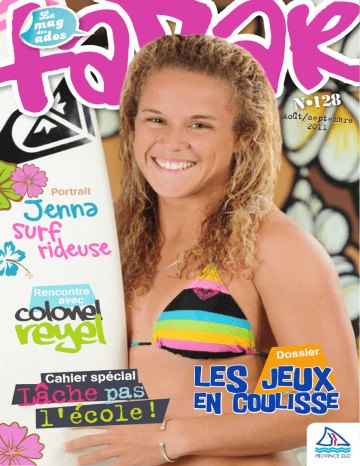 Le ag m des ados N •128 Août/septembre 2011 Portrait nna e J surf use ride le Rencontre avec Colonel Reyel Dossier Les Jeux Cahier spécial Lâche plaes ! en coulisse l'éco 1 PUBLICITÉ SOMMAIRE 12 3 Édito À vous de jouer ! 6 Sélection cinéma 10 Agenda 12 Dossier Si y a pas eux, y a pas d’Jeux ! 18 Actu des bahuts Escoffier cuisine les Jeux 20 News Jeux vidéo 22 News Lecture et musique 25 News web 26 Rencontre Steeve au rapport ! 30 Portrait Jenna, surf rideuse 33 Cahier spécial Lâche pas l’école ! 40 À suivre La faute à Voltaire 42 Insolite 44 Écolo-vie Ils ont la bosse des baleines 48 Santé Les gestes qui sauvent 52 Ma mode 56 News people 58 Jeux / BD 52 26 Le N •128 [email protected] Août/septembre 2011 mag des ados Tazar - BP L1 - 98849 Nouméa Cedex • Tél. 25 81 22 - Édité à 25 000 exemplaires par la province Sud Directeur de la publication : Frédéric Garcia • Directeur de la rédaction : Jérôme Pourtau Conception : Rezo • Publicité : Rezo, tél. 28 63 01, courriel : [email protected] Impression : Artypo - Distribution : Totem - ISSN : 1298-9095 • Dépôt légal : CP 1885/98-L1 du 17/09/98 3 Édito Par A.G. e d s u o v À À vous de Six semaines après son lancement, il est temps de faire un point sur une Carte Jeunes qui a démarré sur les chapeaux de roue. Démarrage à donf’ Les premières inscriptions ont eu lieu le 7 juillet lors du Jeudi des Jeunes et la Carte Jeunes est très vite devenue populaire. Réclamée sur tous les fronts : sur le site jeunes.nc, ainsi qu’au tout nouveau spot Carte Jeunes qui a ouvert mi-juillet, la Carte, victime de son succès, a connu quelques « bugs » de démarrage dus à une très forte demande en peu de temps et à la mise en route du tout nouveau système informatique créé pour l’occasion. Rien de grave, juste quelques erreurs de jeunesse, maintenant oubliées, puisque les premières cartes sont sorties début août avec succès. Voilà pour les explications que l’on te doit, à toi qui as fait ta demande d’adhésion en ligne et qui es impatient d’obtenir ta carte « en vrai ». Le temps de résorber le retard accumulé dans le traitement des inscriptions et tout rentrera dans l’ordre. Tous les atouts Reste que la Carte Jeunes n’est pas qu’une simple carte donnant droit à des réductions, elle a bien d’autres atouts, qui se mettront en place dans les prochaines semaines. N’oublie pas que tu pourras bientôt choisir de la faire évoluer en carte bancaire ! Grâce au partenariat exclusif qui lie la Carte Jeunes à la BCI, tu pourras en effet t’en servir comme une carte de retrait ou de paiement. Ce qui fait aussi l’intérêt et l’originalité de cette carte - dont on peut même dire qu’elle est unique en son genre -, c’est son volet « actions citoyennes ». Il faut avoir encore un peu de patience à ce propos, car certains aspects juridiques sont assez compliqués à mettre en place et nécessitent quelques « retouches », mais encore une fois, ce n’est qu’une question de temps. Enrichir son expérience Des associations œuvrant pour aider les personnes âgées (ACAPA) ou soutenir les personnes souffrant de déficiences ou de handicaps, comme l’ASEAD, l’APEI, l’ACH, ou bien encore des associations luttant pour préserver l’environnement ou sauvegarder notre patrimoine, comme Mocamana et Témoignage d’un passé, se sont déjà ralliées Près de 500 jeu ne Carte Jeunes, lor s de 12 à 26 ans se sont ins crits au stand de s du Jeudi des Jeunes. la 4 !r r e u o j de joue ! au principe des « actions citoyennes » de la Carte Jeunes. Bientôt, en offrant un peu de ton temps à l’une d’entre elles, tu pourras être « récompensé » sous forme de bons cadeaux citoyens. C’est déjà intéressant, mais c’est sans compter la satisfaction personnelle de t’investir pour la collectivité. Retour sur un Jeudi jeune L’affluence au Jeudi des Jeunes, et notamment sur le stand de la Carte Jeunes, a démontré - s’il en était besoin - à quel point il était nécessaire de leur proposer enfin de vrais choix, de vrais avantages, de vraies réductions, de vrais bons plans pour leur rendre la vie plus facile. Bien sûr, il reste beaucoup de chemin à parcourir, mais la machine est amorcée et c’est un très bon début. Sache que plus vous serez nombreux à avoir votre Carte, plus vous vous en servirez pour obtenir de meilleurs prix dans les magasins partenaires, plus ces partenaires seront enclins à vous proposer des remises encore meilleures et plus ils seront nombreux à devenir partenaires de la Carte Jeunes. Hé oui, c’est ainsi que la roue tourne… Le clou de la soirée : Zic Clip en a profité pour se transformer en Zic Live et enregistrer une émission dans les condit Kiosque à musique. 3 groupes aussi différe ions du direct au nts sont succédé : Kydam, Yellow Press Toy (ici que talentueux se sur la photo) et Soul Sindicate. De la musique d’ici, présentée par Janice. La carte Étudiant, pas besoin de la demander, elle est gratuite et tu l’as d’office… mais tu dois être étudiant post bac ! Maintenant, grâce à l’opération Offr’étudiant, tu pourras obtenir des remises chez certaines enseignes du Syndicat des commerçants, sur simple présentation de ta Carte. Finalement, le mieux c’est d’avoir toutes les cartes en main ! Tu n’as pas eu la chance d’arriver parmi les 100 premiers qui se sont précipités pour obtenir leur carte gratuitement, offerte par le Tazar, lors du Jeudi du Centre-Ville ? Allez, ton magazine préféré remet ça et te propose une session de rattrapage ! T’as pas encore ta carte ? Alors cours à la Foire ! Carte Jeunes ou Étudiant ? Les deux, mon capitaine ! Pourquoi se priver ? C’est simple, que tu sois scolarisé, ou pas, que tu travailles, ou pas, quel que soit ton profil, juste parce que tu résides en province Sud et que tu as entre 12 et 26 ans, tu as droit à ta Carte Jeunes. Tu dois s